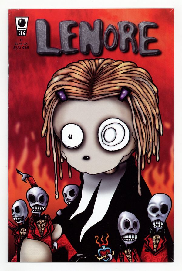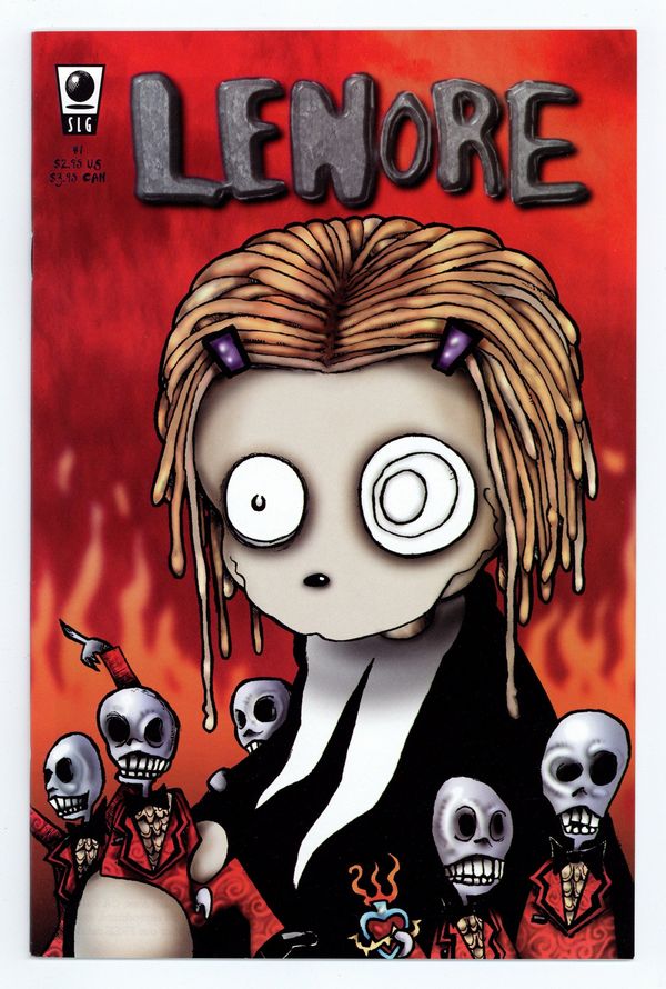 Published Feb 1998 by SLG Publishing.$30.00Stories, art and cover by Roman Dirge. Another trend-setting goth series from Slave Labor Graphics, about the adventures of a little dead girl. Lenore meets a visually-impaired mouse and a paraplegic cannibal. Babysitting; The Grandiose Adventures of Timmy the Happy Friendly Seeing Impaired Mouse; Tik Toc, The Monster from the Clock; Soilent Green; Its Magic; Hairball; Childhood Memories; Itsy Bitsy Spider. 24 pages, B&W. Mature readers. Cover price $2.95.