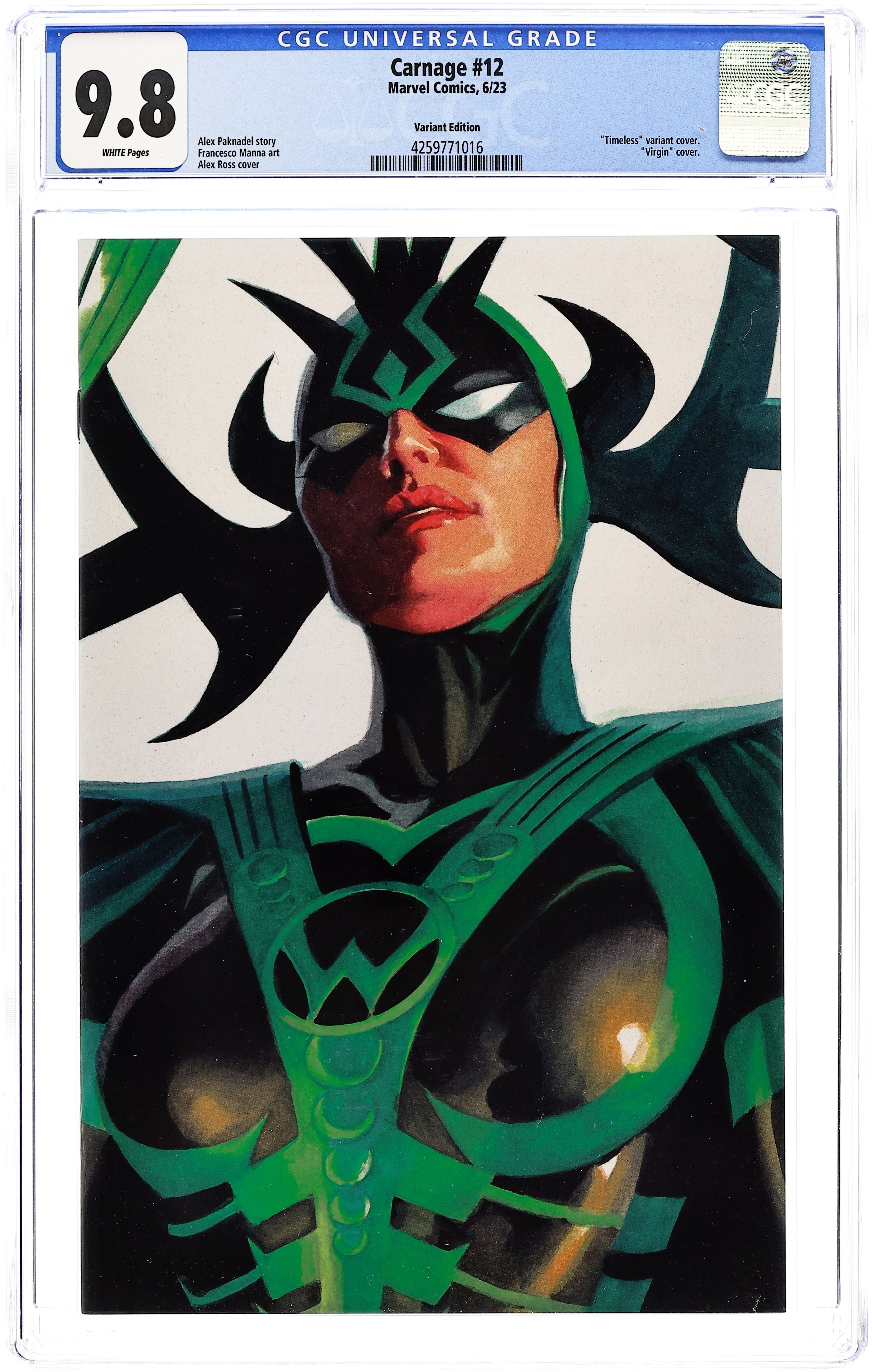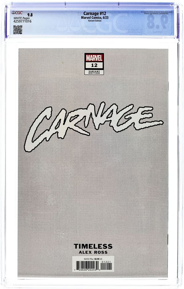 Written by Alex Paknadel. Art by Francesco Manna. Cover by Alex Ross. CLETUS KASADY IS BACK IN A BLOODY NEW VISION OF CARNAGE! Spurned by its longtime host, the Carnage symbiote has undertaken a quest to push the boundaries of itself and its understanding further than ever before. But as seen in the visceral pages of CARNAGE #10, CLETUS KASADY himself hasnt been sitting idly by either. Bound to an all-new type of symbiote, the EXTREMBIOTE, Cletus has a whole new array of deadly abilities – that hes eager to put to a bloody and brutal test! 28 pages, full color. Rated T+ Cover price $3.99.