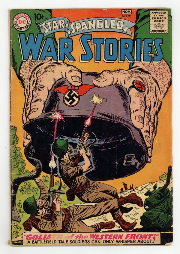 Cover pencils by Ross Andru, inks by Mike Esposito. Goliath of the Western Front featuring War That Time Forgot, script by Bob Haney, pencils by Ross Andru, inks by Mike Esposito. The Bridge That Couldn't Be Bombed, script by Hank Chapman, art by Mort Drucker. Desert Mosquito, script by Bob Haney, art by Jack Abel. I Am Ready, script and pencils by Morris Waldinger, inks by Tom Nicolisi. Army Slang filler half-page, script and pencils by Morris Waldinger, inks by Tom Nicolisi. 36 Pages, Full Color. Cover price $0.10.