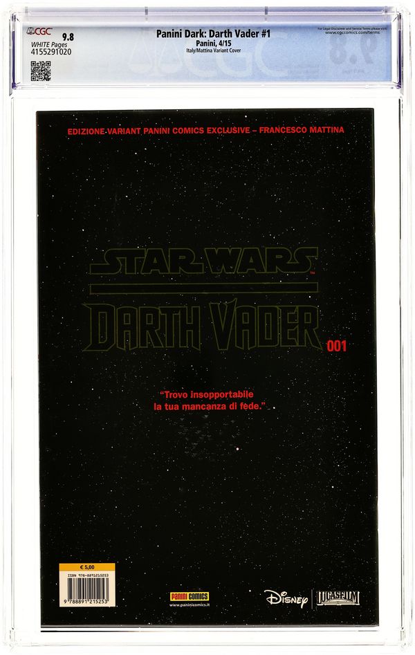 Italian Language Edition - Variant Cover by Francesco Mattina. Written by Kieron Gillen. Art by Salvador Larroca. The original Dark Lord of the Sith stars in his first ongoing series! Ever since Darth Vader made his first on-screen appearance, he became the one of the most popular villains to ever haunt an audience's dreams! Now, follow Vader straight from the ending of A NEW HOPE (and the pages of the new STAR WARS comic book) into his own series, showing the Empire's war with the Rebel Alliance from the other side! 44 pages, full color. Rated T