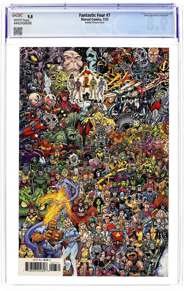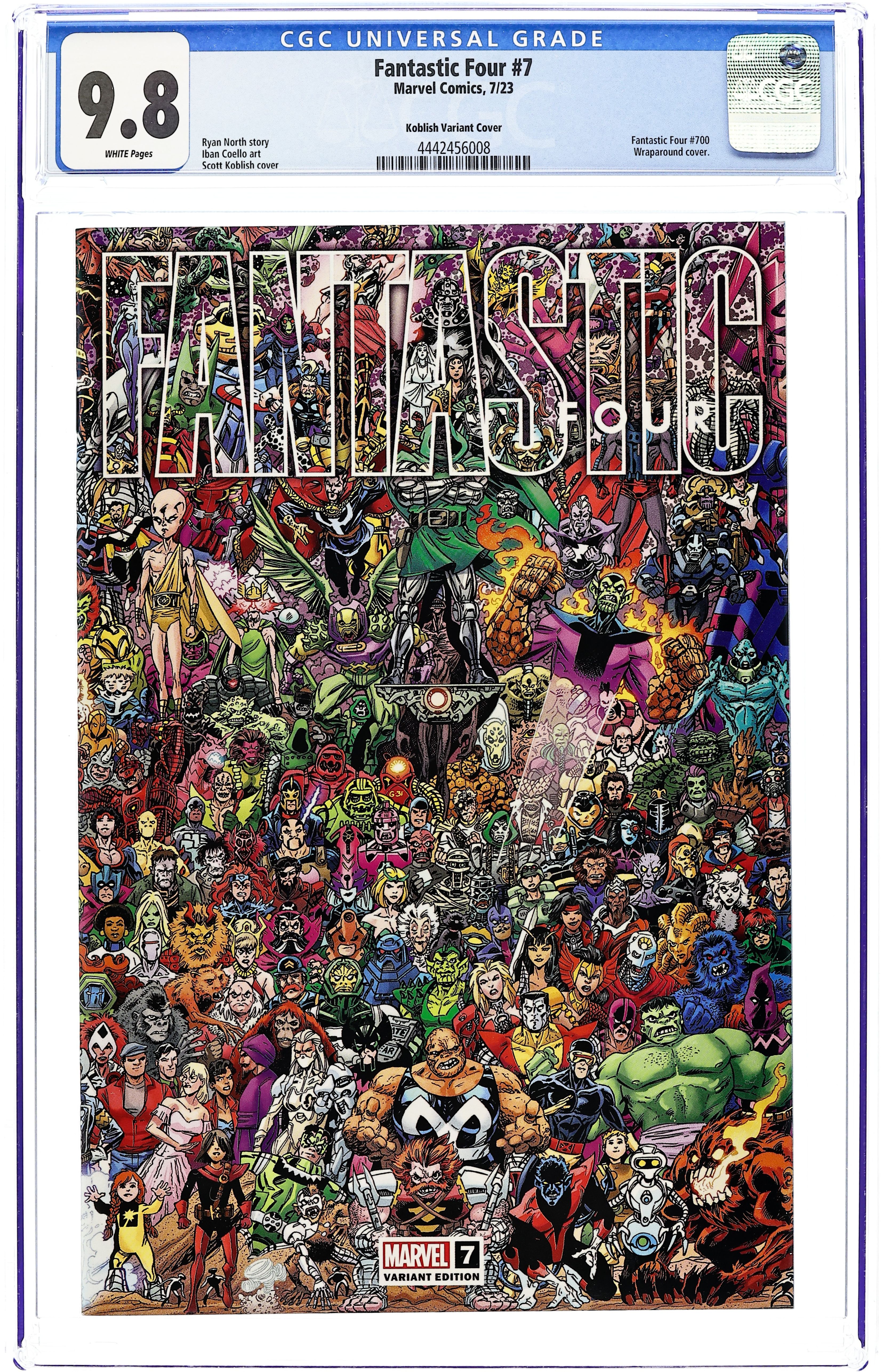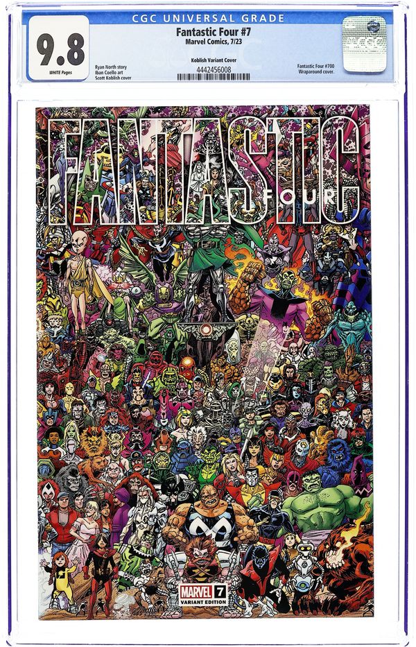 Written by Ryan North. Art by Iban Coello. Cover by Scott Koblish. COLOSSAL ISSUE #700! FANTASTIC FOUR #7 is also FANTASTIC FOUR #700, which means we're ABSOLUTELY going huge. It's an over-sized spectacular as the Fantastic Four reach their new home - not knowing that a mysterious threat has made it there first! As their knowledge of LANGUAGE ITSELF begins to melt from their minds, the Four are in disarray as their existence hangs in the balance... ...and the greatest villain of all time finally seals their DOOM. 56 pages, full color. Rated T+ Cover price $5.99.