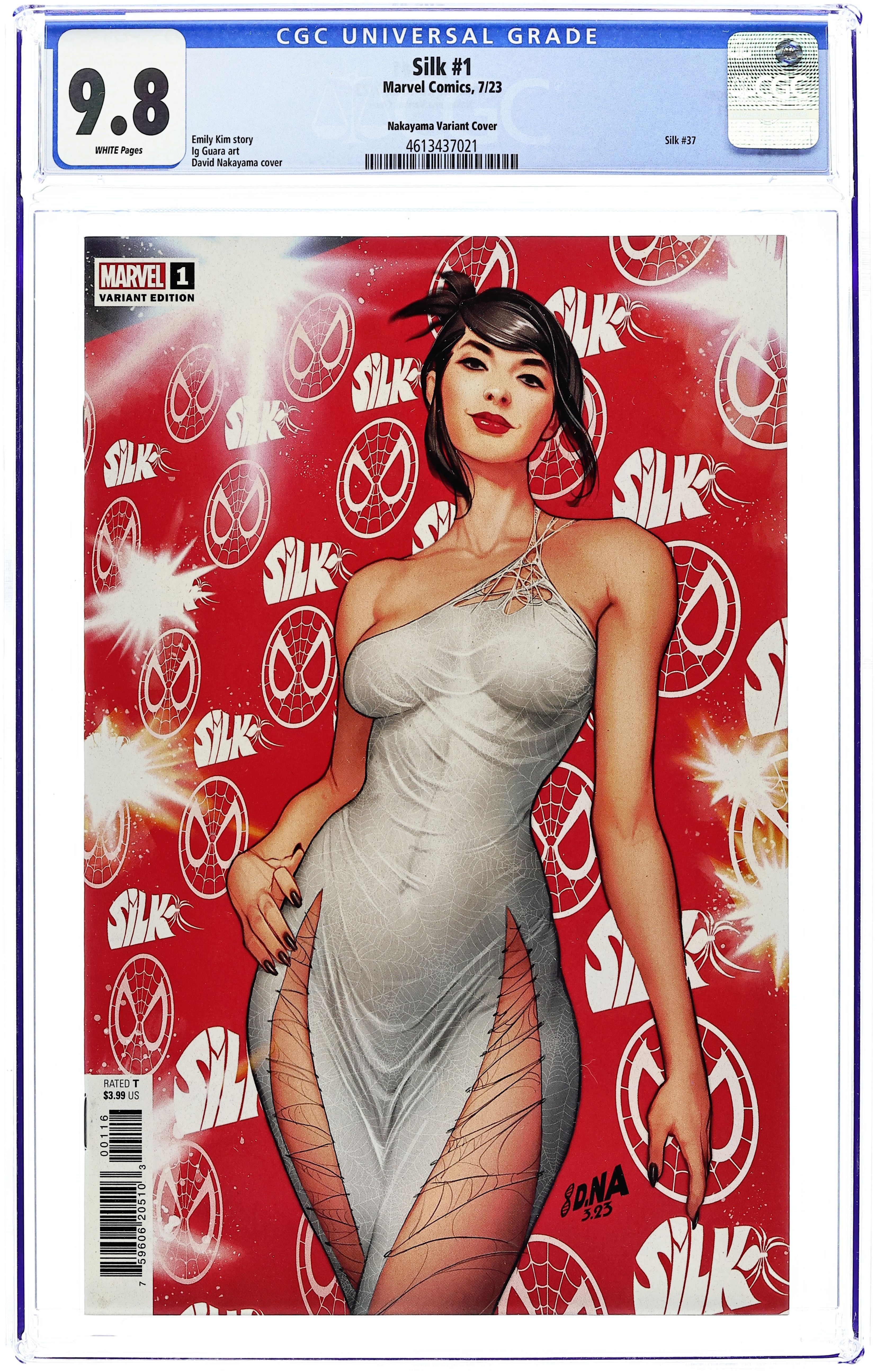 Limited 1 for 25 Retailer Incentive Variant Cover. Written by Emily Kim. Art by Ig Guara. Cover by David Nakayama. SILK SWINGS BACK INTO THE SPIDER-VERSE! There's something rotten in Los Angeles, and ace detective Cindy Moon is on the case! Wait…that can't be right. In this mind-bending new series, Cindy will face old foes and never-before-seen dangers that will take her to the breaking point! Brought to you by all-star writer Emily Kim (SILK, TIGER DIVISION) and Marvel veteran Ig Guara (GHOST-SPIDER, SPIDER-GWEN)! 28 pages, full color. Rated T+ Cover price $3.99.