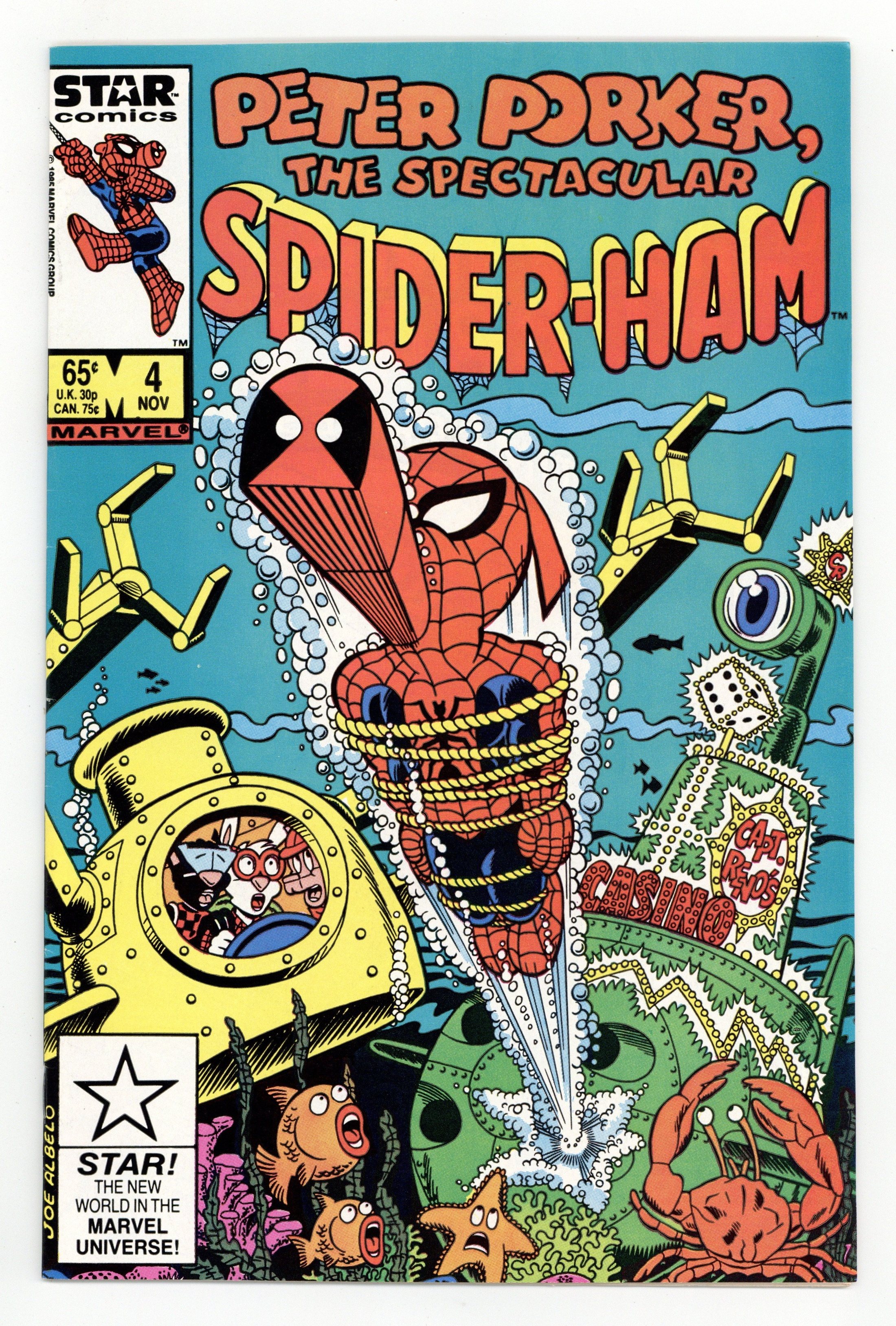 Published Nov 1985 by Marvel/Star Comics.$16.25Cover by Joe Albelo. "20,000-to-One Under the Sea!," script by Steve Skeates, pencils by Fred Hembeck, inks by Joe Albelo; Spider-Ham captures some wharf rats, and realizes that all the yachts are deserted; Peter, Jonah, and the three interns discover that the yachts are now for sale - their owners have been hypnotized by Loreli Lemur; Spider-Ham battles Loreli, Capt. Reno loses control of his hydraulic boots, and Spider-Ham captures the criminals. "Big Snack Attack," script by Mike Carlin, art by Eric Cartier; Doctor Strange fails to save a beautiful duckling from The Breaded Boremamuu, but The Rancid One is more successful. 36 pgs., full color. $0.65. Cover price $0.65.