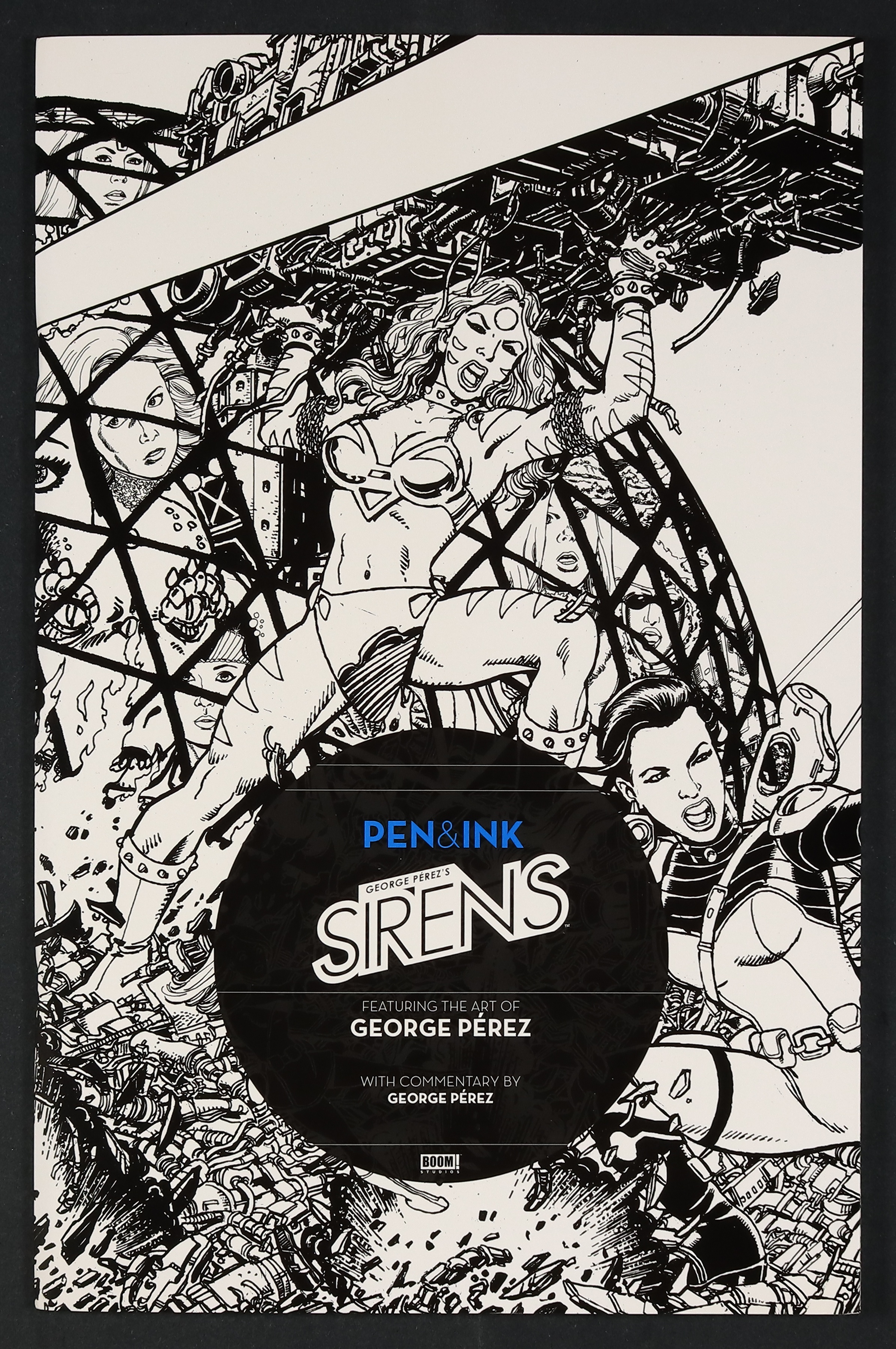 Published 2015 by Boom Studios.$20.00Volume 1 - 1st printing. Written and illustrated by George Perez. What's to Love: With the previous editions of Pen & Ink featuring the art of industry veteran Brian Stelfreeze (Day Men) and newcomer Vanesa R. Del Rey (Hit), we wanted to go back to a comics legend, and naturally that had to be George Perez! His detailed pencils and inks on George Perez's Sirens-his first original title in over 10 years-are on full display and are a testament to the lasting popularity of his skills. What It Is: Perfect for fans who want to look "behind the scenes" of making comics, the Pen & Ink series features artwork from highly skilled illustrators stripped down to their inks in the original artboard dimensions of 11" x 17"-or, in this case, and for the first time in a Pen & Ink book, stripped down to the pencils alongside inked and lettered pages. Get a detailed look at the making of George Perez's Sirens #1 from one of the industry's greatest masters. Softcover, 11" x 17", 48 pages, B&W. Cover price $14.99.