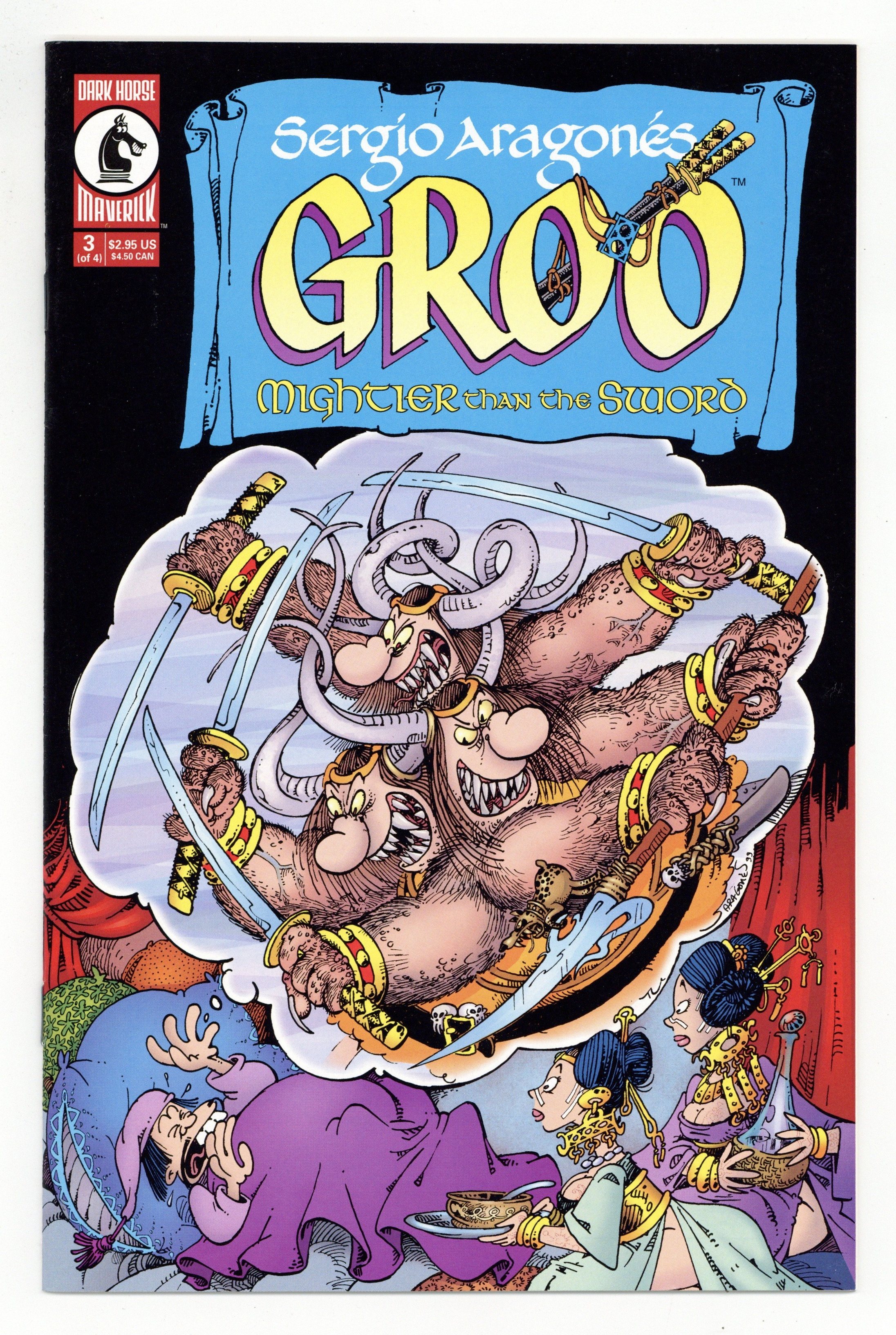 Published Mar 2000 by Dark Horse.$15.00Written by Sergio Aragones and Mark Evanier. Art by Sergio Aragones. What's the one thing that can scare even Groo? Relmihio, son of the Pipil Khan and Groo's latest, greatest enemy has found out. You will shiver in terror, you will quake in awe, you will absolutely plotz as Groo faces his most horrifying opponent: The Mighty, The Dreadful, The Ghastly . . . Groo? Brought to you by Sergio Aragonés and Mark Evanier. 32 pages, FC. Cover price $2.95.
