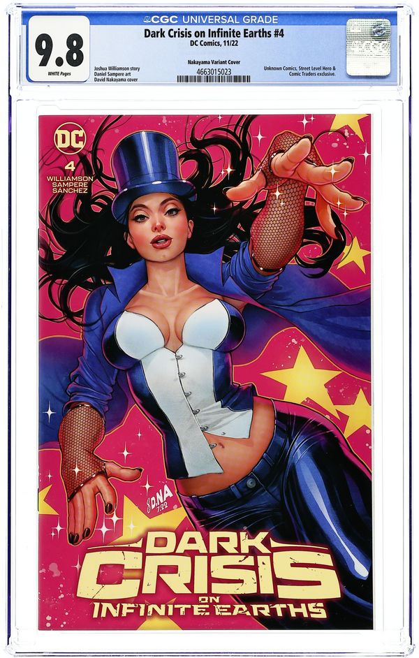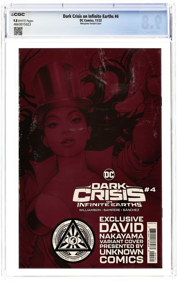 Comics Illuminati (Unknown Comics, Street Level Hero, and Comic Traders) exclusive cover by David Nakayama. Written by Joshua Williamson. Art by Daniel Sampere and Alejandro Sanchez. WITNESS THE BIRTH OF THE NEW DC MULTIVERSE! Spinning out of the pages of The Flash, the heroes have learned the secret of Pariah's new worlds—but at what cost does this knowledge come, and what can they even do with this information—or even worse, perhaps Pariah and the Great Darkness want them to know...? On Earth-Zero, Deathstroke continues to move forward with his plans to erase legacy heroics once and for all, while Jon Kent, Nightwing, and the ragtag group of youngsters rally to step up to the increasing number of challenges. The event of the year rages on! Dark Crisis is in many ways the direct sequel to the original Crisis on Infinite Earths by Marv Wolfman and George Perez. In this issue Pariahs attempt to restore the infinite Multiverse reaches a breaking point! 32 pages, full color. Rated T+