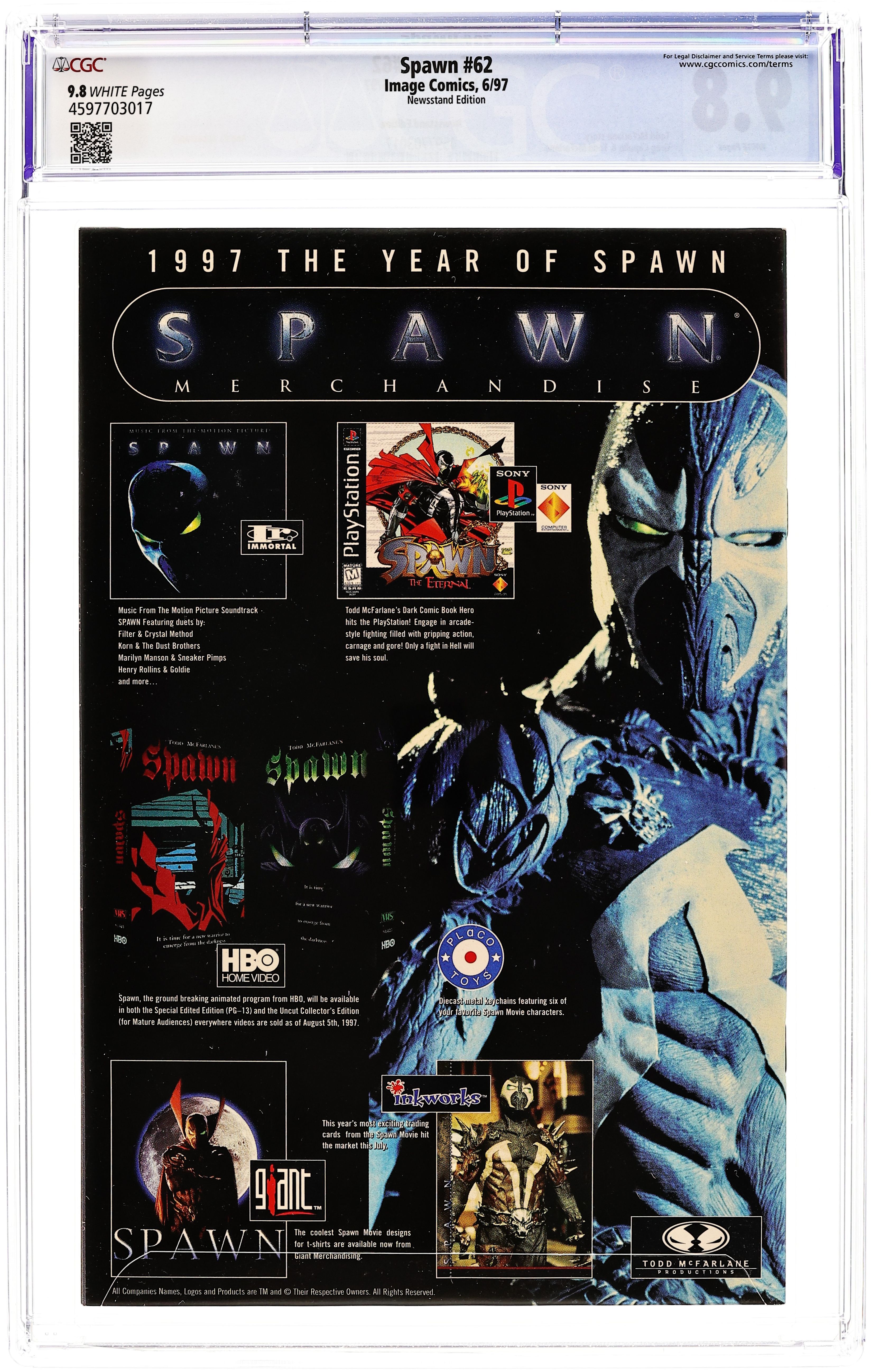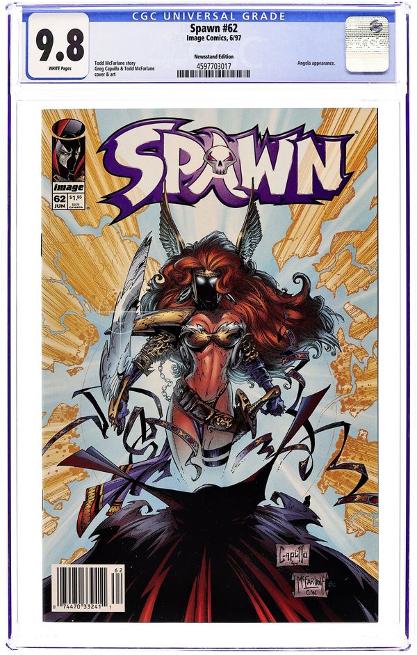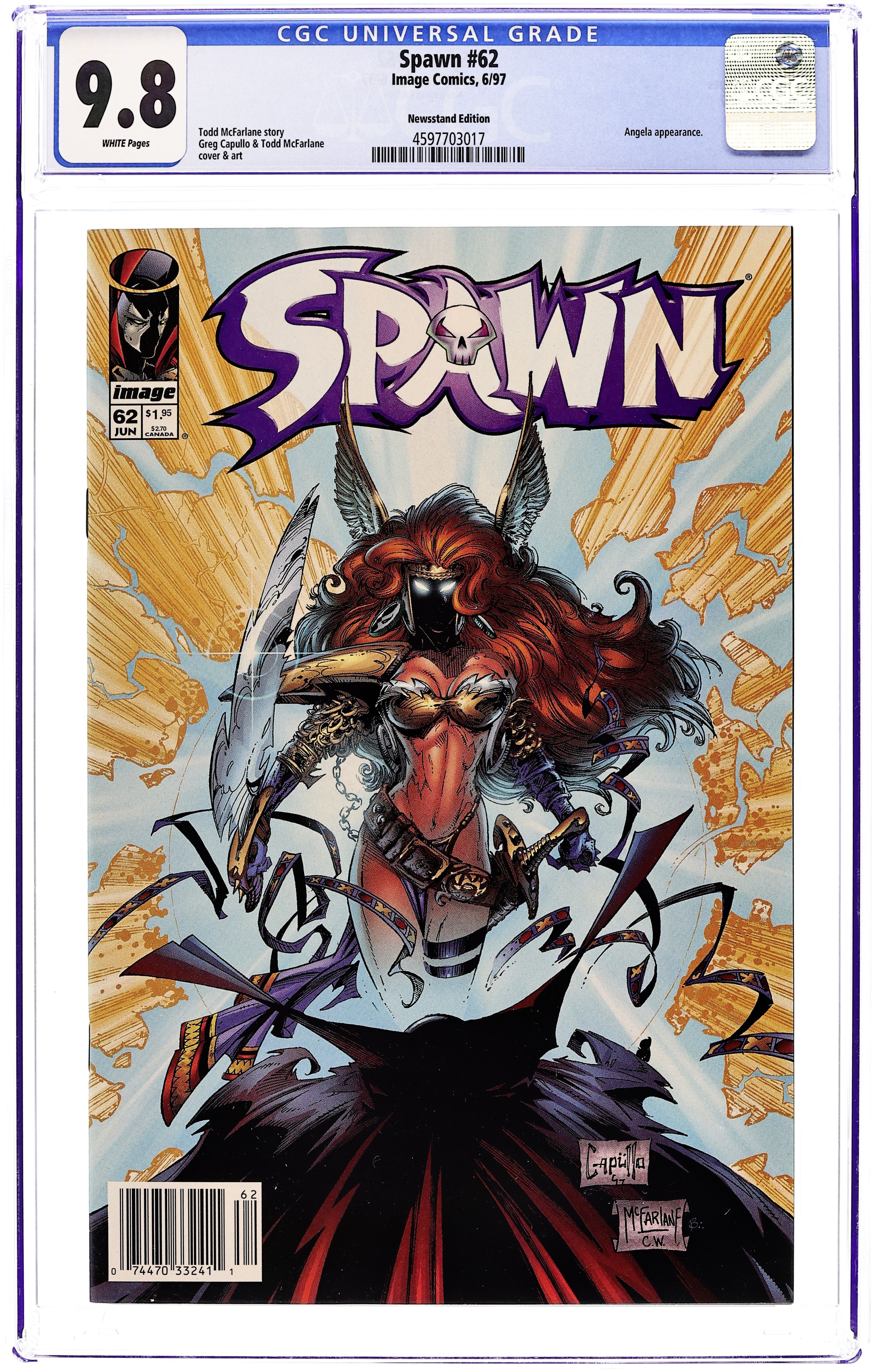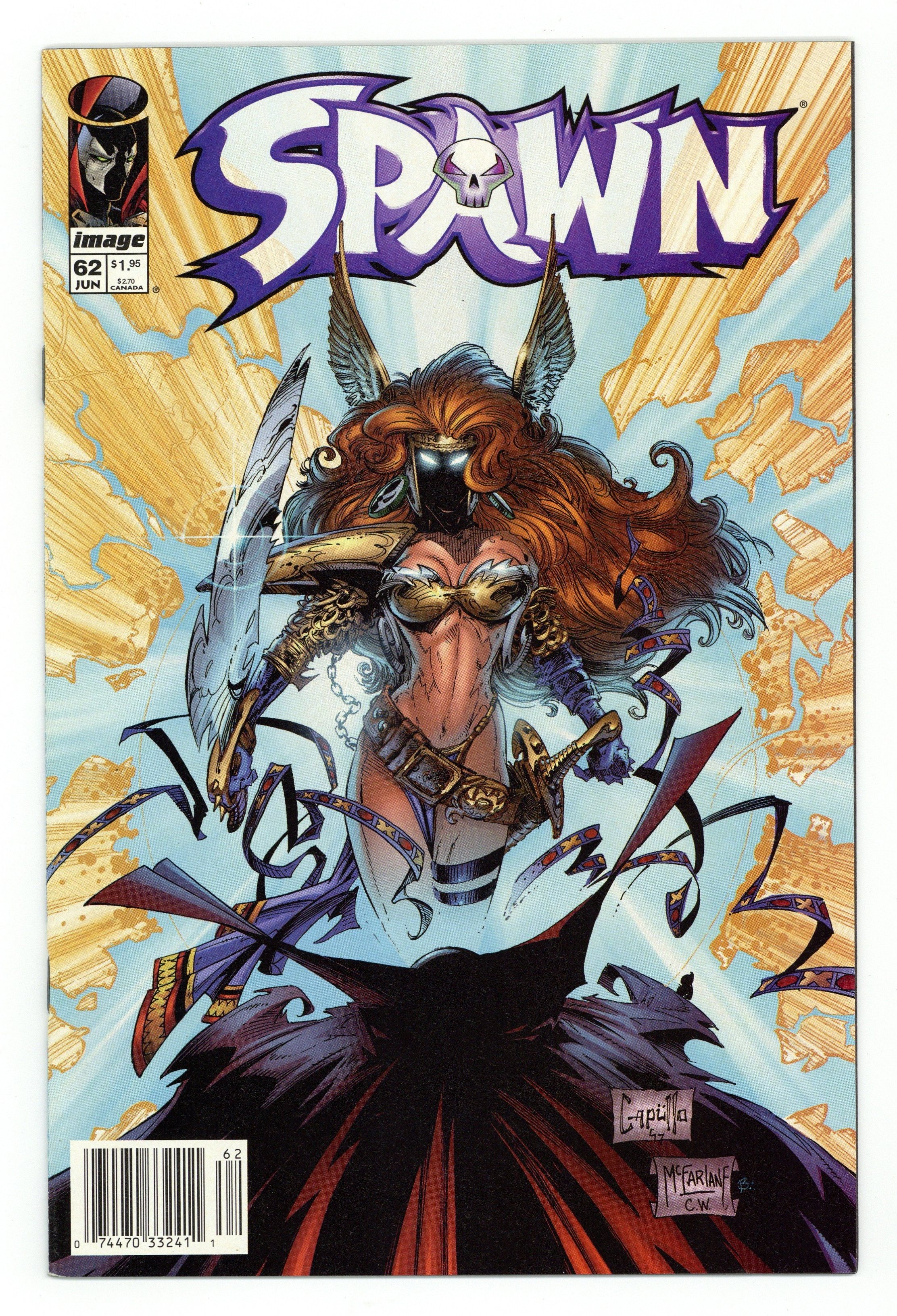 Newsstand Edition. Written by Todd McFarlane. Art by Greg Capullo, Todd McFarlane, and Chance Wolf. Cover by Greg Capullo and Todd McFarlane. "Return!" Spawn confronts Jason Wynn and tells him the time and place that he's going to die. Meanwhile, its the startling return of Angela! But is she here as friend or foe? Plus, Al Simmons's face restored?! 32 pages, FC. NOTE: This issue is dedicated to Clint Goldman Cover price $1.95.