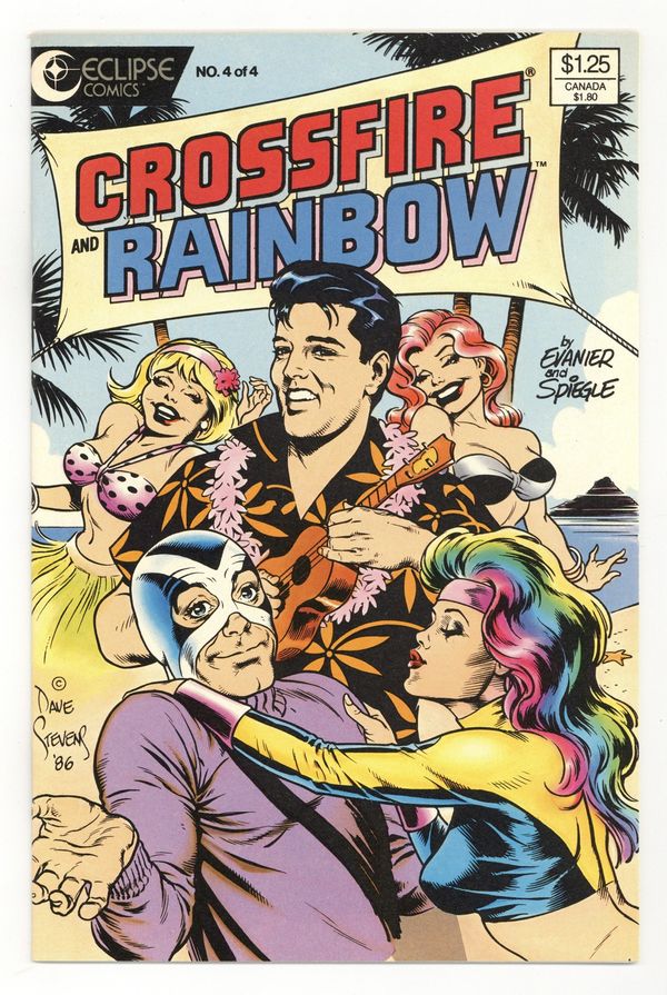 Starts Dec 8 Dave Stevens cover. With Jay in jail and blamed for the murder of a police officer, Rainbow tries to find the real killer in "This Isn't Elvis." Script by Mark Evanier and art by Dan Spiegle. Issue also has "Text Page" by Mark Evanier. Cover price $1.25.