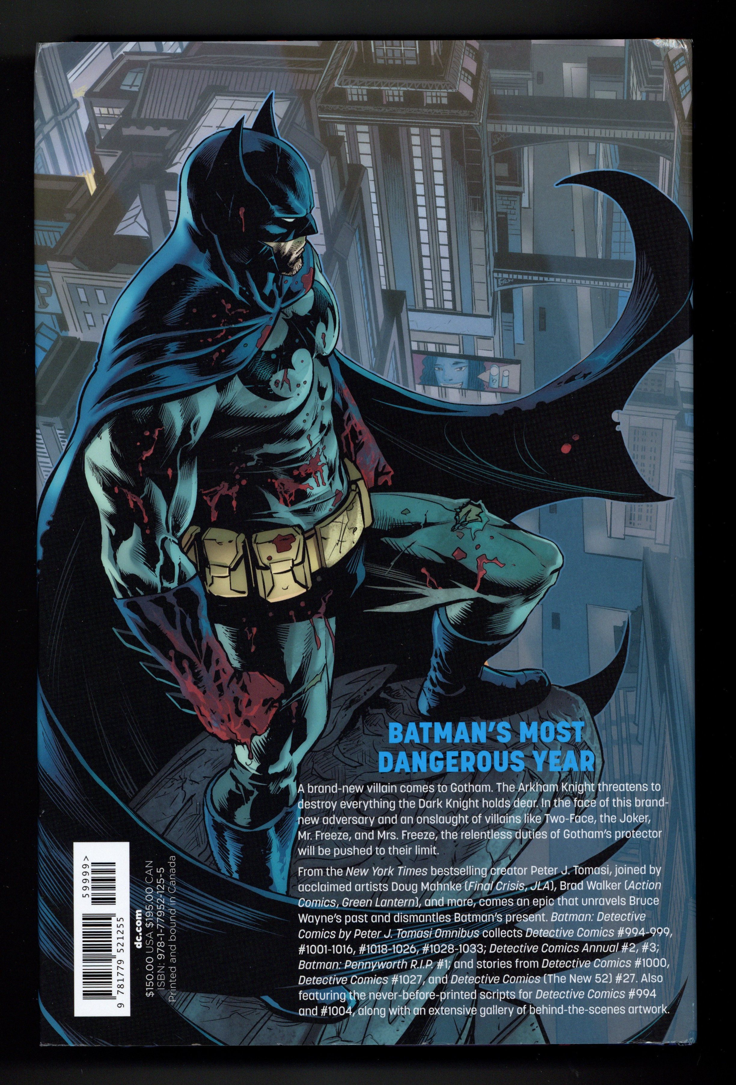 1st printing. Collects Detective Comics (2016 3rd Series) #994-999, 1001-1016, 1018-1033, Detective Comics (2016) Annual #2-3, Batman: Pennyworth R.I.P. (2020 DC) #1, and a story from Detective Comics (2016 3rd Series) #1000 and Detective Comics (New 52) #27. Written by Peter J. Tomasi and James Tynion IV. Art by Doug Mahnke, Christian Duce, Kenneth Rocafort, Mark Irwin, Christian Alamy, Bilquis Evely, Scott Goglewski, Kyle Hotz, Sumit Kumar, Keith Champagne, Travis Moore, Max Raynor, Nicola Scott, Ian Bertram, Doug Mahnke, Norm Rapmund, Eduardo Risso, Chris Burnham, David Lafuente, Diogenes Neves, Marcio Takara, Tyler Kirkman, Jose Luis, Eber Ferreira, and Matt Santorelli. Cover by Doug Mahnke and Jaime Mendoza. Back Cover by Christian Duce. Writer Peter J. Tomasi's prolific Detective Comics run raised the stakes for the Dark Knight's adventures in Gotham City. Together with artists Doug Mahnke, Brad Walker, Kyle Hotz, and others, Tomasi crafted numerous iconic storylines--such as Mythology, Medieval, and Cold Dark World--that pushed Batman and his rogues to the edge, blurring the lines between heroes and villains. Hardcover, 8 1/2-in. x 11-in., 1,016 pages, full color. Cover price $150.00.