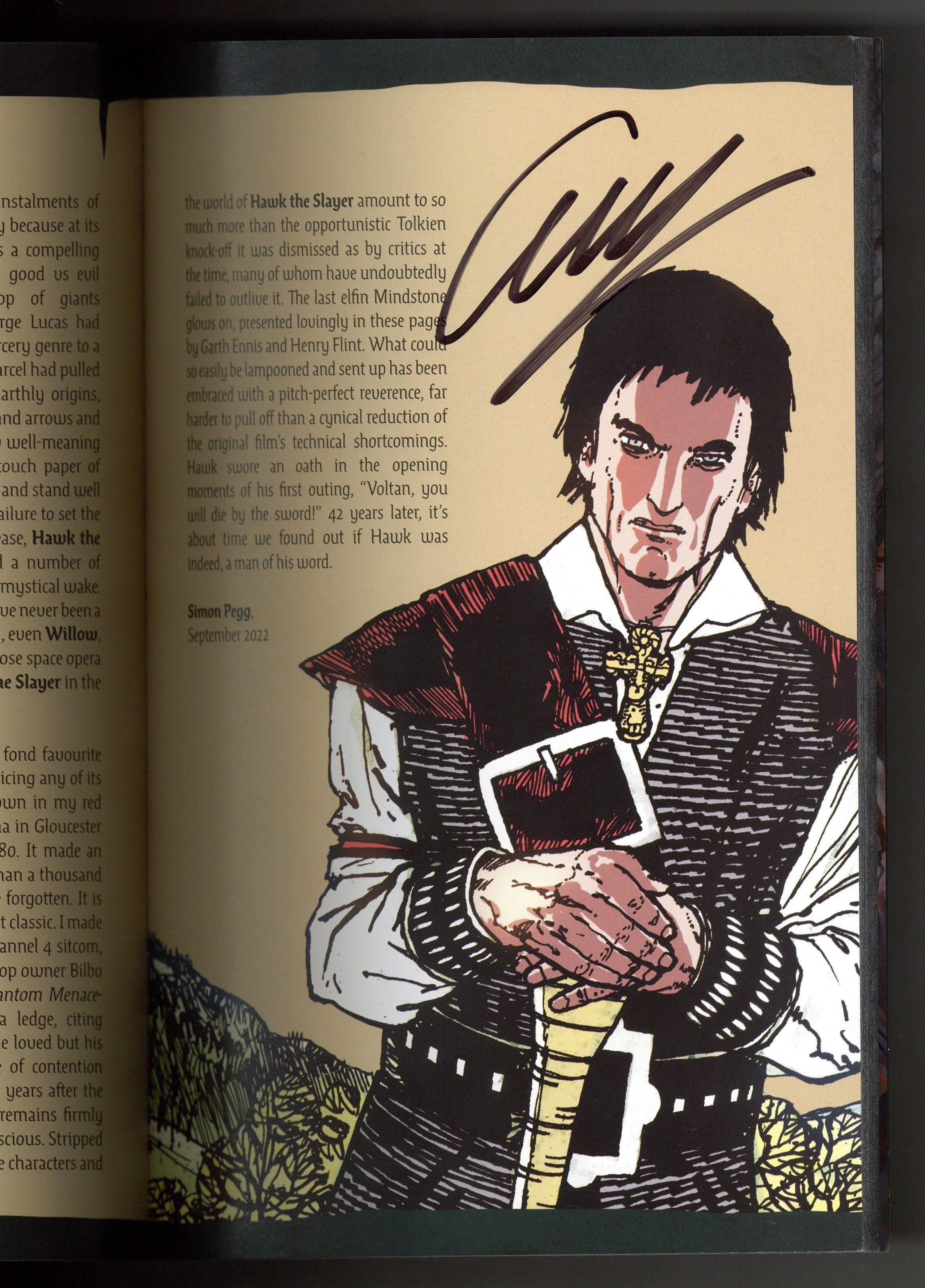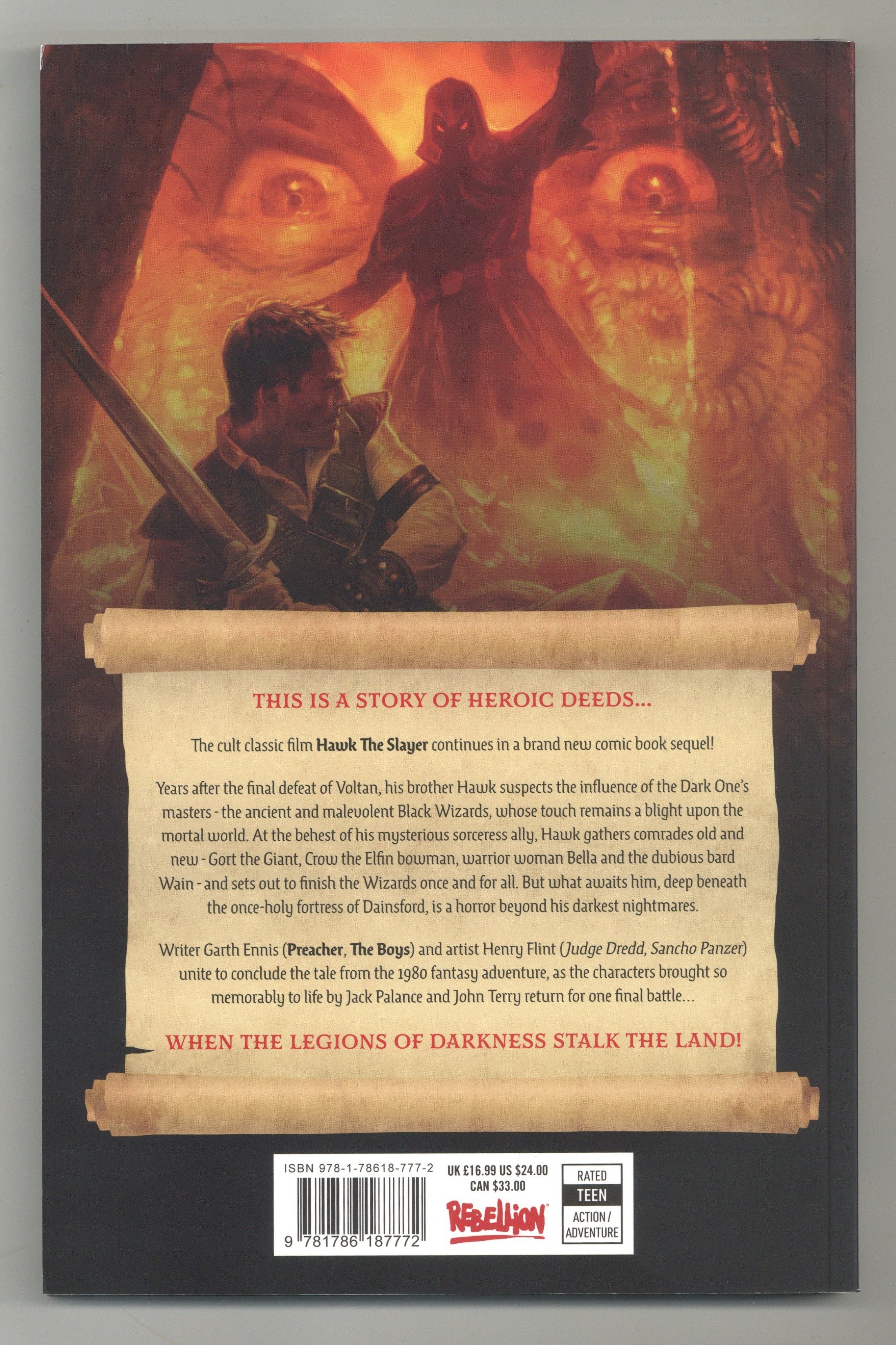 1st printing. Collects Hawk the Slayer (2022 Rebellion) #1-5. Written by Garth Ennis. Art by Henry Flint. Cover by Greg Staples. Introduction by Simon Pegg. The graphic novel sequel to the classic fantasy movie, written by Garth Ennis and drawn by Henry Flint! Years after the defeat of Voltan, Hawk is still wary of the return of the Black Wizards, and so The Table of Five gathers once more; Hawk, Gort, Crow, and the Witch, are joined by Bella and a young bard called Wain, who wishes to turn their adventure into a new saga. The story of the cult classic film continues with this comic book sequel, prefaced by an adaptation of the film itself, so that no reader is left behind. This is sword-and-sorcery epic will leave readers astonished with both the revelations and the action contained within. Softcover, 128 pages, full color. Cover price $24.00.