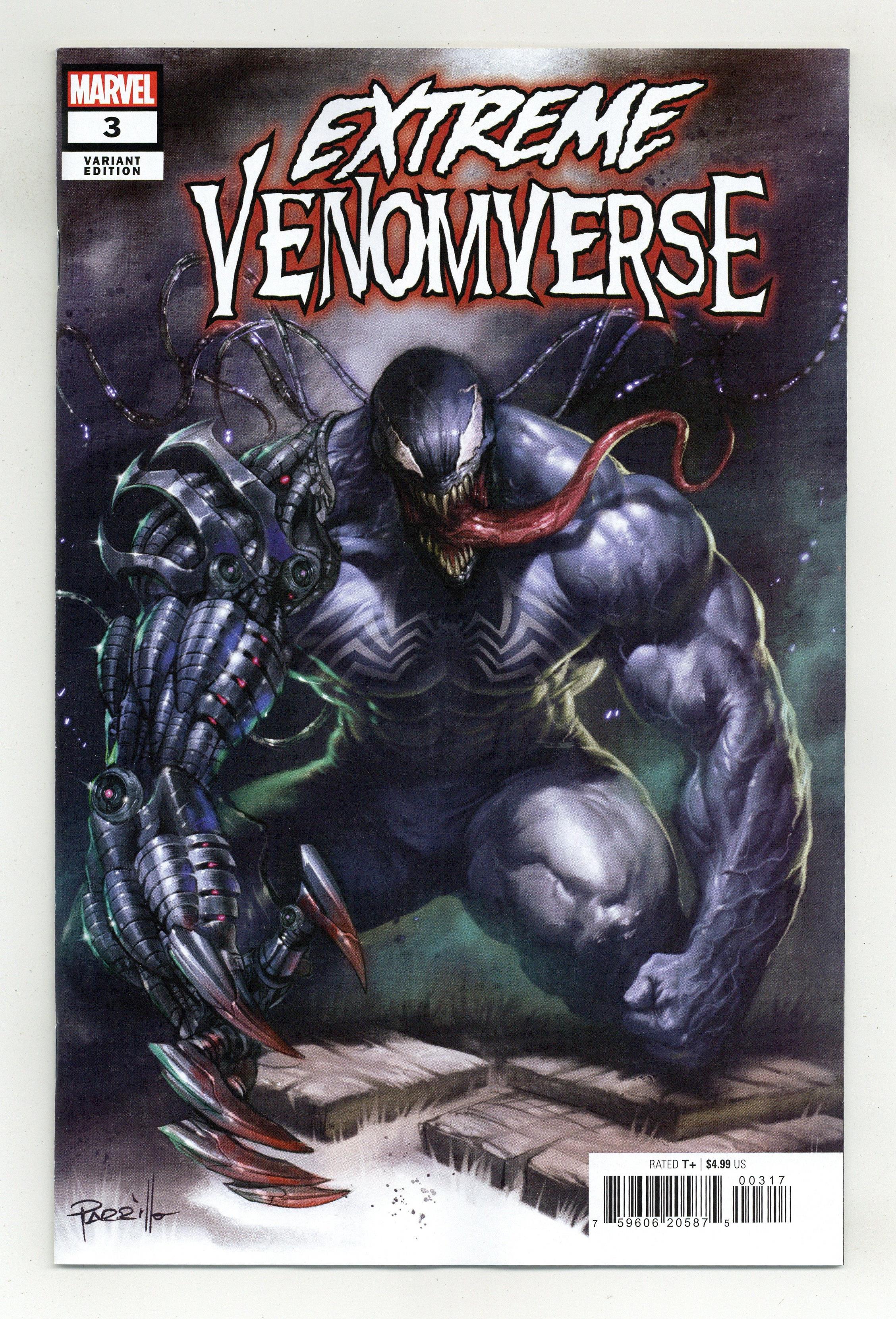 Tags: Venom$2.65Limited 1 for 25 Retailer Incentive Variant Cover. Written by Taran Killam; JED MacKay, Clay McLeod Chapman. Art by Rod Reis; Daniel Earls, Nelson Daniel. Cover by Lucio Parrillo. Face front, Venomaniacs! EVEN MORE vicious and violent Venoms enter the fray! FIRST! TARAN KILLAM and ROD REIS unite to pay a visit to the Old West and introduce you readers out there in Mighty Marveldom to an all-new Madame Venom - a femme fatale who'll leave even the roughest and toughest outlaws shaking in their boots! THEN! Your new favorite comic book writer, Jed MacKay, and Marvel newcomer Danny Earls, unite to tell a tale as old as time - literally! Together, they'll introduce a brand-new, prehistoric and primal vision of Venom! AND! What? You thought we forgot VENOM SPACEKNIGHT?! WE WOULD NEVER! But if he's your favorite Venom ever, you better keep your fingers crossed - because not every Venom is making it out of this saga alive. PLUS! Another round of DAILY BUGLE funnies from comics legend Ty Templeton - this time with a symbiotic spin! 40 pages, full color. Rated T+ Cover price $4.99.