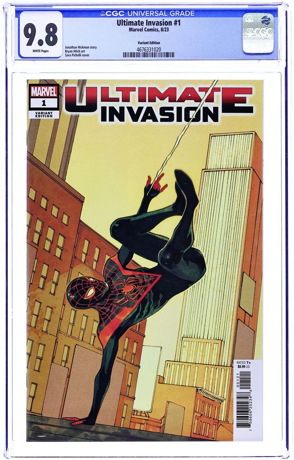 Written by Jonathan Hickman. Art by Bryan Hitch. Cover by Sara Pichelli. THE TRANSFORMATION OF THE MARVEL UNIVERSE BEGINS! Superstar creators Jonathan Hickman and Bryan Hitch team up! The Illuminati must form once again to stop the Maker from his plans to destroy - or perhaps rebuild - the universe, with Miles Morales at the center of it all! Bryan's work on THE ULTIMATES helped redefine super hero comics for the 2000s - wait until you see what he and Jonathan have in store for this decade! Including new data pages by Jonathan Hickman - plus exclusive behind-the-scenes material on the world-building that has gone into this project! 56 pages, full color. Rated T+ Cover price $8.99.