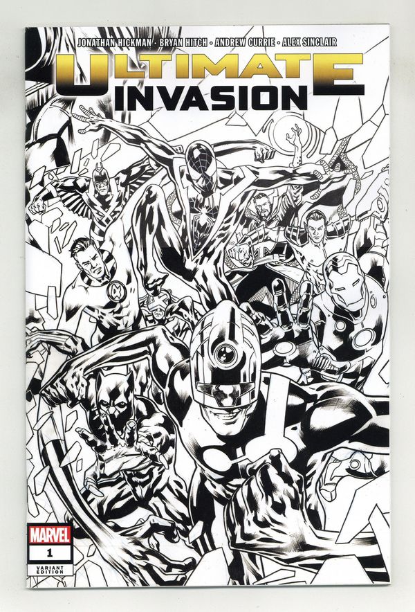 Limited 1 for 50 Retailer Incentive Variant Cover. Written by Jonathan Hickman. Art and Cover by Bryan Hitch. THE TRANSFORMATION OF THE MARVEL UNIVERSE BEGINS! Superstar creators Jonathan Hickman and Bryan Hitch team up! The Illuminati must form once again to stop the Maker from his plans to destroy - or perhaps rebuild - the universe, with Miles Morales at the center of it all! Bryan's work on THE ULTIMATES helped redefine super hero comics for the 2000s - wait until you see what he and Jonathan have in store for this decade! Including new data pages by Jonathan Hickman - plus exclusive behind-the-scenes material on the world-building that has gone into this project! 56 pages, full color. Rated T+ Cover price $8.99.