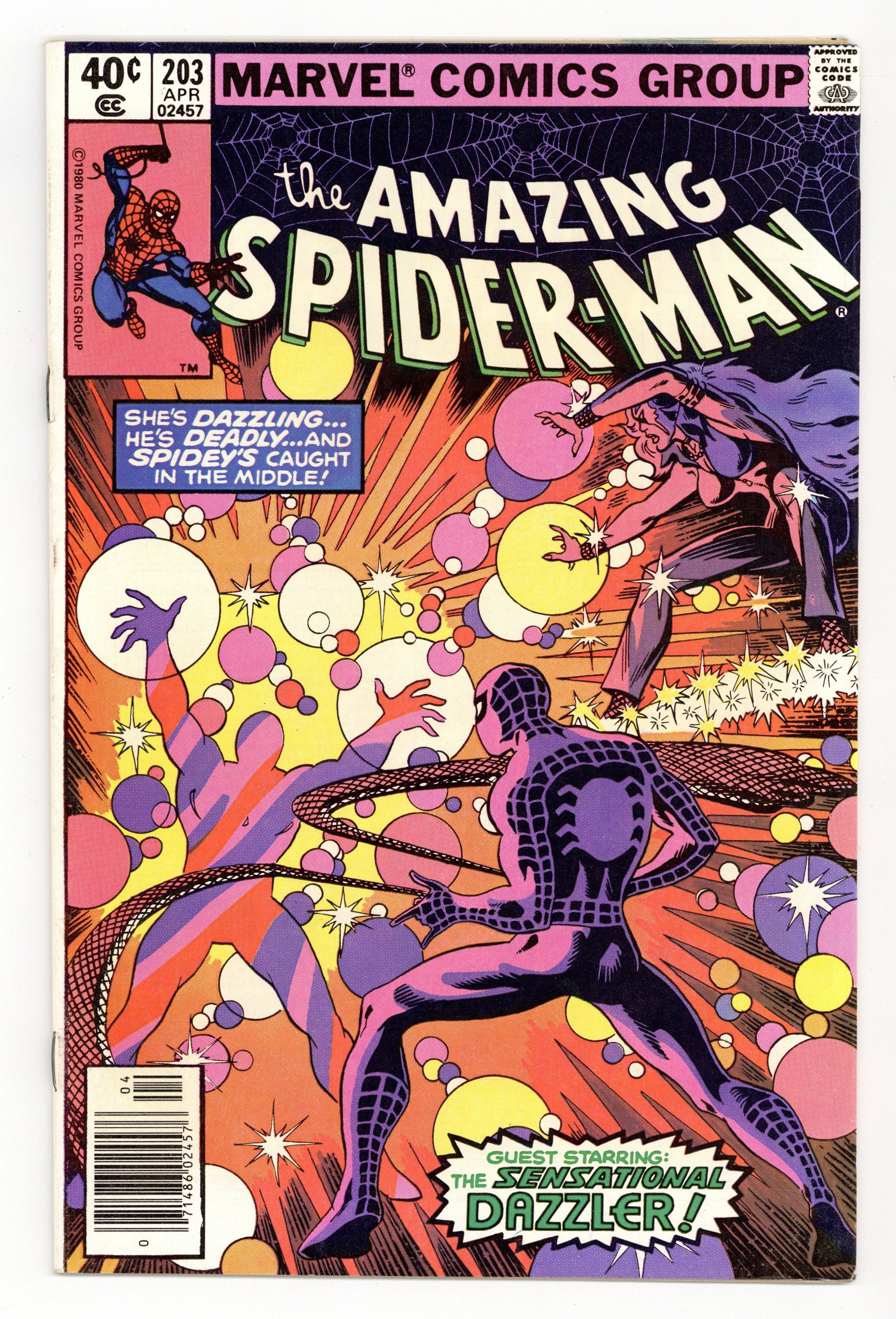 Newsstand Edition. "Bewitched, Bothered, and Be-Dazzled!" Guest-starring Dazzler. Script by Marv Wolfman. Pencils by Keith Pollard. Inks by Mike Esposito and friends. Cover by Keith Pollard and Joe Rubinstein. On the streets of New York City, Marvel's new disco sensation meets the Amazing Spider-Man! But formal introductions will have to wait as the Lightmaster is in hot pursuit of Dazzler! Once the web-slinger's enemy possesses the mutant songstress, Spider-Man learns firsthand about Dazzler's brilliant powers! Can the wall-crawler turn out the light (master) and save his new friend? Second appearance of Dazzler. Cameo appearances by Aunt May, Harry Osborn, and Flash Thompson. (Notes: Spider-Man and Dazzler cross paths again in Marvel Team-Up 109. The Lightmaster previously appeared in Spectacular Spider-Man 20. The first appearance of Dazzler took place in Uncanny X-Men 130. She appears next in Fantastic Four 217 and then in the first issue of her self-titled series: Dazzler (1981). This story was reprinted in Marvel Tales 230.) 36 pages. Cover price $0.40.