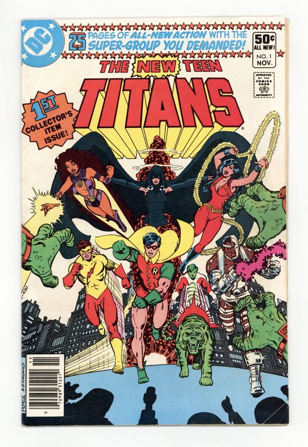 Newsstand Edition. The mysterious Raven tries to convince Robin, Wonder Girl, Kid Flash, Changeling, Cyborg & Starfire to form a new Teen Titans team in "The New Teen Titans." Cameos by Bruce Wayne and Grant Wilson. Script by Marv Wolfman, pencils by George Perez, finishes by Romeo Tanghal. Cover by Perez & Dick Giordano. Cover price $0.50.
