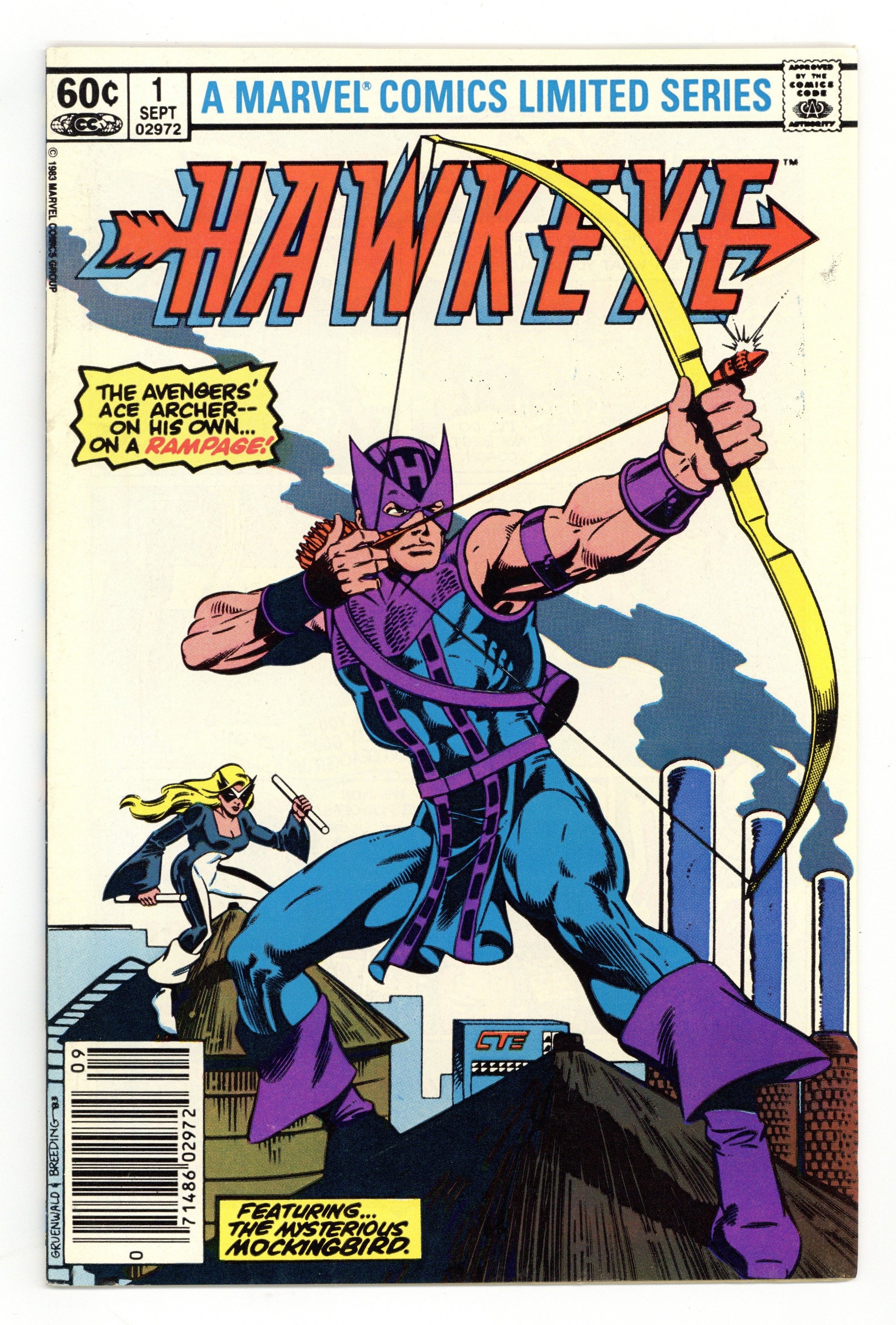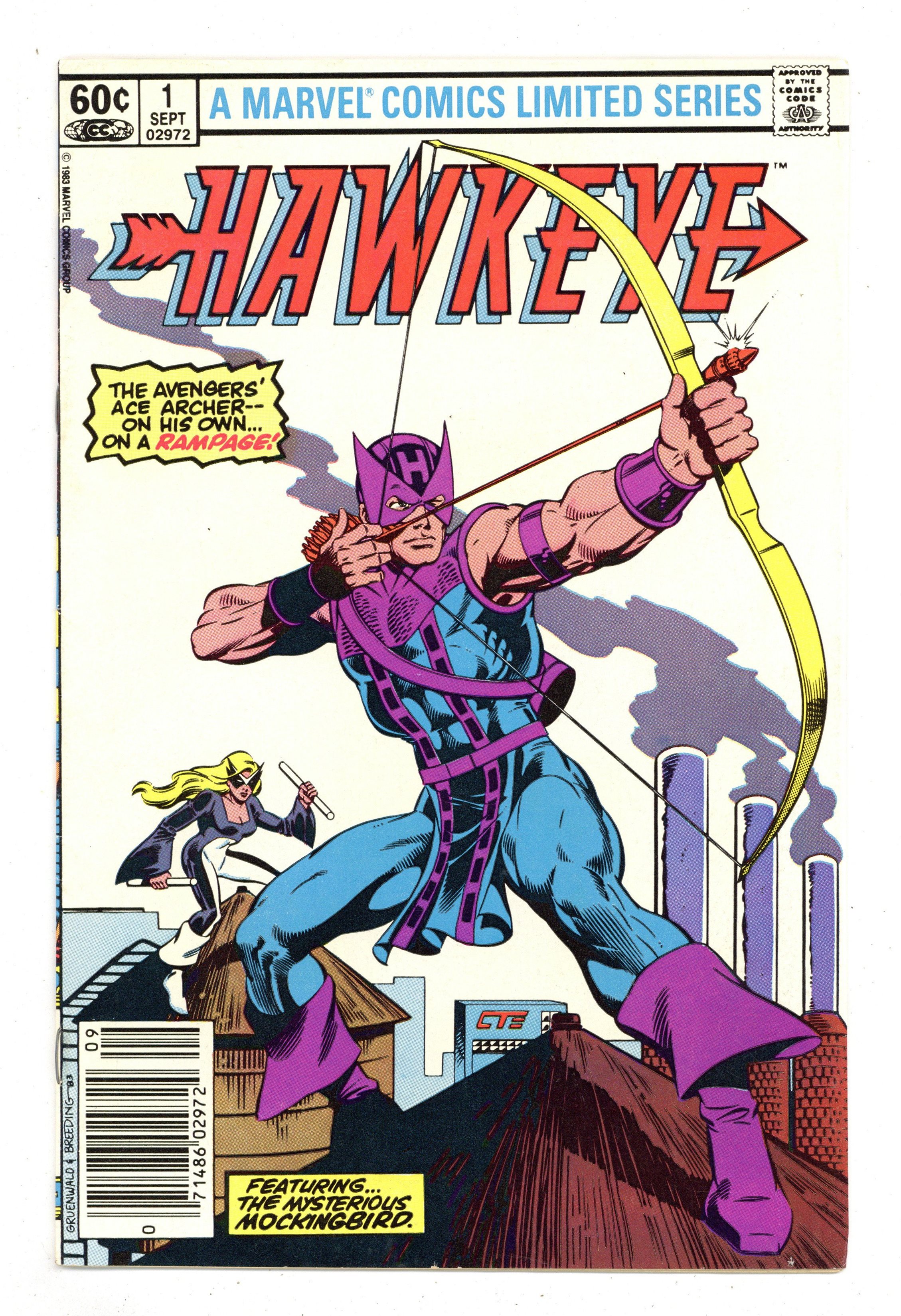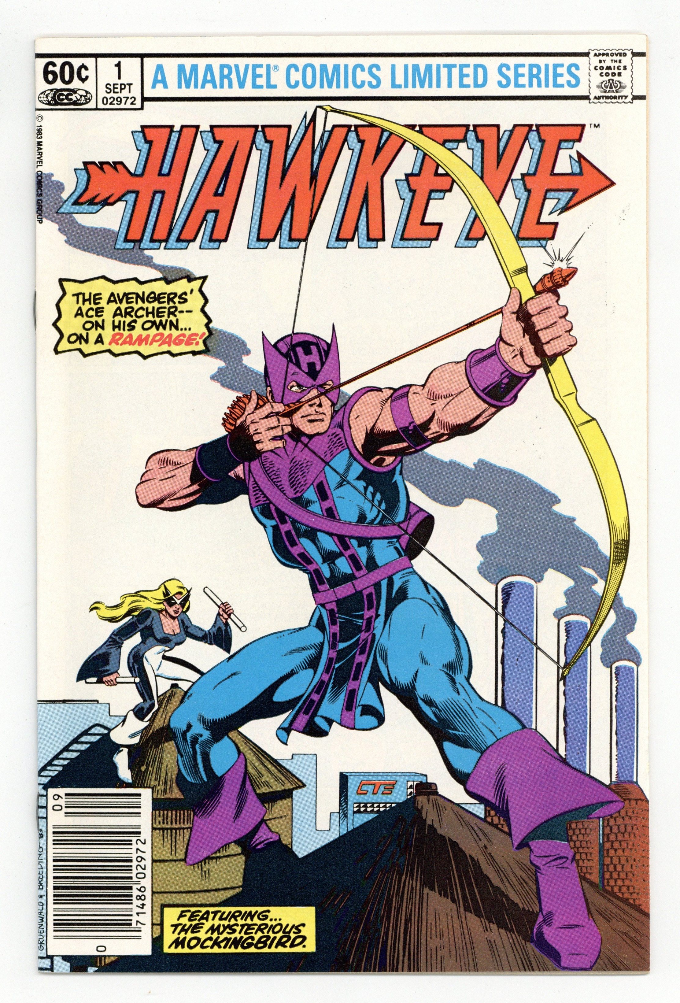 Newsstand Edition. "Listen to the Mockingbird" Guest-starring Mockingbird. Script by Mark Gruenwald. Art by Mark Gruenwald (pencils) and Brett Breeding (inks & embellishes). Cover by Mark Gruenwald and Brett Breeding. At last the Avengers' ace archer has his own limited series! And at the moment life is great for Clint Barton with a new job, new rocket-sled, and new girlfriend! But a late night encounter with a mysterious woman called Mockingbird turns Hawkeye's dream world upside down! The ex-SHIELD agent tells the bow-slinger that his employer, Cross Technological Enterprises, is involved in criminal activities! But Hawkeye doesn't believe her! However he will... after he's double-crossed by Cross! Retelling of Hawkeye's origin. Flashback cameos by Barney Barton, Iron Man, Captain America, Quicksilver, Scarlet Witch, and the Swordsman. (Notes: Mockingbird previously appeared in Marvel Team-Up 95. This four-part limited series was reprinted in 1988 in the trade paperback: Hawkeye; and again in 2009 in the trade paperback: Avengers Hawkeye.) 32 pages. Cover price $0.60.
