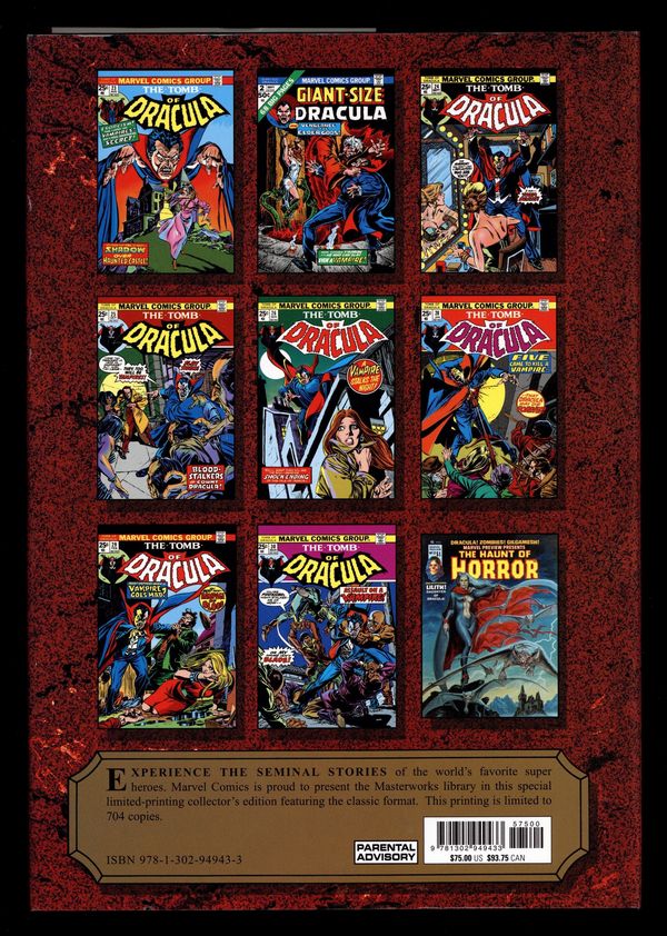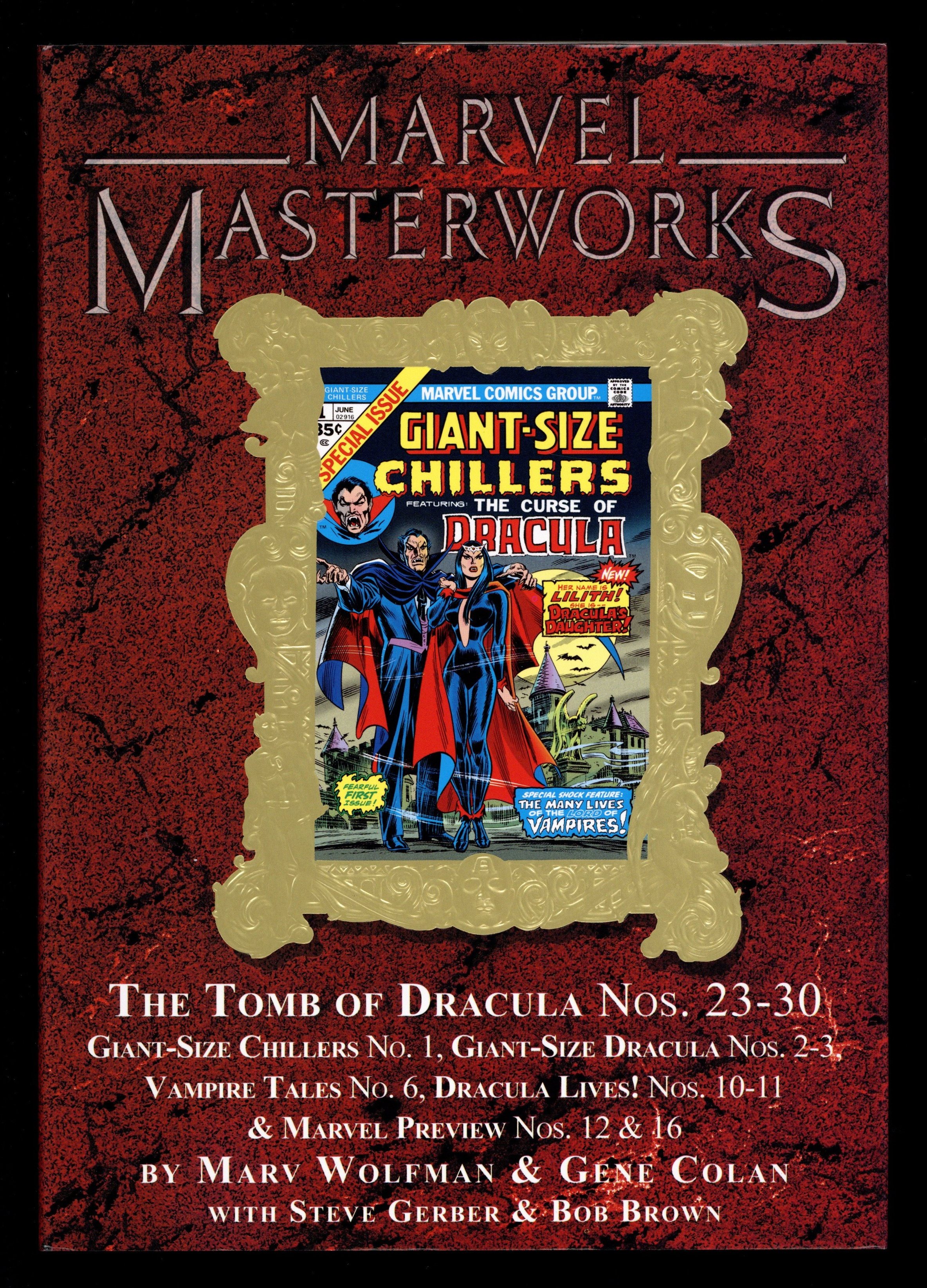 Volume 349 - 1st printing. "The Tomb of Dracula: Book 3!" Collects The Tomb of Dracula (1972-1979 1st Series) #23-30; Giant Size Chillers (1975) #1; Giant Size Dracula (1974) #2-3; and material from Vampire Tales (1973-1975) #6, Dracula Lives! (1973-1975 Magazine) #10-11, and Marvel Preview (1975-1981 Magazine) #12 and #16. Written by Marv Wolfman and Chris Claremont. Art by Gene Colan, Tom Palmer, Don Heck, Frank Chiaramonte, Frank McLaughlin, and Frank Springer. Cover by Gil Kane. Introduction by Stephen Graham Jones. They said the devil had a daughter. That daughter is Lilith! Dracula's scion is revealed in this historic volume - and while she doesn't get along with dear old undead dad, she still carries on the bloodsucking family tradition. That means extra trouble for our vampire hunters Rachel Van Helsing, Quincy Harker, Frank Drake, Taj Nital and Blade! Speaking of Blade, he goes one-on-one with the Lord of Vampires - who has perhaps found a corner in his dark heart for a human woman. Plus: Hannibal King, a private detective with a biting secret, takes the stage. And new corners of Dracula's world are explored! All this and Lilith's complete solo saga from Marvel's black-and-white magazines! Hardcover, 368 pages, full color. Rated T+ Cover price $75.00.