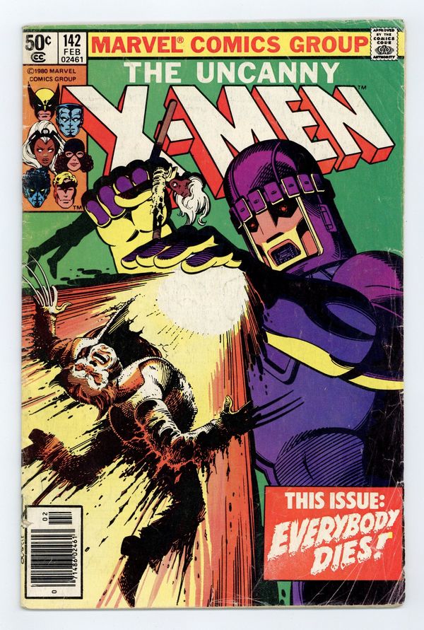 Tags: X-Men$79.00Newsstand Edition. Days of Future Past: Part 2 of 2. "Mind Out of Time!" Story by Chris Claremont and John Byrne. Art by John Byrne and Terry Austin. Cover by Terry Austin. In order to prevent a dystopian future where all mutants and super-heroes are hunted and killed by the robotic Sentinels, the X-Men must prevent the new Brotherhood of Evil Mutants from assassinating Senator Kelly. Featuring one of the most shocking death scenes in the comic book history. NOTE: Uncanny X-Men #123 and #142 are rare commodities in the realm of comics as they are two of the very few covers where inker extraordinaire Terry Austin actually does the pencils as well. - Odinson Lone Star Comics Archivist.36 pgs. Cover price $0.50.