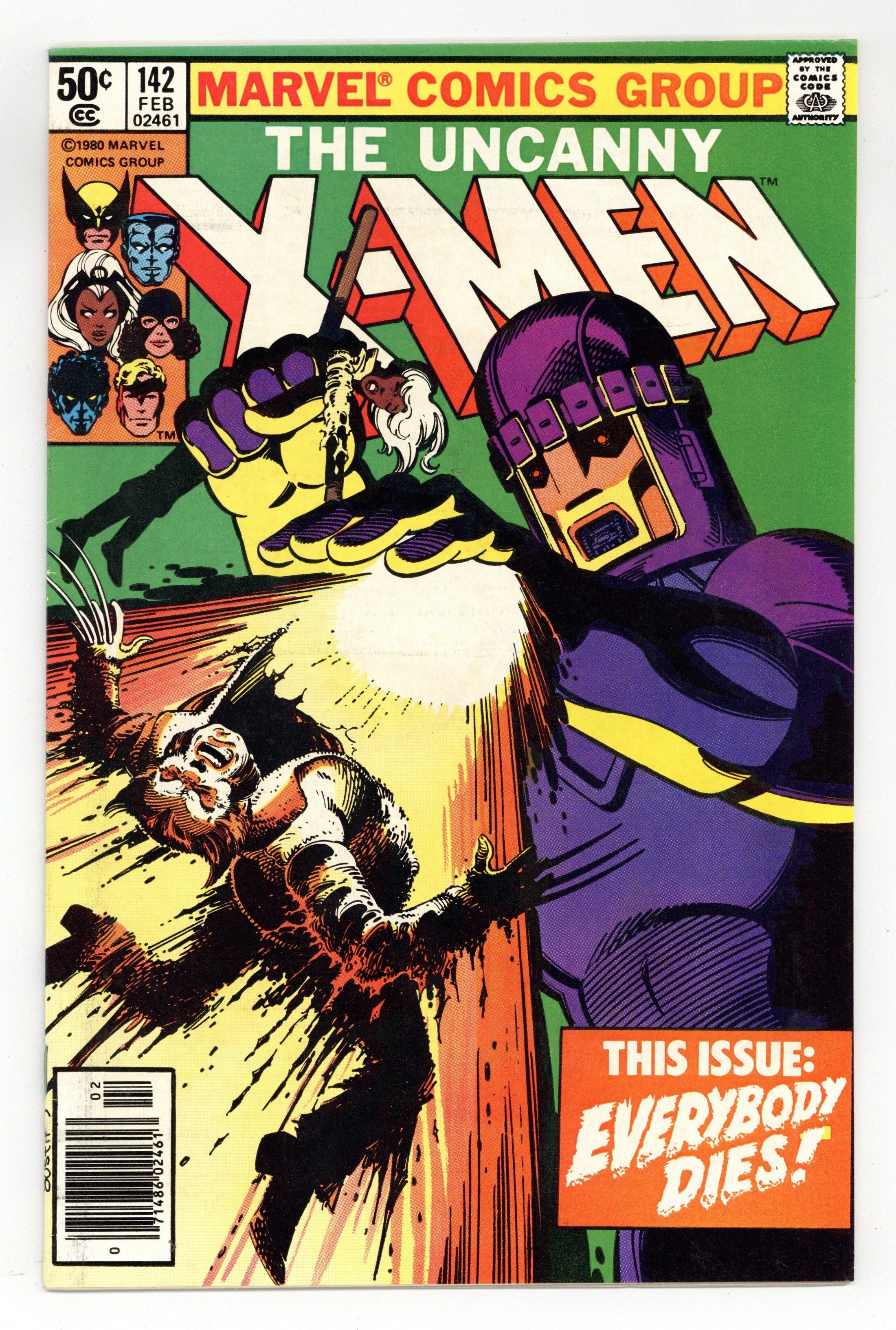 Newsstand Edition. Days of Future Past: Part 2 of 2. "Mind Out of Time!" Story by Chris Claremont and John Byrne. Art by John Byrne and Terry Austin. Cover by Terry Austin. In order to prevent a dystopian future where all mutants and super-heroes are hunted and killed by the robotic Sentinels, the X-Men must prevent the new Brotherhood of Evil Mutants from assassinating Senator Kelly. Featuring one of the most shocking death scenes in the comic book history. NOTE: Uncanny X-Men #123 and #142 are rare commodities in the realm of comics as they are two of the very few covers where inker extraordinaire Terry Austin actually does the pencils as well. - Odinson Lone Star Comics Archivist.36 pgs. Cover price $0.50.