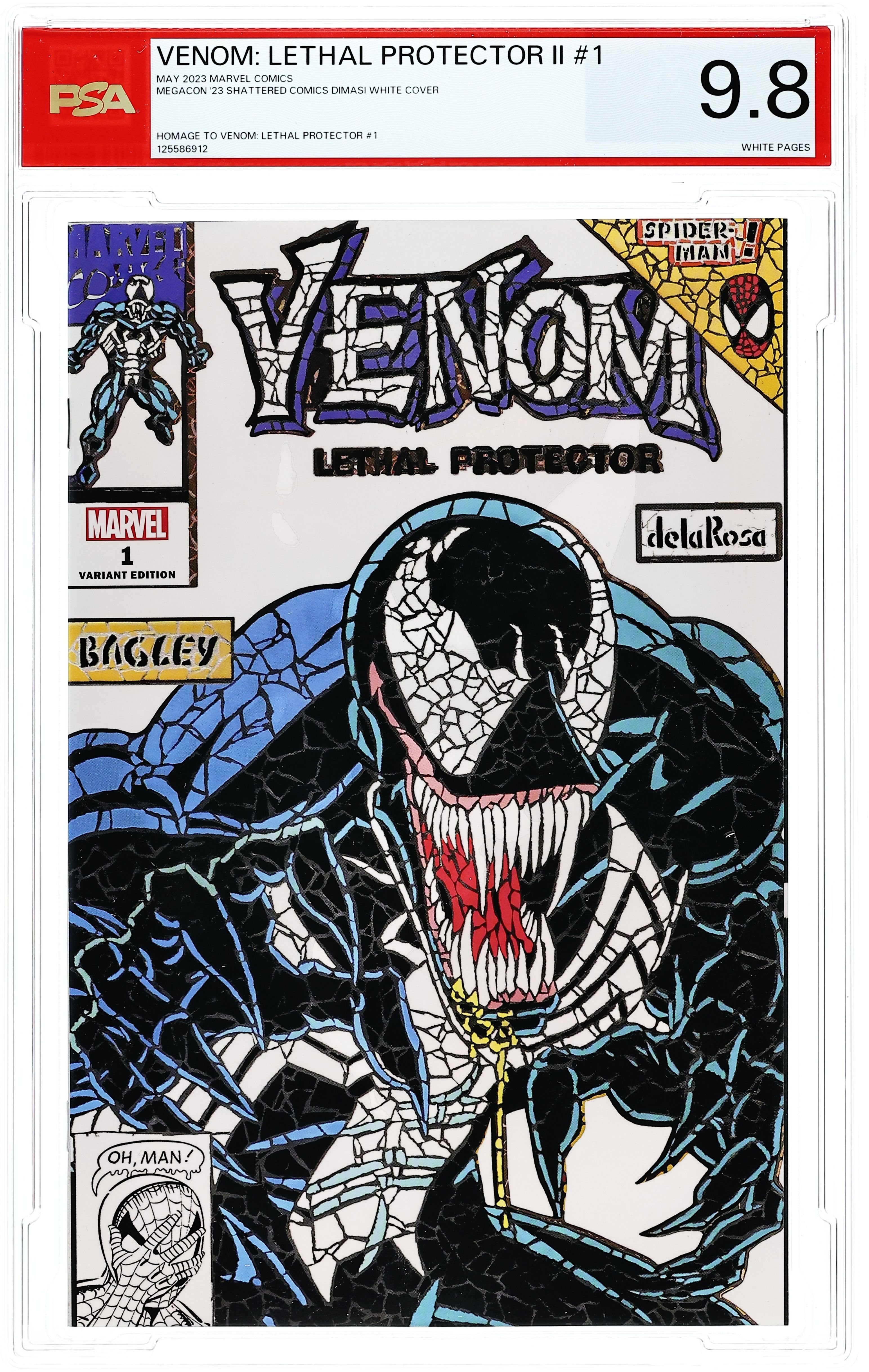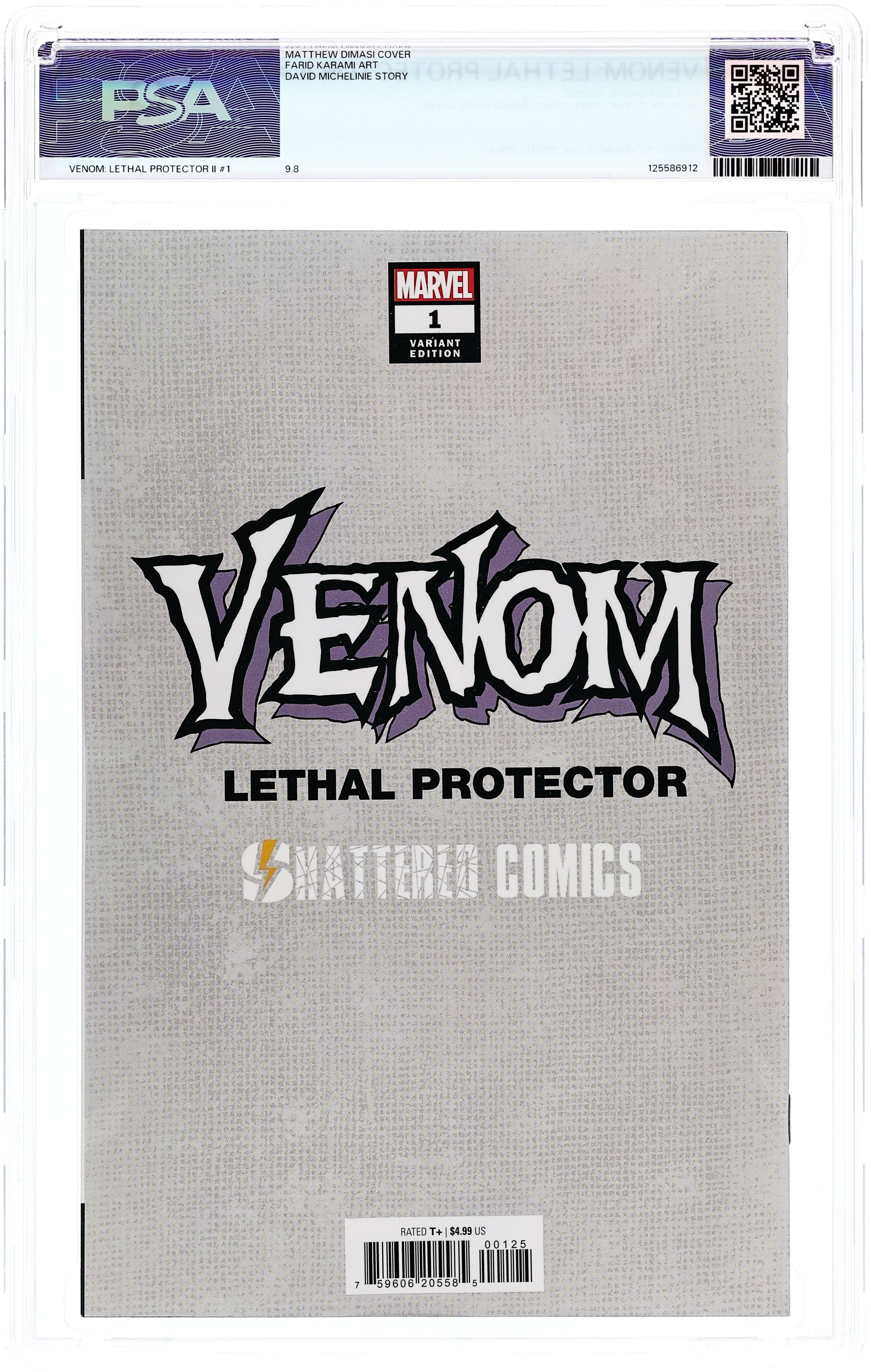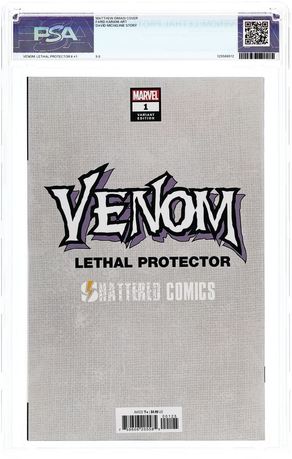 Shattered Comics Exclusive White Tile Mosaic Cover by Matt DiMasi. Written by David Michelinie. Art by Farid Karami. BROCK VS. DOOM. 'NUFF SAID! Venom co-creator DAVID MICHELINIE returns with a brand-new story set in the sinister symbiote's past when brains - and Spider-Man - were still on the menu! This time, he's uniting with rising star FARID KARAMI to weave an epic, blockbuster story that will take Venom from the streets of NYC to the kingdom of Latveria as EDDIE BROCK is challenged like never before! What (or WHO) will Venom need to overcome the fiercest foe in the Marvel U? One thing's for certain, this monster's bringing the mayhem! 40 pages, full color. Rated Teen+ Cover price $4.99.