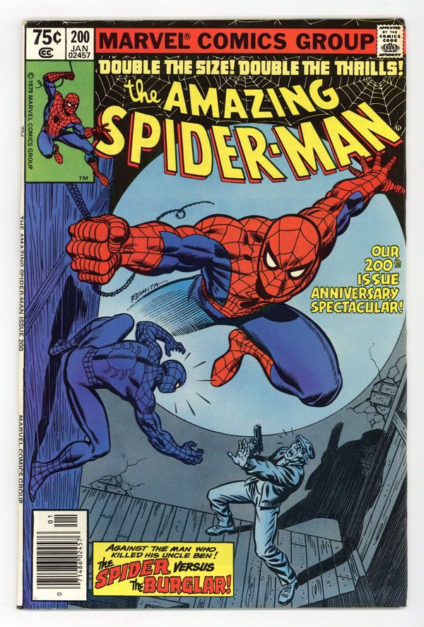 Starts Jan 19 Newsstand Edition. "The Spider and the Burglar...A Sequel" Script by Marv Wolfman. Art by Keith Pollard (breakdowns) and Jim Mooney (finishes). Cover by John Romita. It's the bicentennial issue of the Amazing Spider-Man! And the web-slinger is going back, all the way back, to the days of Amazing Fantasy 15 to once again confront the criminal that murdered his Uncle Ben! But this time Peter Parker will have to stop the killer without his spider powers! Given a second chance, can the wall-crawler right the wrongs from the past and save his beloved Aunt May? Emotions run at an all-time high for your friendly neighborhood Spider-Man! Brief retelling of Spider-Man's origin. Cameo appearance by Anna Watson. Final appearance of the burglar. Flashback cameo by Ben Parker. (Note: Stan Lee scripts the final page of the story.) 52 pgs. Cover price $0.75.