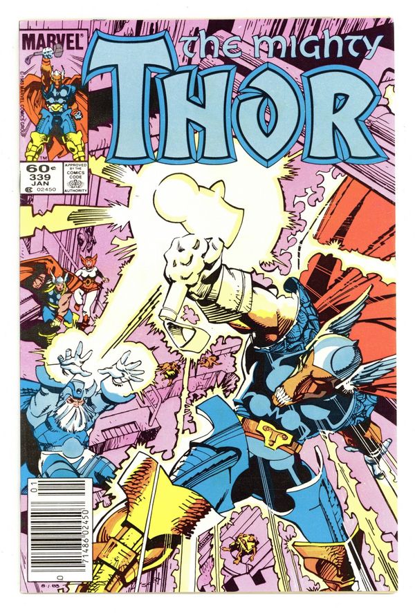 Tags: Marvel Legacy Numbering: Thor (part 339), Thor$15.00Newsstand Edition. Cover by Walt Simonson. "Something Old, Something New," script and art by Walt Simonson; Odin has the dwarves create a hammer for Bill and sends the alien and his son into space to rescue Bill's people. Appearances by Sif, Odin, and Volstagg. Bullpen Bulletins. Carlin and Simonson's Page O' Thor Stuff; Assistant editor's month shenanigans. Star Frontiers TSR ad. 36 pgs., full color. $0.60. Cover price $0.60.