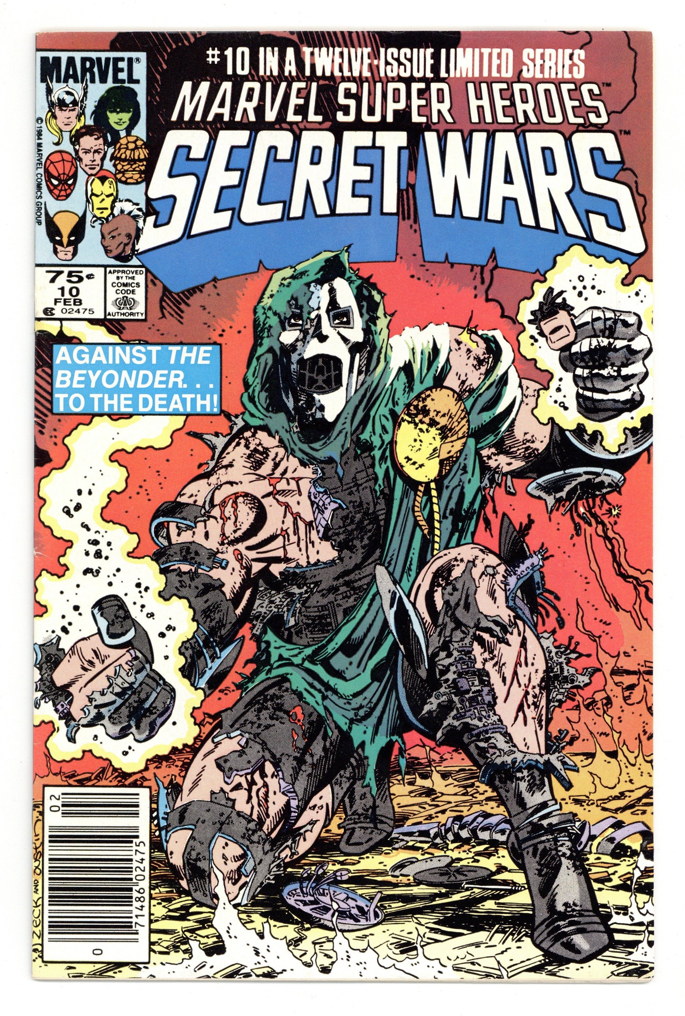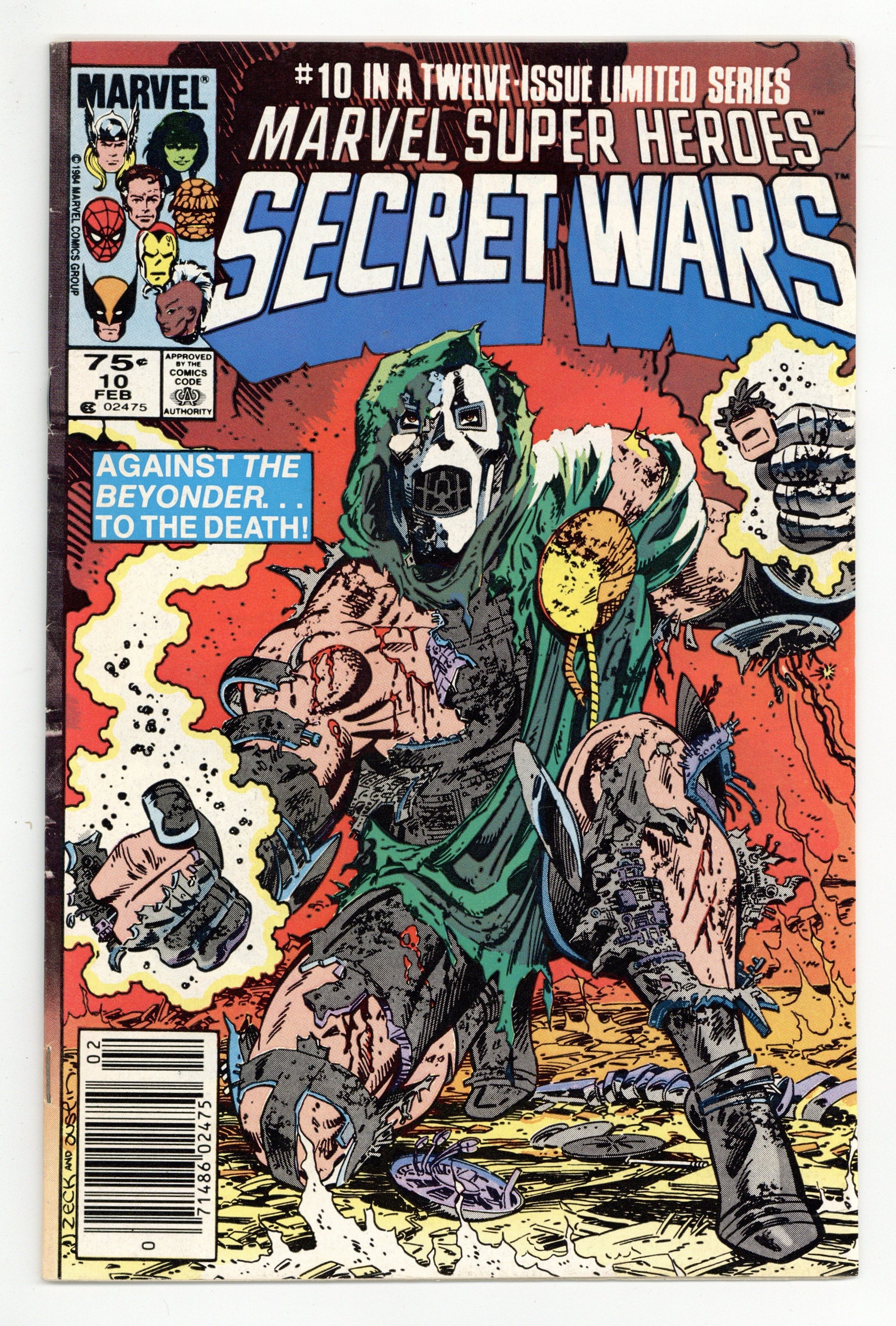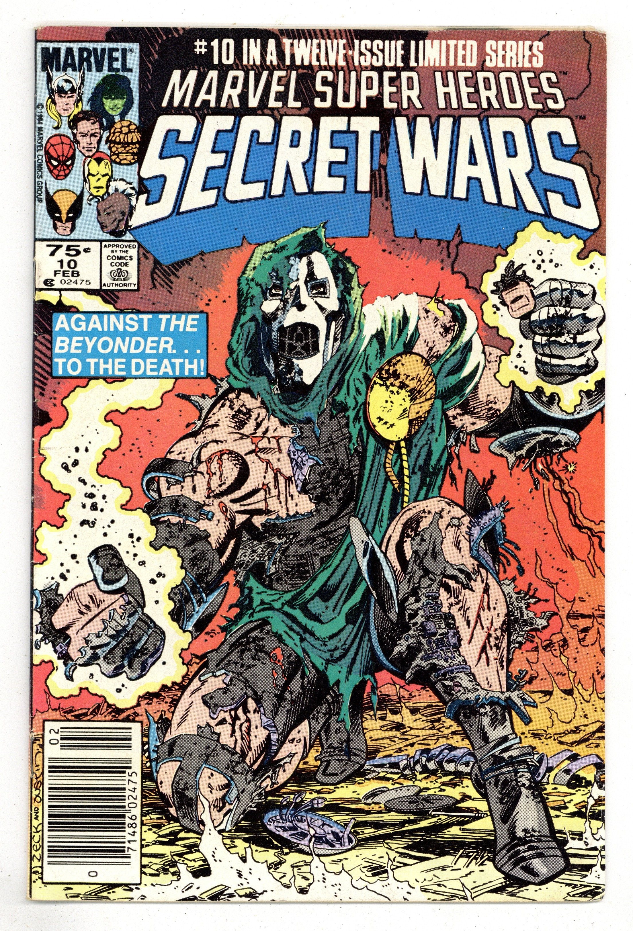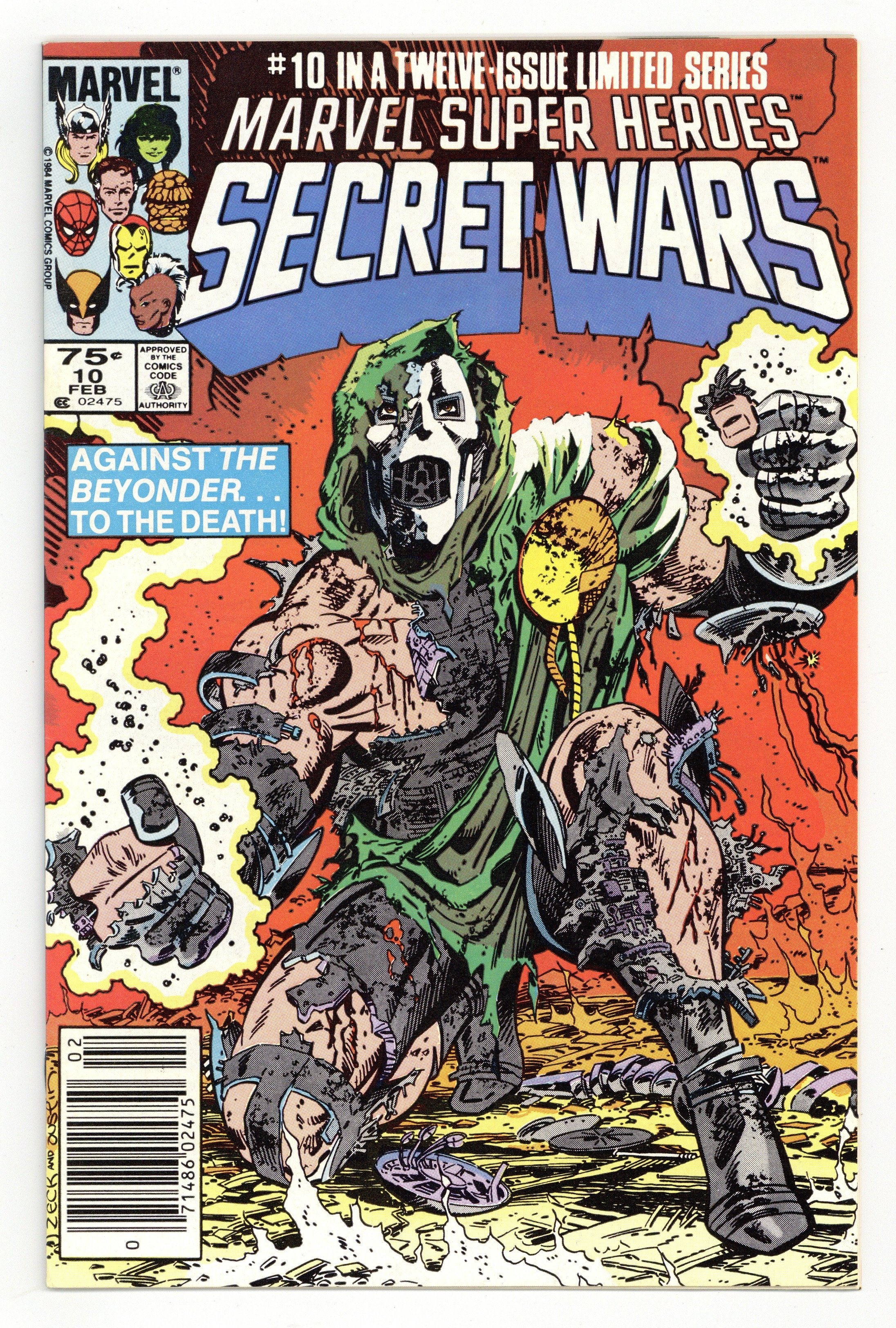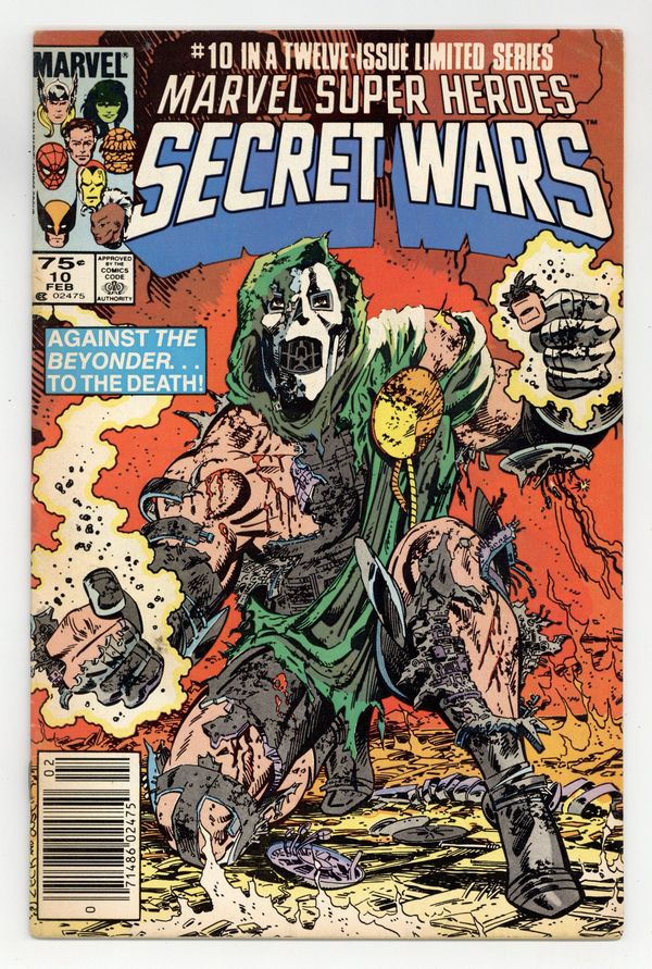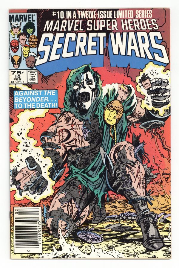 Newsstand Edition. "Death to the Beyonder!" Part 10 of 12. Story by Jim Shooter. Art by Mike Zeck and John Beatty. It's Doctor Doom vs. the Beyonder. The nefarious villain has stolen vast amounts of cosmic energy from mighty Galactus and now stands in defiance before the nigh omnipotent Beyonder. What follows is a battle that will rock the cosmos, and only one shall survive. 36 pages, full color. Cover price $0.75.