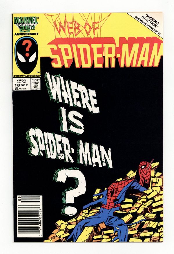 Newsstand Edition. Missing in Action: Part 4 of 4 - Venom makes his first appearance in "The Longest Road!" Story by David Michelinie. Art by Marc Silvestri and Kyle Baker. Spider-Man disappeared in the aftermath of the battle in Virginia vs. Magma. After being unaccounted for in both Amazing Spiderman 279 and Spectacular Spiderman 117, Peter Parker finally returns to New York City with a lot of explaining to do! He tells his story to Mary Jane. Also in this issue, Peter is pushed in front of a subway train by a mystery villain (later revealed to be Venom). 32 pages Cover price $0.75.