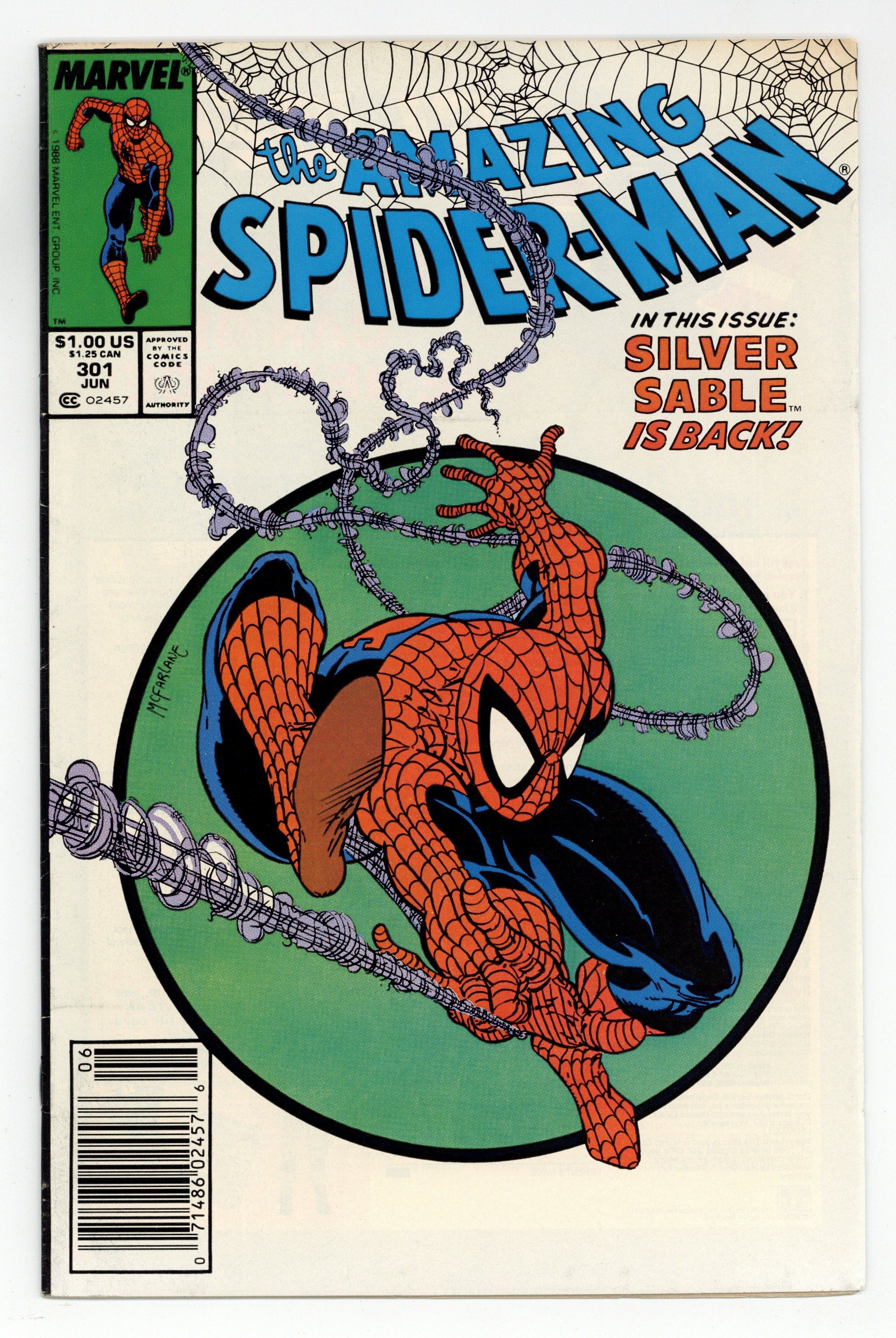 Newsstand Edition. "The Sable Gauntlet!" Guest-starring Silver Sable. Script by David Michelinie. Art by Todd McFarlane. Cover by Todd McFarlane. The first 300 issues of the Amazing Spider-Man are in the books after the web-slinger's epic battle vs. Venom last issue! And now the next chapter in the wall-crawler's anthology begins with an encounter with his favorite mercenary: Silver Sable! The enchanting sable agrees to make a test run through the security systems of a new high-rise office building, but deadly danger awaits on the top floor! Will Spidey catch the elevator in time? Cameo appearances by Mary Jane Watson and Dr. Morris Sloan. First $1.00 issue. (Notes: The cover is the same artwork (with different colors) as the cover to issue 300. This issue includes a full-page ad for the first appearance of Typhoid Mary in the Daredevil (1st) series -- art by John Romita Jr. and Al Williamson. The letters page contains a statement of ownership: average print run 469,913; average paid circulation 284,692.) 36 pgs. Cover price $1.00.