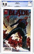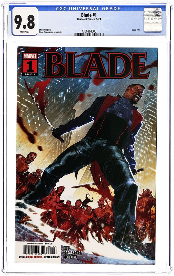 Written by Bryan Hill. Art by Elena Casagrande. Cover by Elena Casagrande. Marvel's slickest vampire hunter returns in a brand new ongoing by Bryan Hill (KILLMONGER) and Elena Casagrande (BLACK WIDOW)! True evil is patient. And a dark, ancient power has been simmering quietly for centuries…and when Blade himself is the one to unknowingly unleash it, Marvel's entire supernatural underworld will come out of hiding to demand he handle it. Or pay a pound of flesh for his mistakes. Bloodbaths, blackmail and Blade - you won't want to miss the explosive first issue of this new volume! 40 pages, full color. Rated Parental Advisory Cover price $4.99.