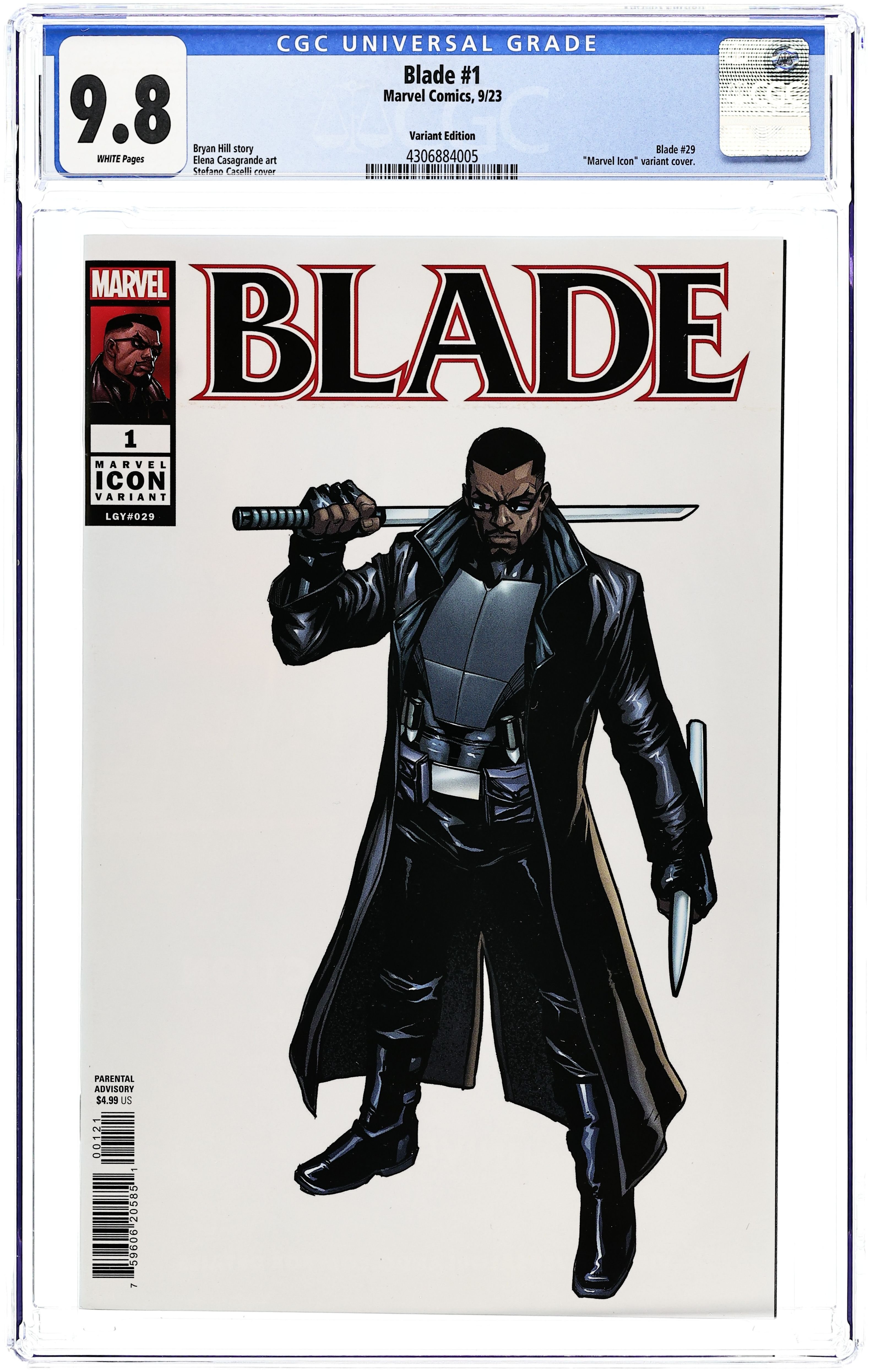 Written by Bryan Hill. Art by Elena Casagrande. Cover by Stefano Caselli. Marvel's slickest vampire hunter returns in a brand new ongoing by Bryan Hill (KILLMONGER) and Elena Casagrande (BLACK WIDOW)! True evil is patient. And a dark, ancient power has been simmering quietly for centuries…and when Blade himself is the one to unknowingly unleash it, Marvel's entire supernatural underworld will come out of hiding to demand he handle it. Or pay a pound of flesh for his mistakes. Bloodbaths, blackmail and Blade - you won't want to miss the explosive first issue of this new volume! 40 pages, full color. Rated Parental Advisory Cover price $4.99.
