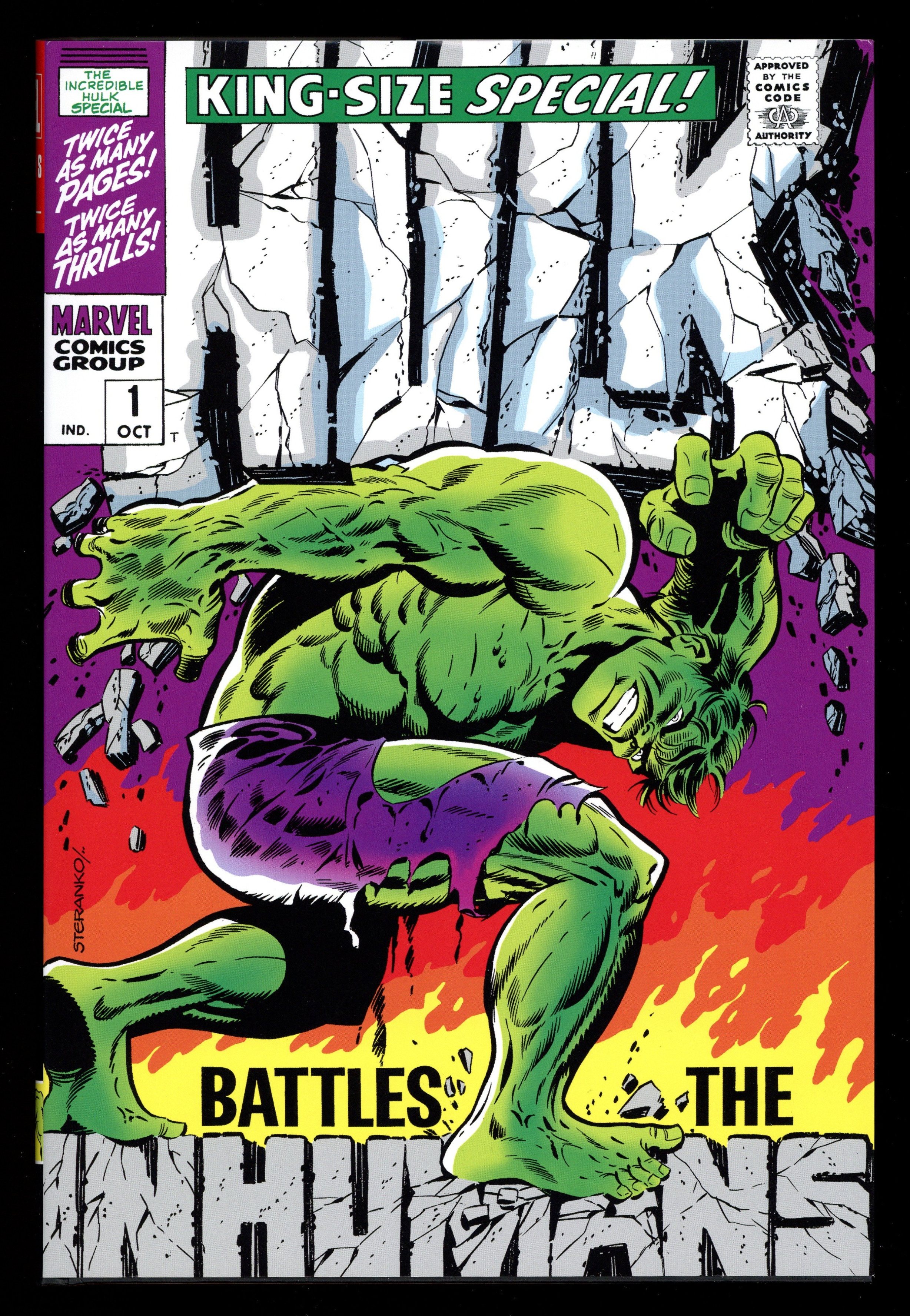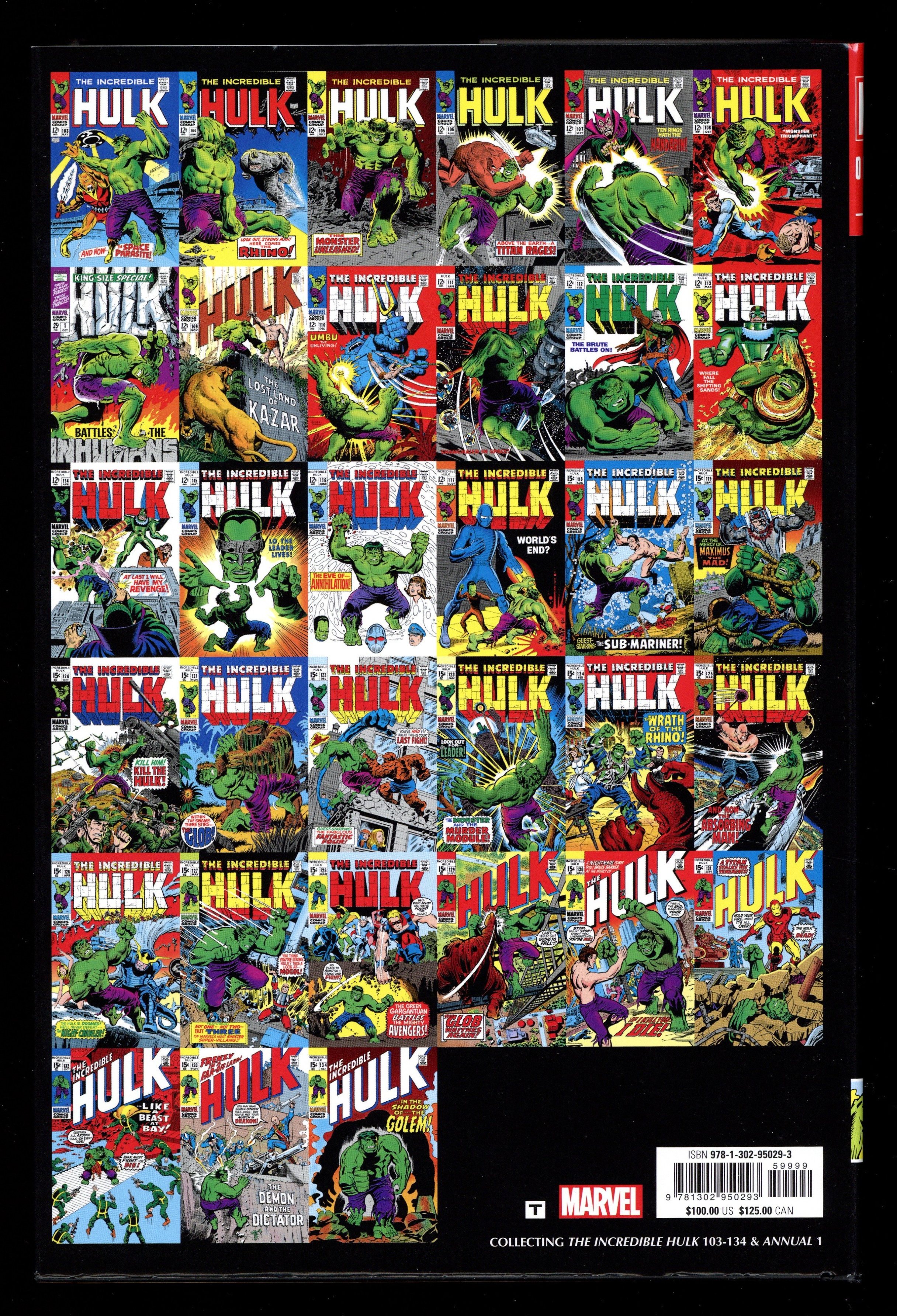 1st Edition - Volume 2 - 1st printing. Collects The Incredible Hulk (1962-1999 1st series) #103-134 and The Incredible Hulk (1962-1999 1st series) Annual #1. Written by Gary Friedrich, Bill Everett, Roy Thomas, Archie Goodwin, and Stan Lee. Art By Marie Severin, Herb Trimpe, Frank Giacoia, Sal Buscema, George Tuska, Syd Shores, John Severin, and Dan Adkins. Cover By Jim Steranko. Introduction by Herb Trimpe. Watch out, world! The Incredible Hulk is back - and even the oversized Omnibus format can barely contain him! Even with the extra space, the Hulk will shake the Earth with his mighty rage, traveling far and wide - and believe it or not, he won't make too many friends along the way! The green-skinned goliath's itinerary of destruction leaves the Inhumans, the Sandman, the Sub-Mariner, the Thing and the entire Savage Land rubbing a sore jaw. And when the Leader returns, all bets are off! Iconic HULK artist Herb Trimpe makes his debut in this very volume, and writers Stan Lee and Roy Thomas pull out all the stops! Featuring the original series' letters pages and a host of bonus material! Hardcover, 8 1/2-in. x 11-in., 832 pages, full color. Rated T Cover price $100.00.