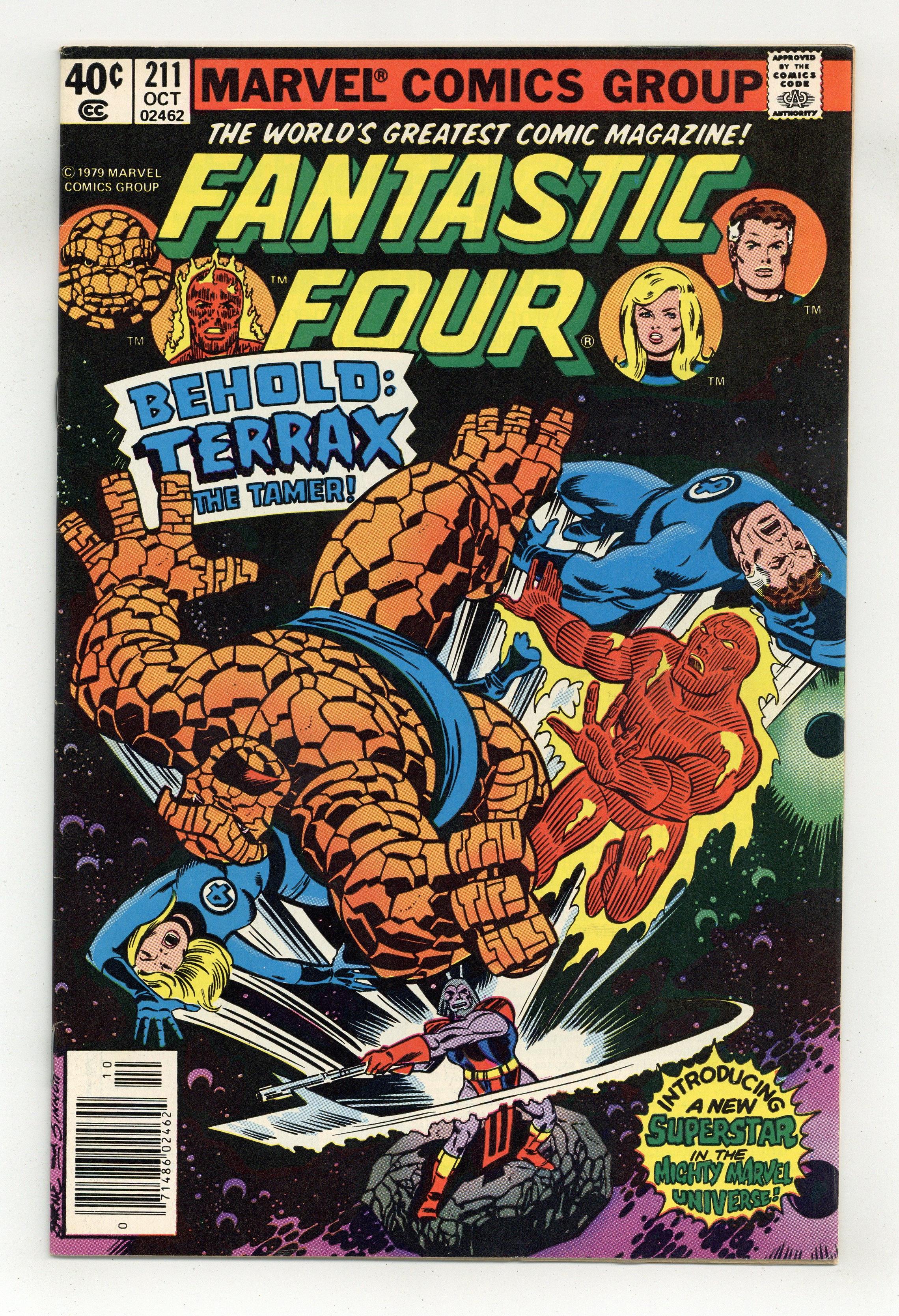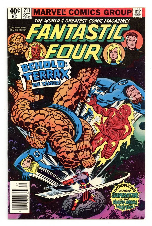 Newsstand Edition. 1st appearance of Terrax the Tamer - "If This Be Terrax" Written by Marv Wolfman. Pencils by John Byrne. Inks by Joe Sinnott. Cover by John Byrne and Joe Sinnott. Galactus sends the Fantastic Four to an alien plant to capture its tyrannical ruler named Tyros! Can the three aging members of the FF plus the Human Torch muster the strength to defeat Tyros? Cameo appearance by the Watcher and flashback appearances by the Silver Surfer, Air Walker, and Firelord. Note: First appearance of Terrax the Tamer. 36 pgs. Cover price $0.40.