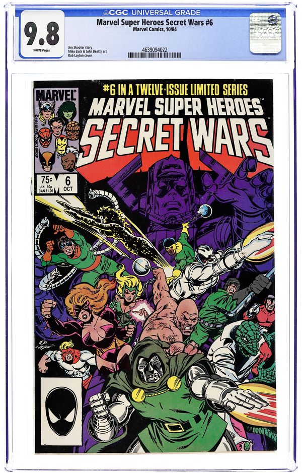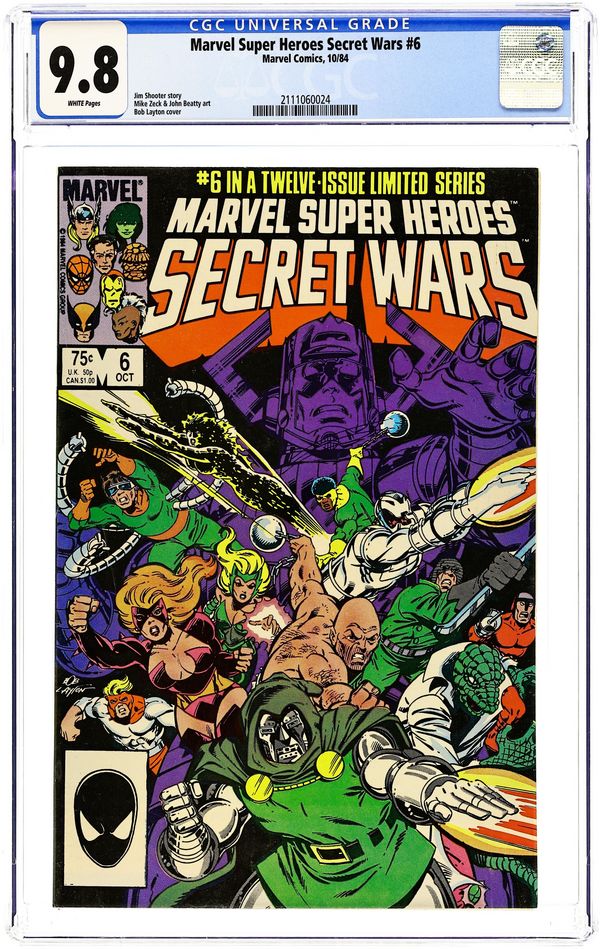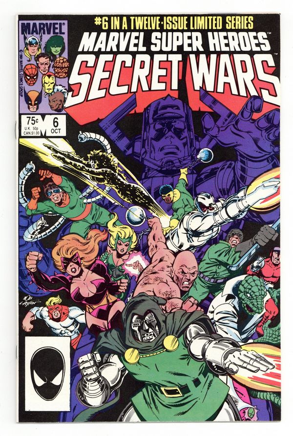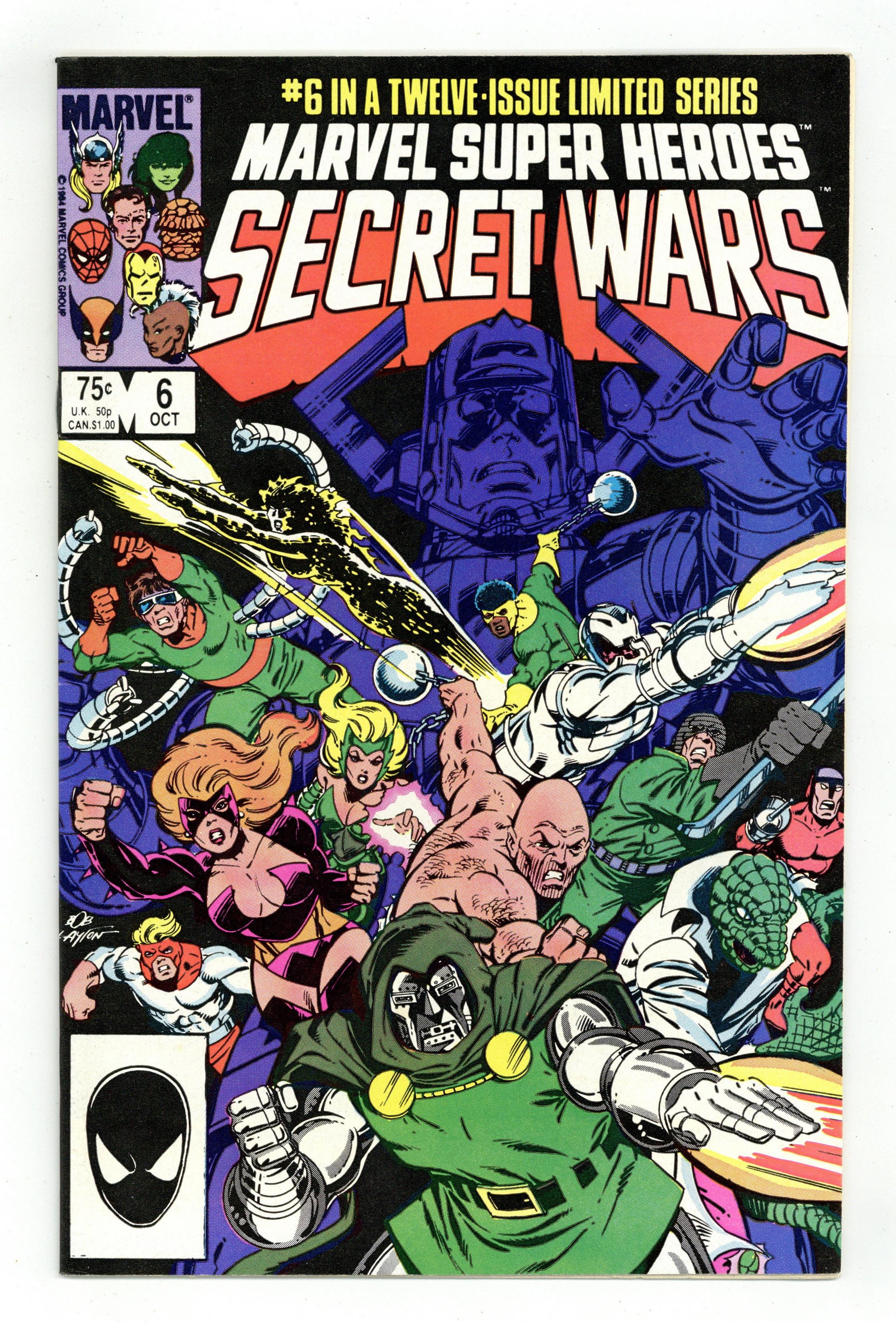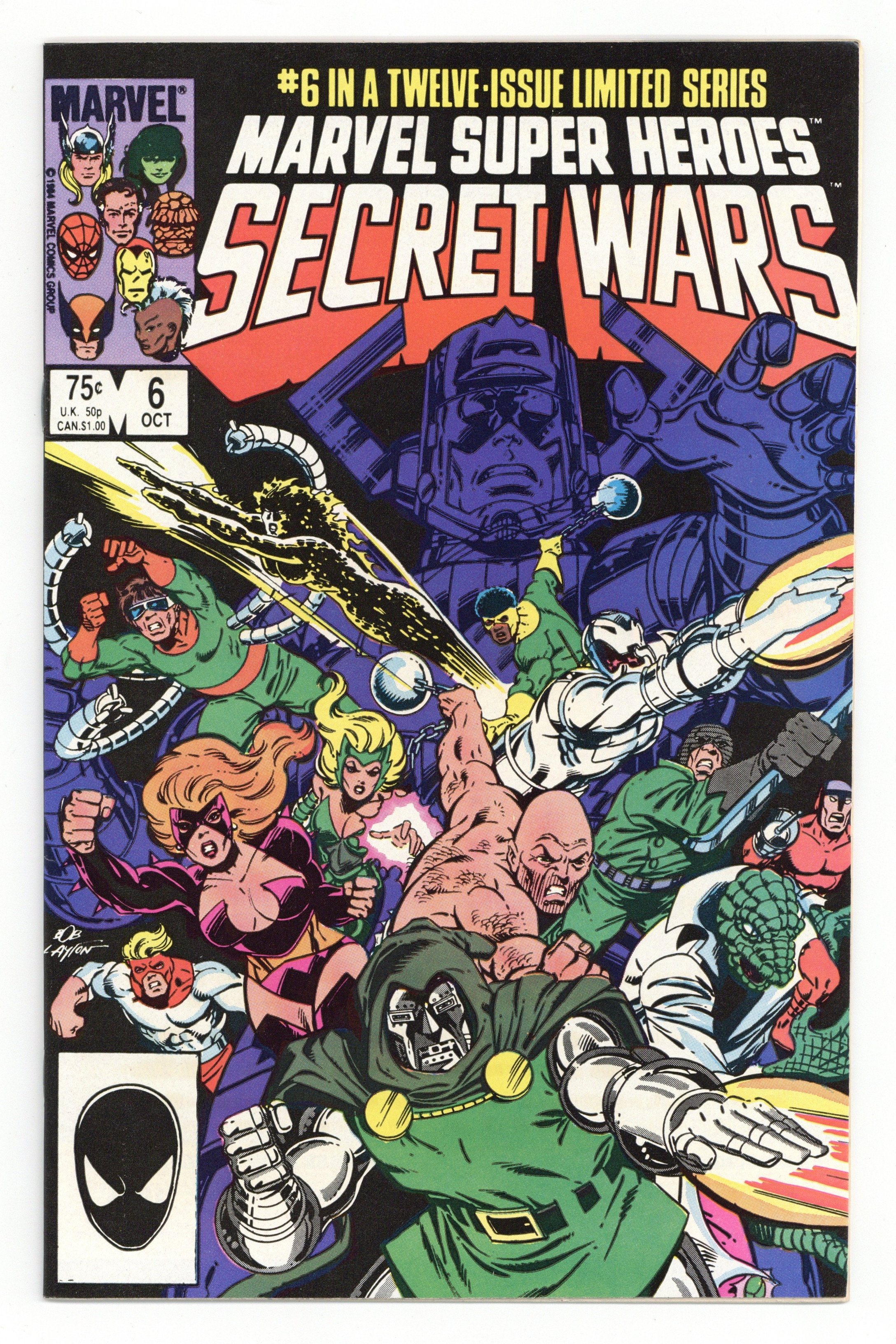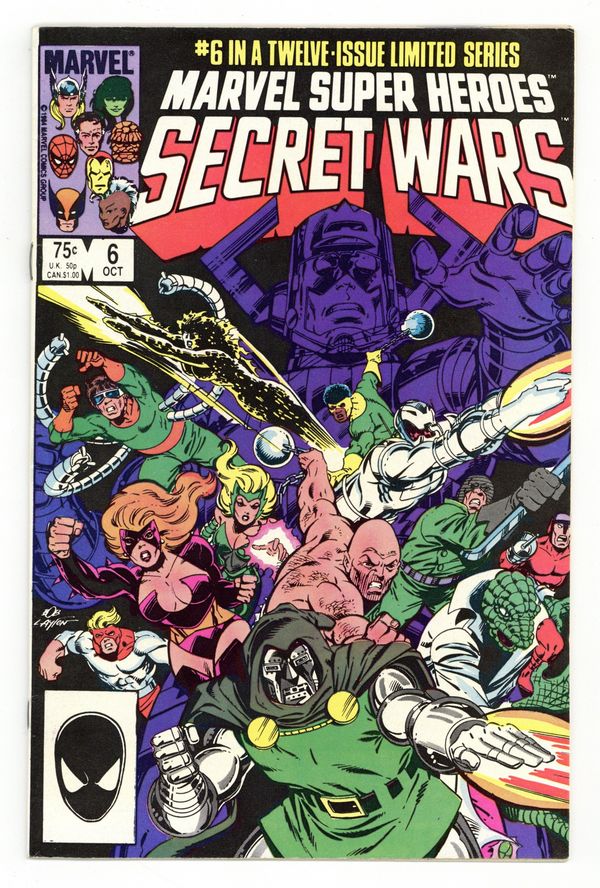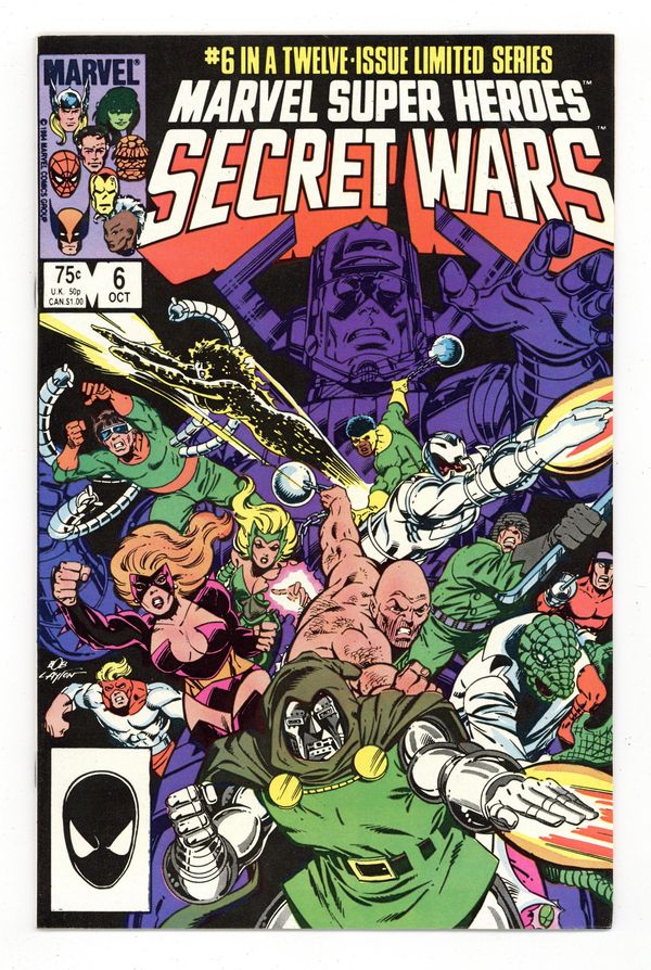 Tags: Hero/Villain Teams$15.00Direct Edition. "A Little Death...!" Part 6 of 12. Story by Jim Shooter. Art by Mike Zeck and John Beatty. As Doctor Doom continues to explore the massive homeworld of Galactus, he discovers the nefarious Klaw and recruits the sound-master to his cause. Meanwhile, the X-Men, Cyclops, Rogue, and Wolverine, battle for their lives against four of Marvel's deadliest villains, Doctor Octopus, Titania, Molecule Man, and the Absorbing Man. Plus, within these pages, the first casualty of war. 36 pages, full color. Cover price $0.75.