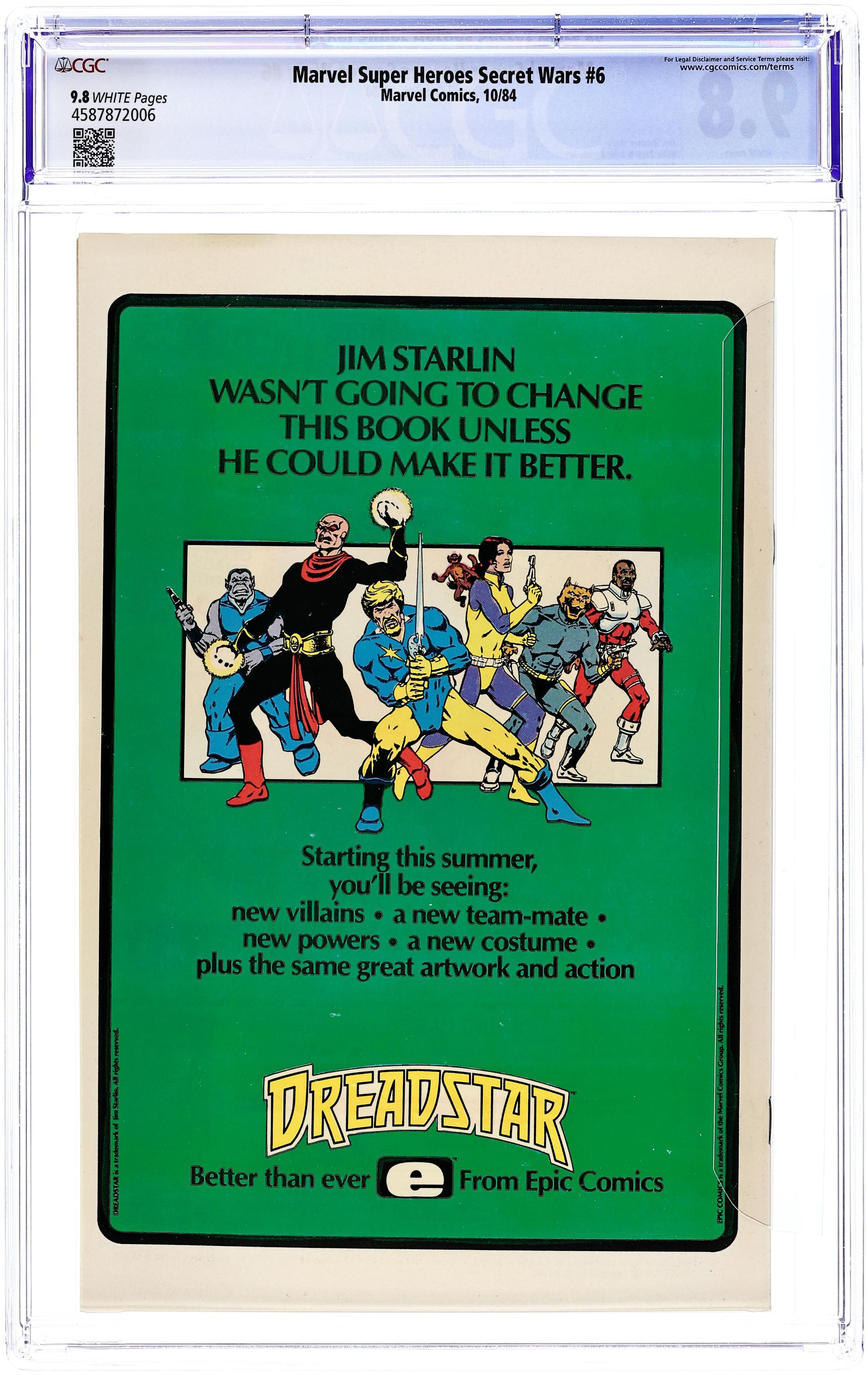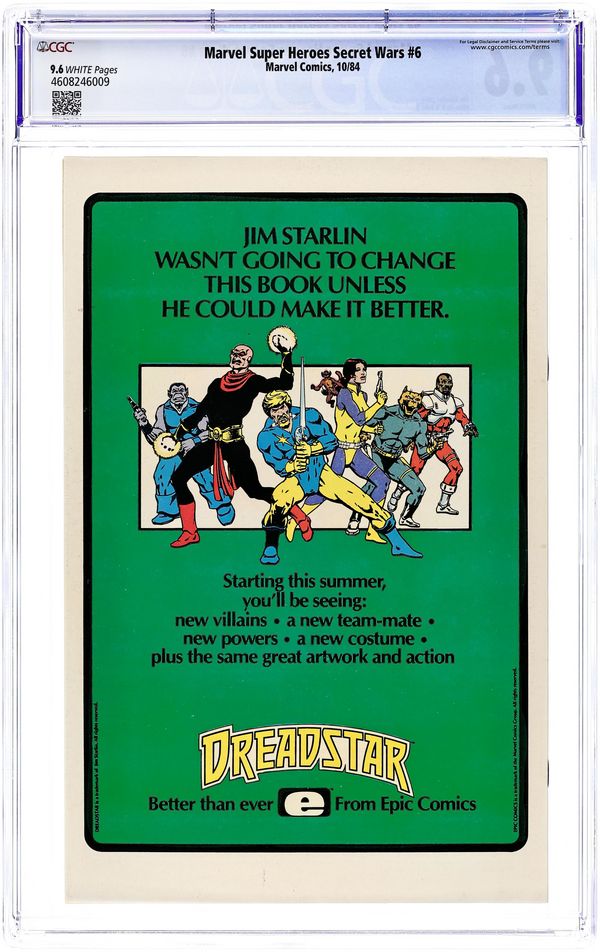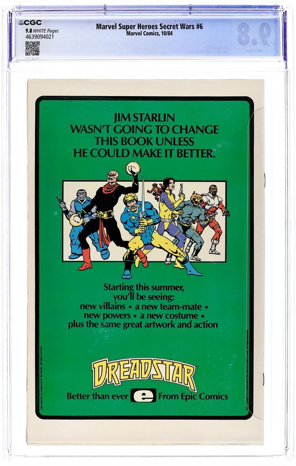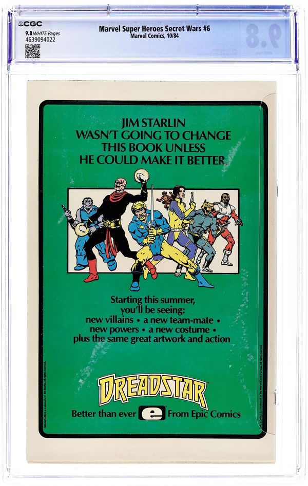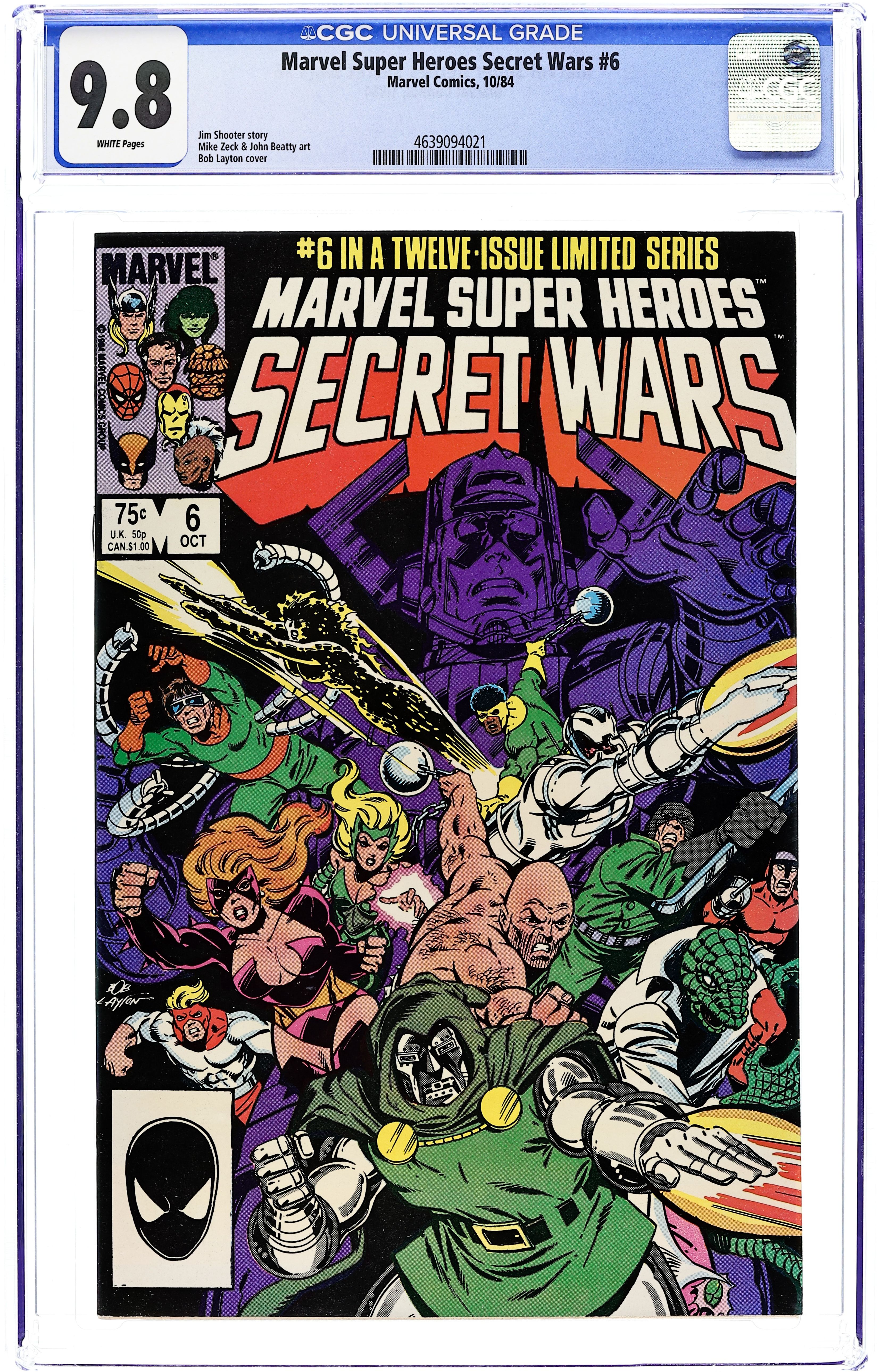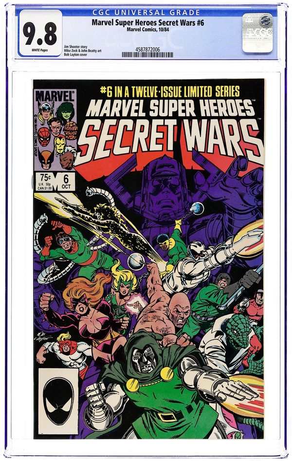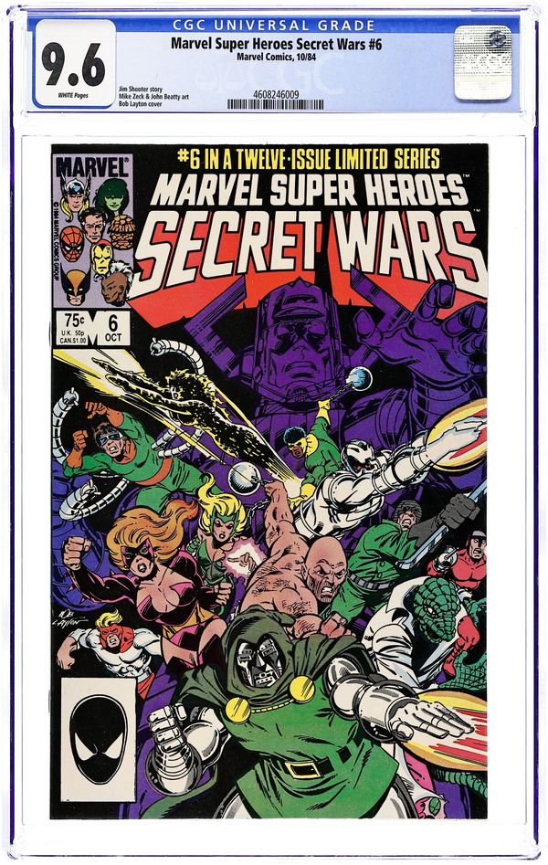 Tags: Hero/Villain Teams$15.00Direct Edition. "A Little Death...!" Part 6 of 12. Story by Jim Shooter. Art by Mike Zeck and John Beatty. As Doctor Doom continues to explore the massive homeworld of Galactus, he discovers the nefarious Klaw and recruits the sound-master to his cause. Meanwhile, the X-Men, Cyclops, Rogue, and Wolverine, battle for their lives against four of Marvel's deadliest villains, Doctor Octopus, Titania, Molecule Man, and the Absorbing Man. Plus, within these pages, the first casualty of war. 36 pages, full color. Cover price $0.75.