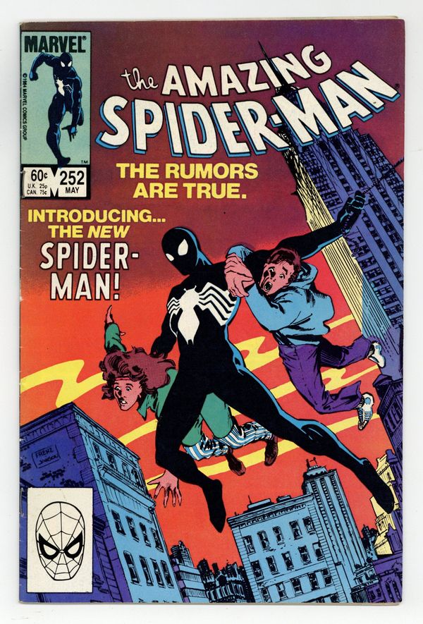 Starts Mar 2 Direct Edition. First appearance of Spider-Man's new black (alien symbiote) costume in "Homecoming!" Plot by Roger Stern. Script by Tom DeFalco. Pencils by Ron Frenz (breakdowns) and Brett Breeding (finishes). Cover by Ron Frenz and Klaus Janson. One of the landmark issues of the Amazing Spider-Man! With a brilliant flash of light in Central Park, the wondrous wall-crawler is back! And he looks a whole lot different! Wow, a new costume! What happened during the Secret Wars on the Beyonder's world? The ominous truth will be revealed to both the readers and the web-slinger in the days and weeks ahead! Cameo appearances by the Black Cat, Dr. Curt Connors, J. Jonah Jameson, Joe Robertson , Aunt May, Captain America, Captain Marvel, Hawkeye, Iron Man, Thor, and the Wasp. (Notes: Marvel Age 12 contained sketches of the new costume two months prior to the publication of this issue. Spidey's new costume was also unveiled in Marvel Team-Up 141 and Spectacular Spider-Man 90. The first issue of the (1984) Marvel Super Heroes Secret Wars Limited Series was published the same month as Amazing Spider-Man 252. The web-slinger discovers his new costume in issue 8 of the limited series. The Frenz-Janson cover is a tribute to the iconic cover of Amazing Fantasy 15. This story was reprinted in Marvel Tales 266. The letters page contains a statement of ownership: average print run 470,527; average paid circulation: 241,762. 36 pgs. Cover price $0.60.