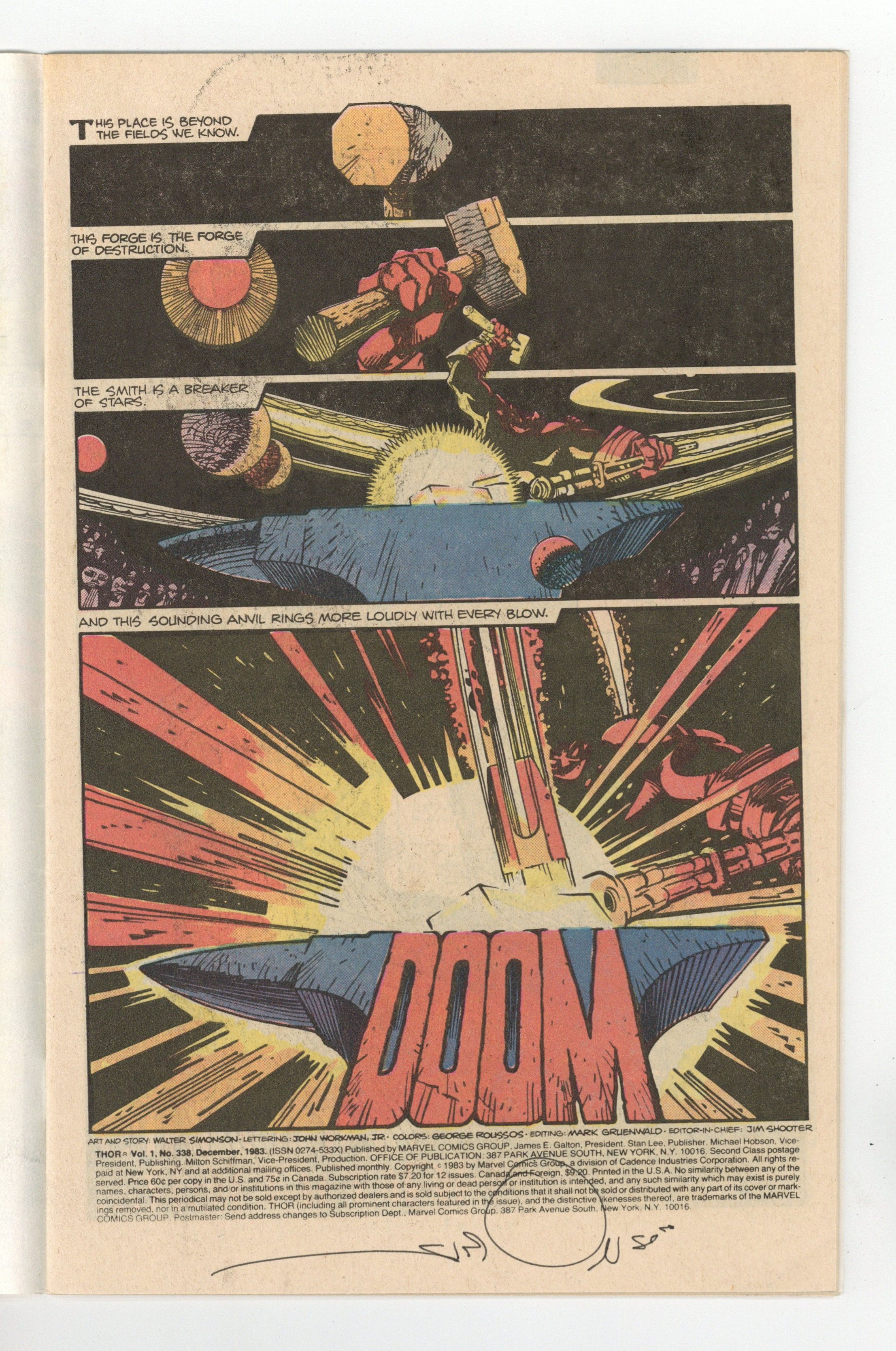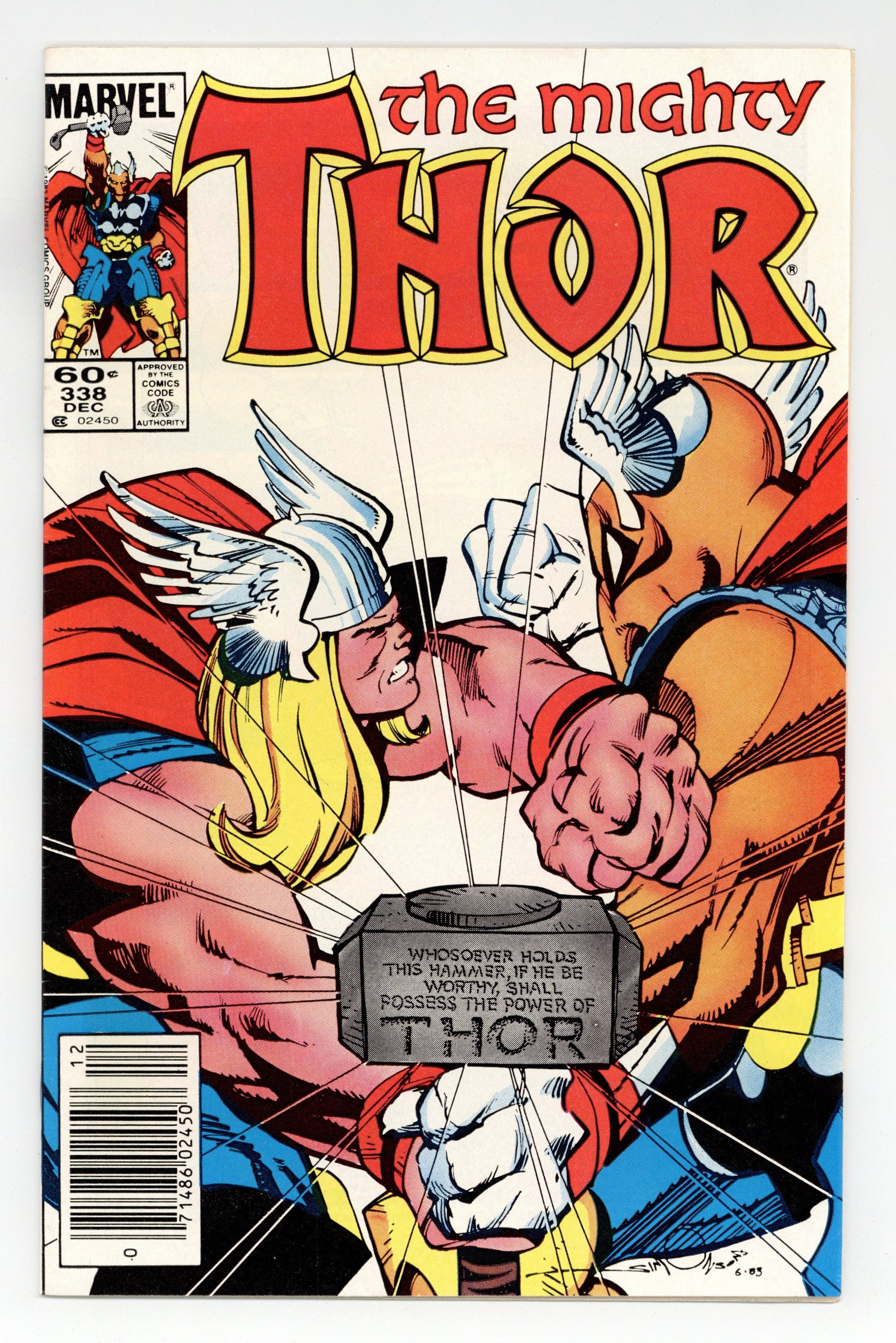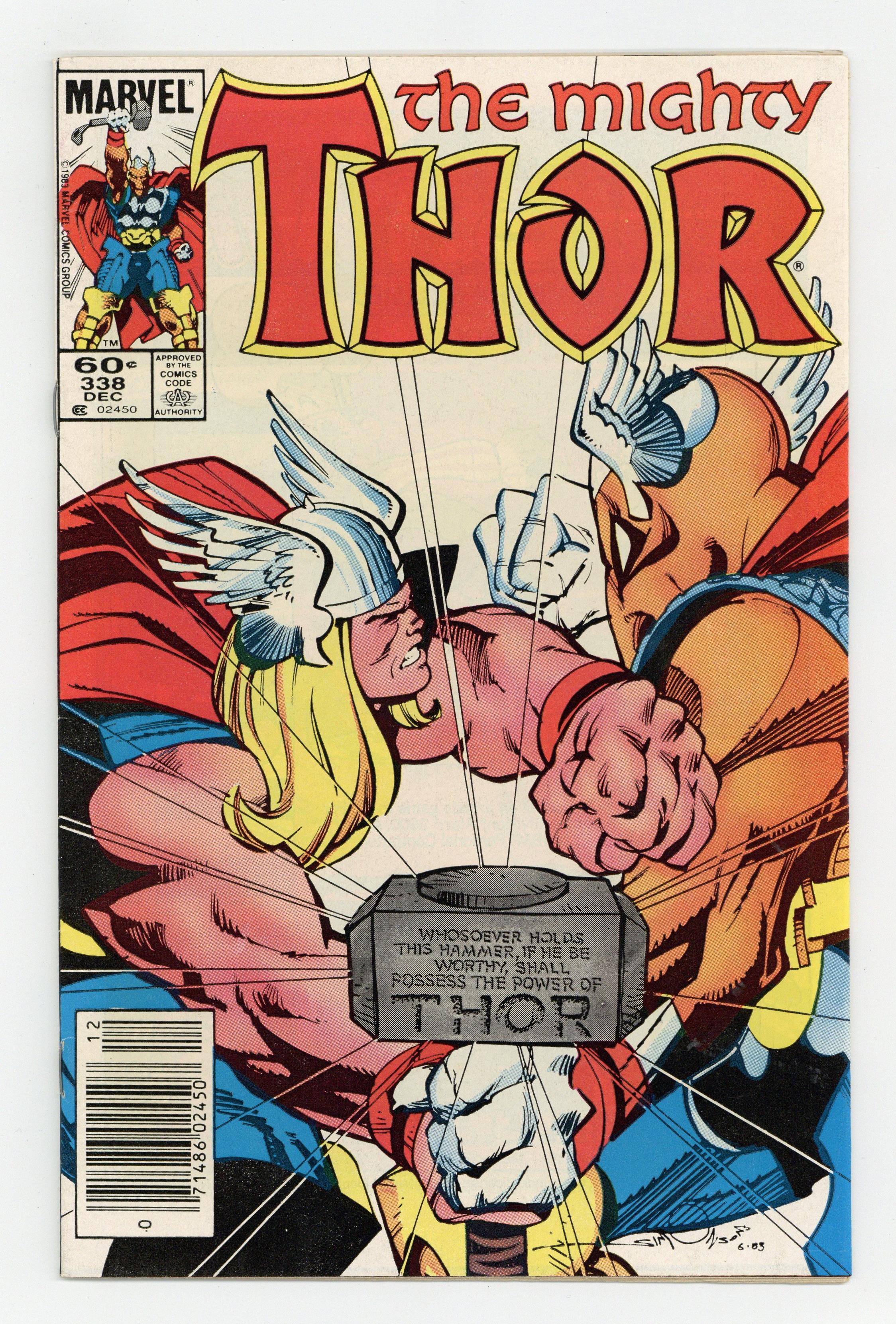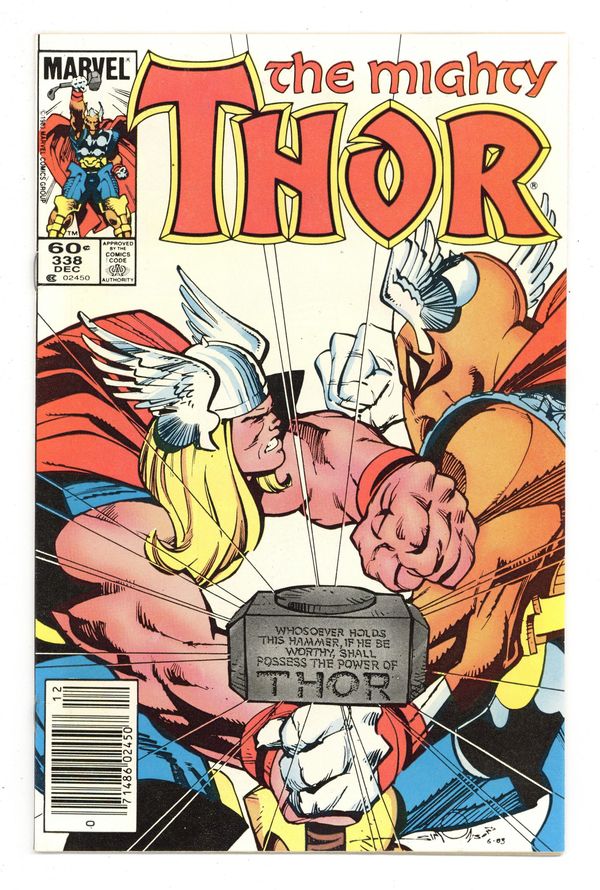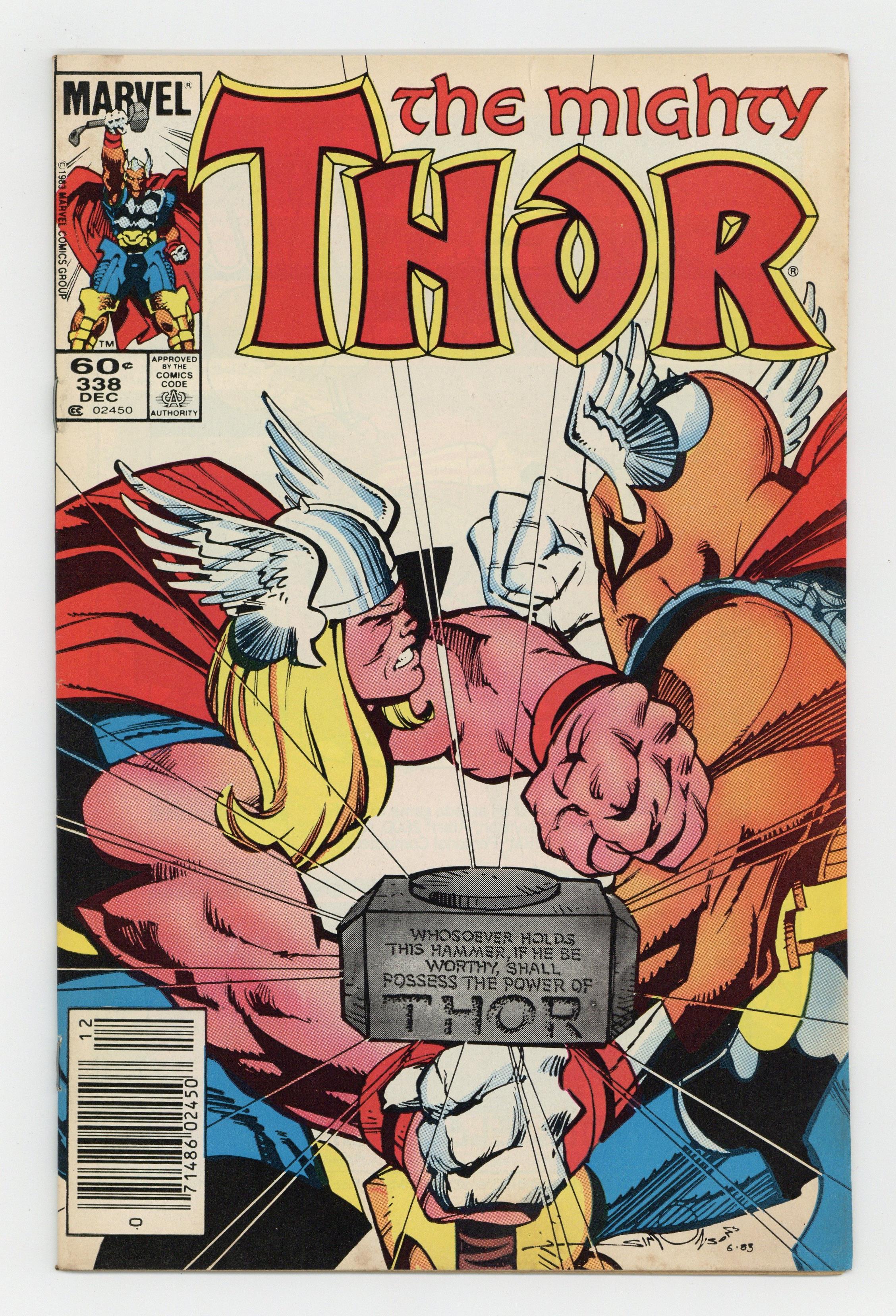 Starts Jan 3 Newsstand Edition. Cover by Walt Simonson. In Beta Ray Bill's second appearance, he comes to blows with Thor in "A Fool and His Hammer," script and art by Walt Simonson; Bill and Thor fight in single combat for the honor of wielding Mjolner and the alien bests the god of thunder. Brief appearances by Nick Fury, Odin, Sif, Loki, Balder, and Volstagg. Bullpen Bulletins. Star Frontiers TSR ad. 36 pgs., full color. $0.60. Cover price $0.60.