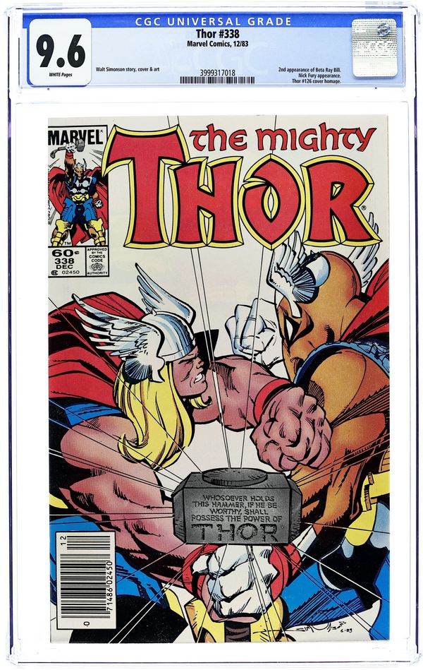 $8.60Newsstand Edition. Cover by Walt Simonson. In Beta Ray Bill's second appearance, he comes to blows with Thor in "A Fool and His Hammer," script and art by Walt Simonson; Bill and Thor fight in single combat for the honor of wielding Mjolner and the alien bests the god of thunder. Brief appearances by Nick Fury, Odin, Sif, Loki, Balder, and Volstagg. Bullpen Bulletins. Star Frontiers TSR ad. 36 pgs., full color. $0.60. Cover price $0.60.