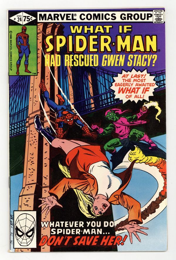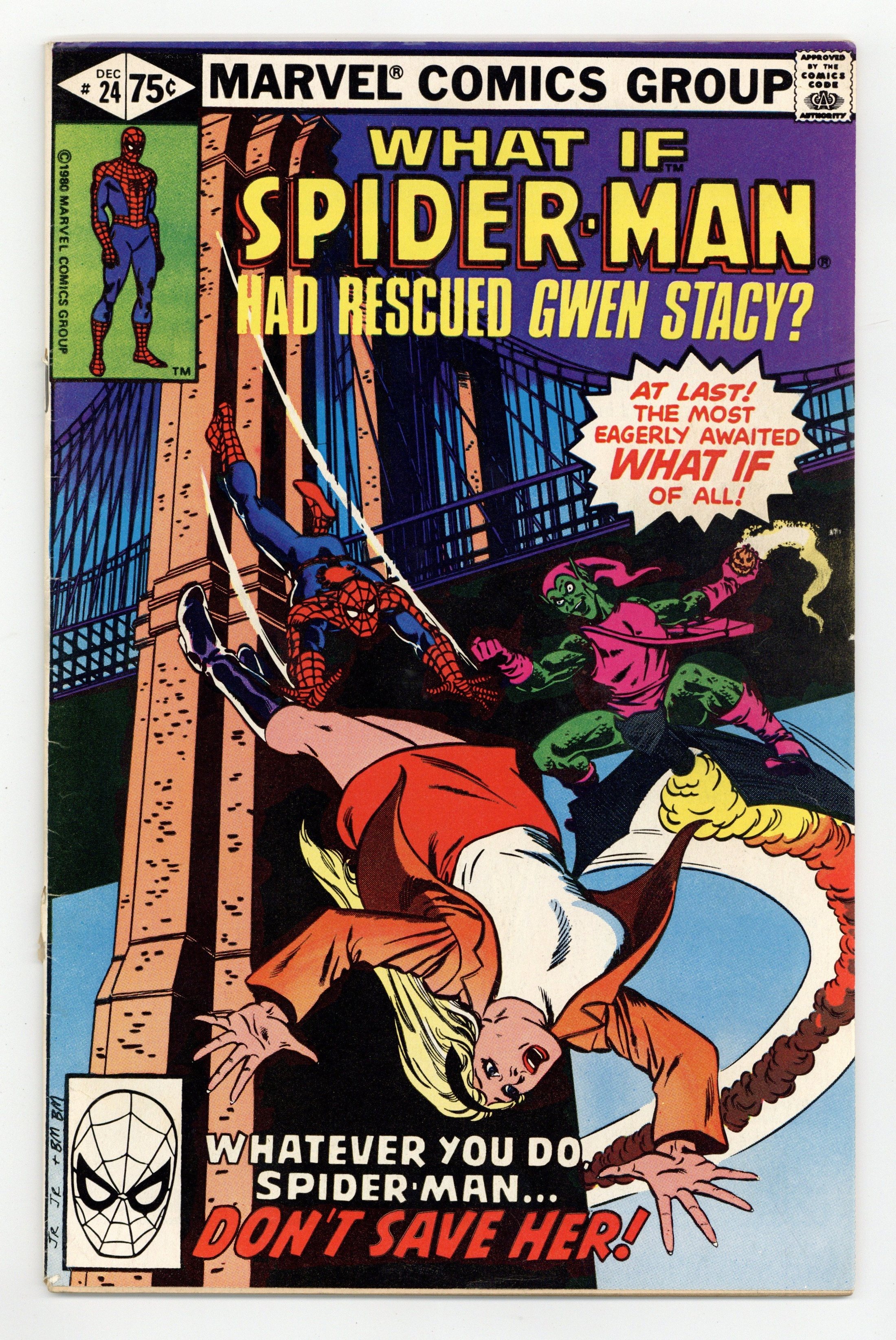 Direct Edition. "What If... Gwen Stacy had Lived?" Script by Tony Isabella. Art by Gil Kane (breakdowns), Frank Giacoia (finishes), Carl Gafford (assists), Peter Poplaski (assists), Ron Zalme (assists), and Joe Albelo (assists). Cover by John Romita Jr. and Bob McLeod. In the landmark story in Amazing Spider-Man 121 & 122, Gwen Stacy died during Spider-Man's heroic battle vs. the Green Goblin atop the Brooklyn Bridge. Many times since both the web-slinger and his fans have wondered how different Peter Parker's life would have turnedout if Gwen had lived. In this issue the Watcher presents an alternate reality in which Spider-Man saves Gwen. After the Green Goblin knocks Gwen off the bridge, the wall-crawler jumps from the support column to catch her with his arms instead of his webbing! And in spectacular fashion, Spider-Man grabs his girlfriend before they hit the water! Upon returning to safe ground, Peter proposes... and Gwen accepts! Later on the web-spinner tracks down the Green Goblin and (with help from Harry) convinces him to surrender! Everything is going great for the Amazing Spider-Man! Several weeks later Peter and Gwen exchange wedding vows! But at the end of their ceremony, J. Jonah Jameson barges in with breaking news! Very damning news for one Peter Parker! As the cover caption forewarns... sometimes the past is best left in the past. Cameo appearances by Joe Robertson, Flash Thompson, Betty Brant, Ned Leeds, and Aunt May. Backup story: "The First Eternals!" Script by Ralph Macchio. Art by Rich Buckler (breakdowns) and Chic Stone (finishes). (Note: Both stories were reprinted in 2007 in the trade paperback: What If? Classic 4.) 52 pages. Cover price $0.75.
