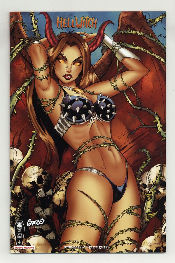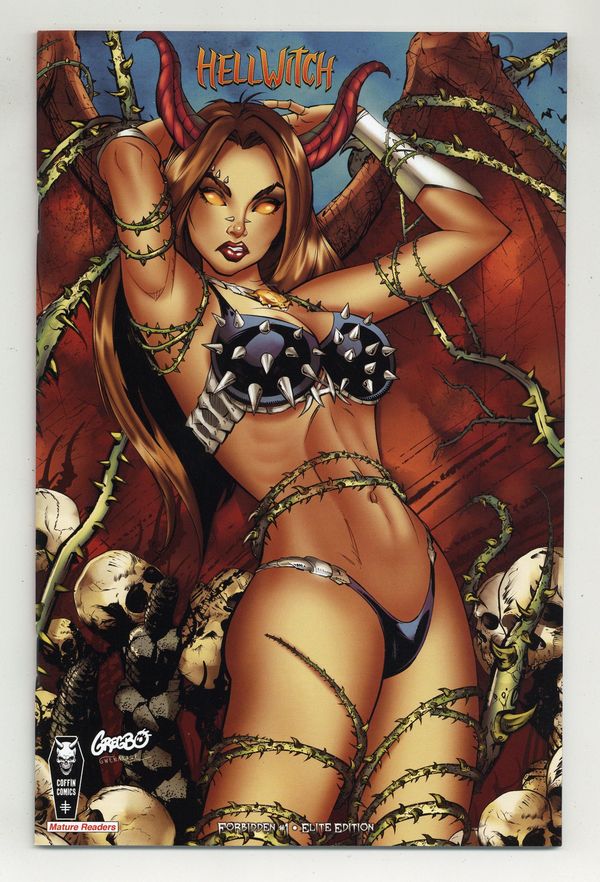 Published by Coffin Comics.$9.00Limited 1 for 10 Retailer Incentive Variant Cover. Written by Mike MacLean, Brian Pulido. Art by Diego Bernard. Cover by Gregbo Watson. Chapter 5 of Hellwitch's story. Hellwitch awakens to find herself with a motley crew of Hellbourne. While making their escape, the crew crashes in Norway's shadowy northern wilderness. Soon, they discover that they are not alone! The forest is home to a creature from forbidden folklore - a creature, bolstered by Lady Death's DNA. Hellwitch, wounded and standed, must make a desperate gamble. Once she fought for power and revenge and now there is only survival! NOTE: For every 10 copies of 'Hellwitch: Forbidden #1' ordered and received in any combination, retailers will qualify to order a Gregbo Watson 'Elite' edition at the net cost of $8.99. 48 pages, full color. Rated M Cover price $8.99.