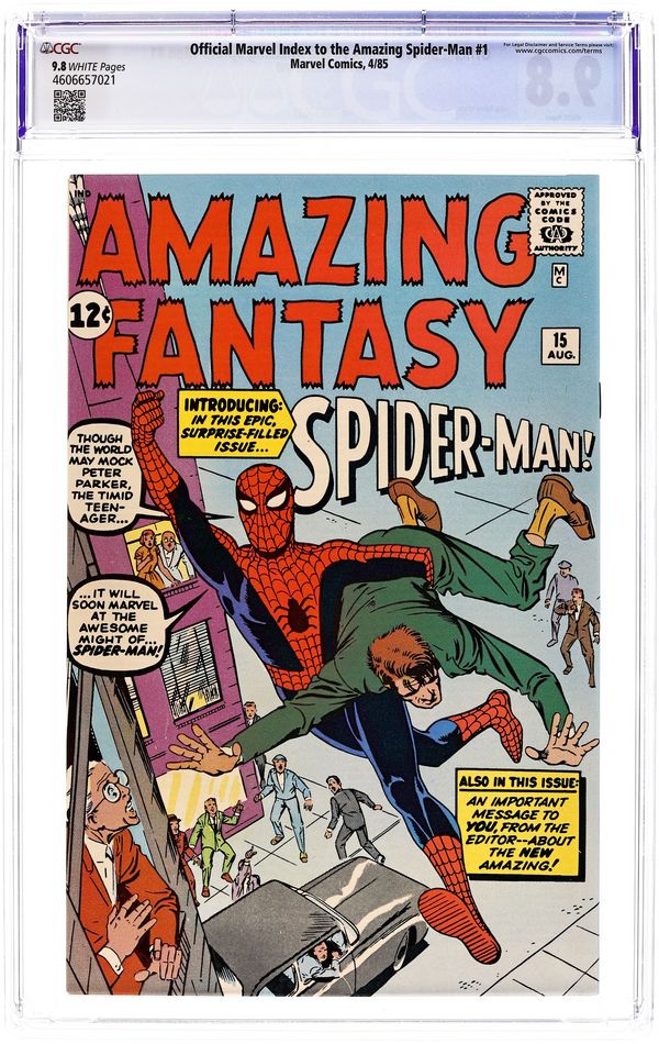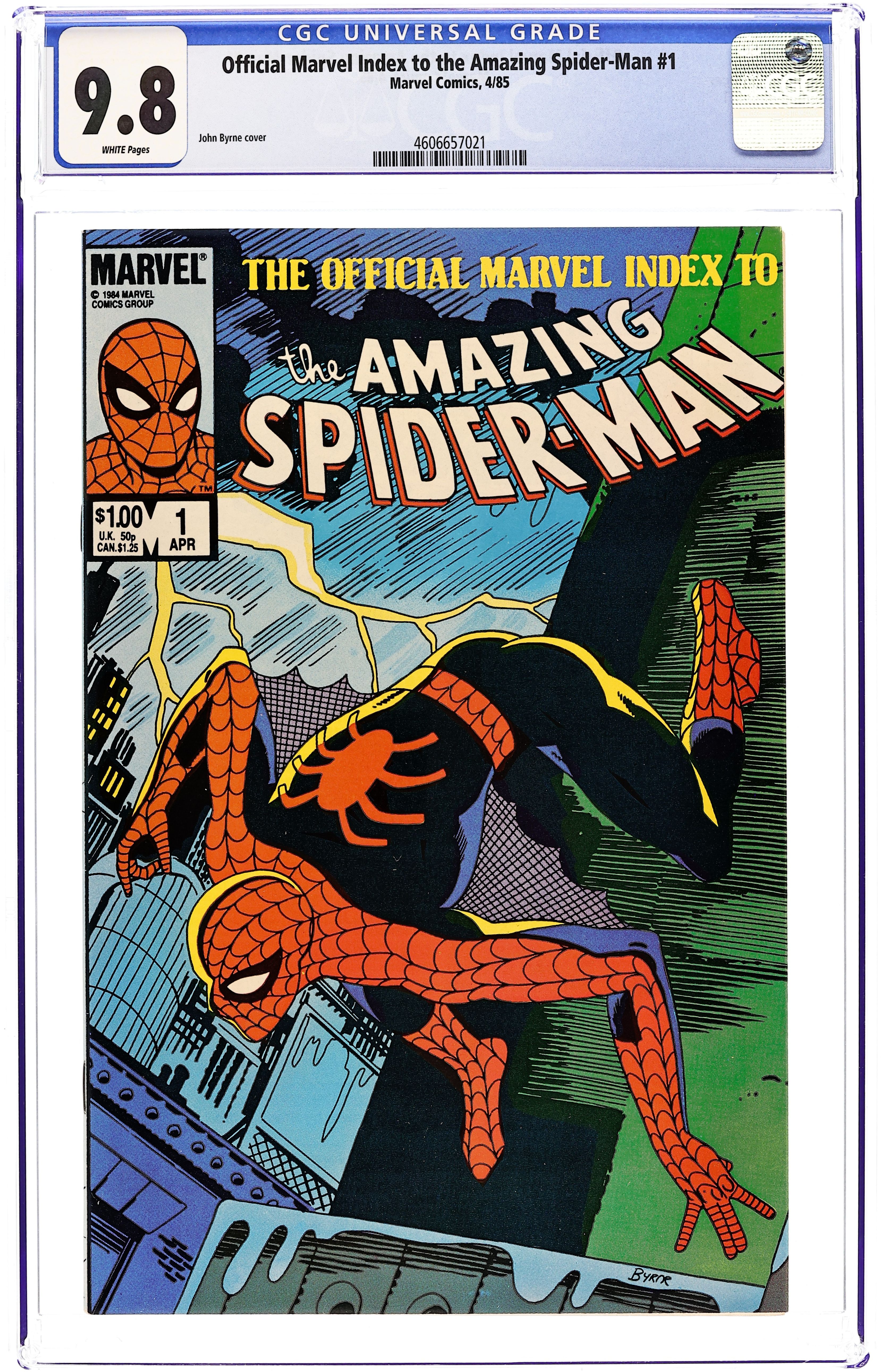 This issue covers Amazing Fantasy 15 and Amazing Spider-Man (1st series) 1 thru 29 and Annuals 1 and 2. Each issue reviewed in the index has a one-page summary and a reduced-size reprint of the original cover. Index contributors and consultants include George Olshevsky, Mark Gruenwald, Mark Evanier, Dennis Mallonee, Lou Mougin, Murray Ward, and Peter Sanderson. Cover by John Byrne. The cover portrays the Amazing Spider-Man as he was first drawn by Steve Ditko in the silver age. The back cover by Steve Ditko is the original version of the cover to Amazing Fantasy 15. The splash page features an essay on the background of the Amazing Fantasy title and reduced-size versions of the splash pages from Amazing Fantasy 15 and Amazing Spider-Man 1 respectively. The back inside cover describes the plan and purpose for the Marvel Index series. (Notes: There are nine issues in the Amazing Spider-Man Index, which was the first index series published by Marvel. The index issues do not contain any ads.) 32 pages Cover price $1.00.