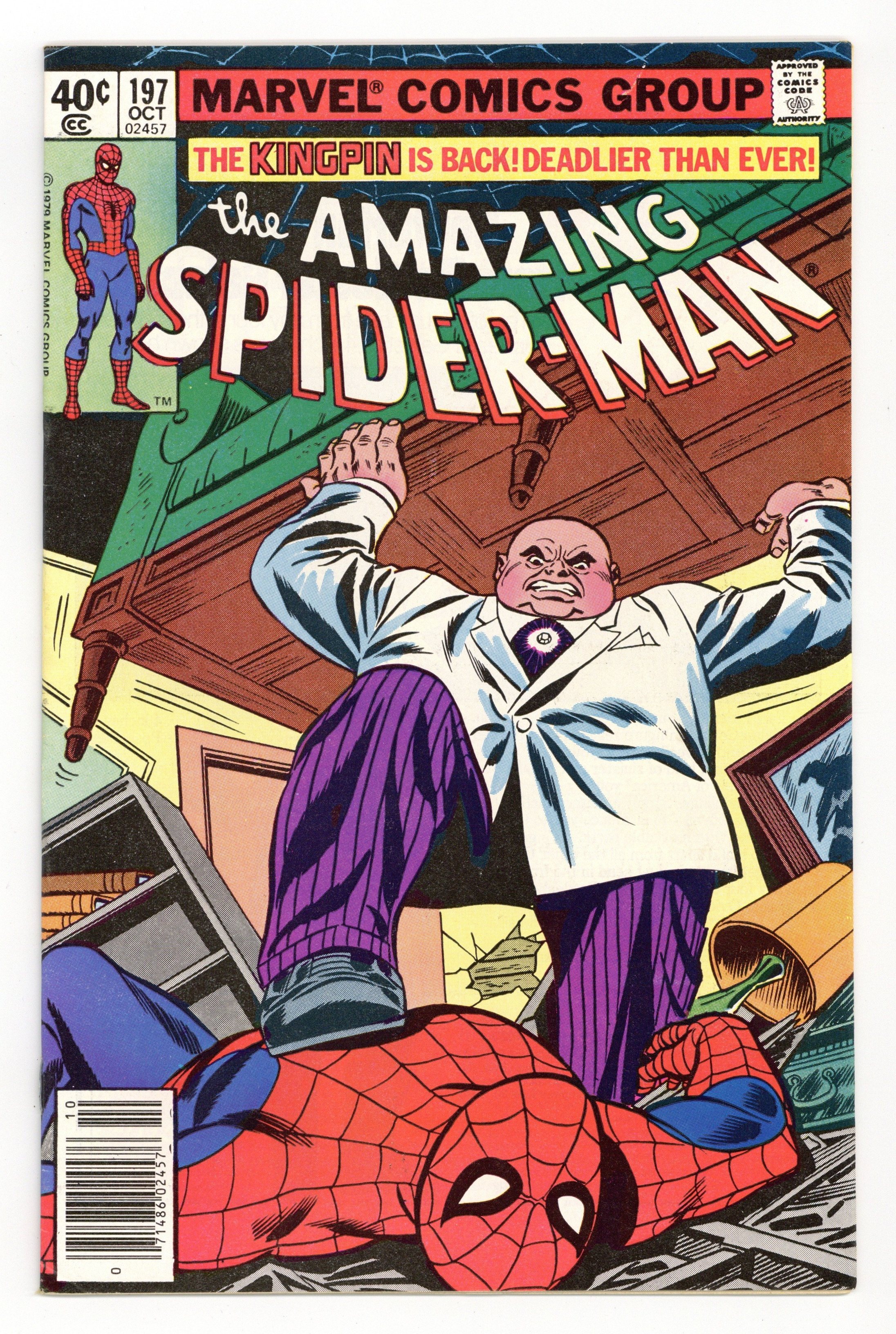 Newsstand Edition. "The Kingpin's Midnight Massacre!" Script by Marv Wolfman. Art by Keith Pollard (layouts) and Jim Mooney (finishes). Cover by Keith Pollard and Frank Giacoia. One of wall-crawler's best battle issues of the bronze age! The Amazing Spider-Man and the Kingpin of Crime fight from cover to cover and then some! To the web-slinger's chagrin, the Kingpin survived his plunge into the river (at the end of Amazing Spider-Man 164)! And now the over-sized crime boss has only one task left before retiring from his life of crime: destroy his long-time web-slinging foe! However Vanessa Fisk has told her husband to finish the job before midnight! So the Kingpin is working against a deadline, while the wall-crawler is just trying to run out the clock! An outstanding issue! Cameo appearances by Mysterio (in civilian clothes) and the burglar. (Notes: This issue marks a major turning point for the Kingpin. The popular super-villain transitions into Frank Miller's Daredevil title to become a major antagonist of the Man Without Fear beginning in Daredevil 170 & 171.) 36 pages. Cover price $0.40.
