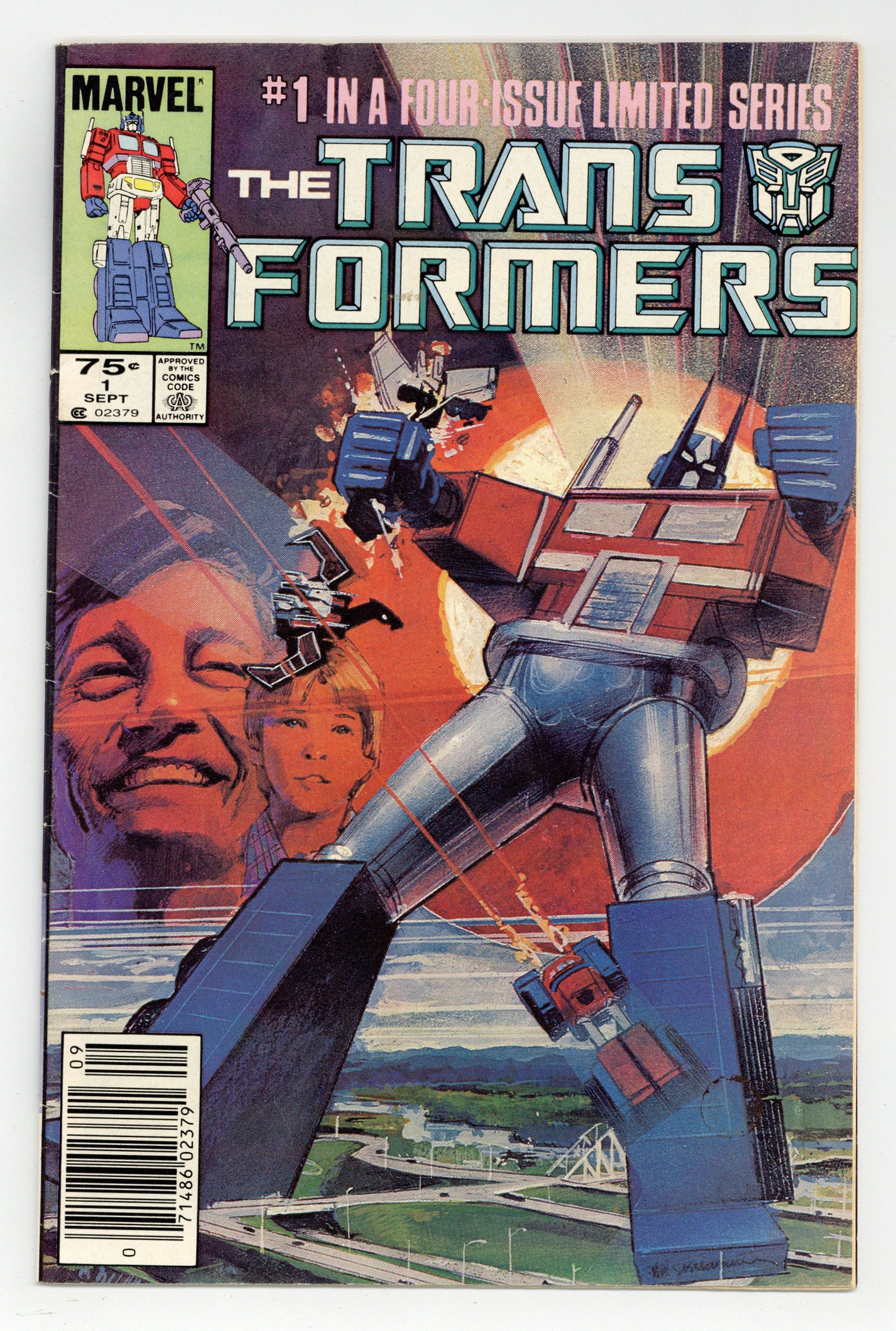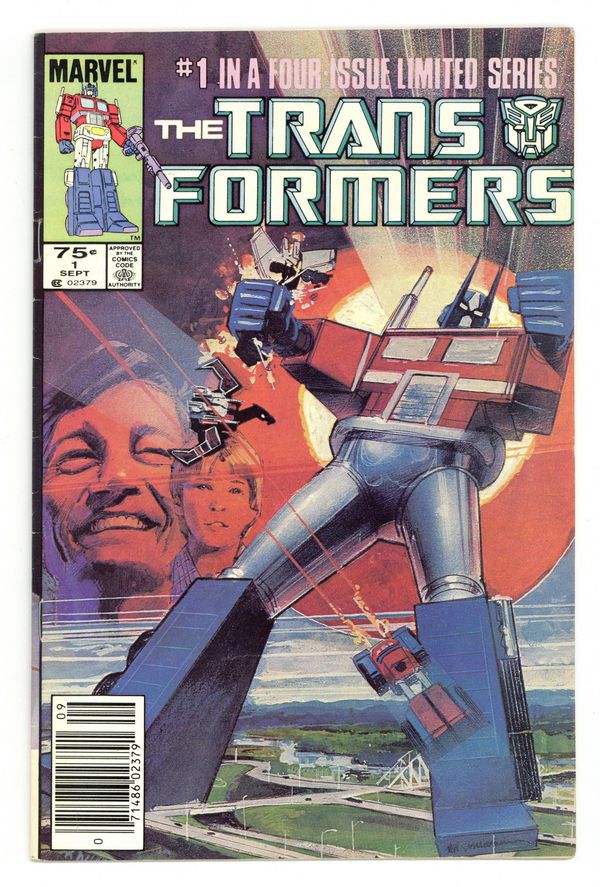 Newsstand Edition. "The Transformers!" Part 1 of 4. Story by Bill Mantlo and Ralph Macchio. Pencils by Frank Springer. Inks by Kim DeMulder. Cover by Bill Sienkiewicz. Based on the extremely popular toyline and cartoon from the early eighties. For centuries, deep in space, on the techno-organic planet of Cybertron, a war has raged. This battle between the benevolent and peace loving Autobots, led by the heroic Optimus Prime, and the malevolent militaristic Decepticons, led by the dangerous Megatron, has now spilled over to the planet Earth. These Robots in Disguise will continue their eternal struggle and mankind is now caught in the middle. NOTE: This series was originally intended to be a four issue limited series. This is a first printing. All 2nd or 3rd printings have a 2nd, 3rd printing notice on inside at bottom of indicia on first/splash page. 2nd printings were done for most issues from #1 to #9. Cover price $0.75.