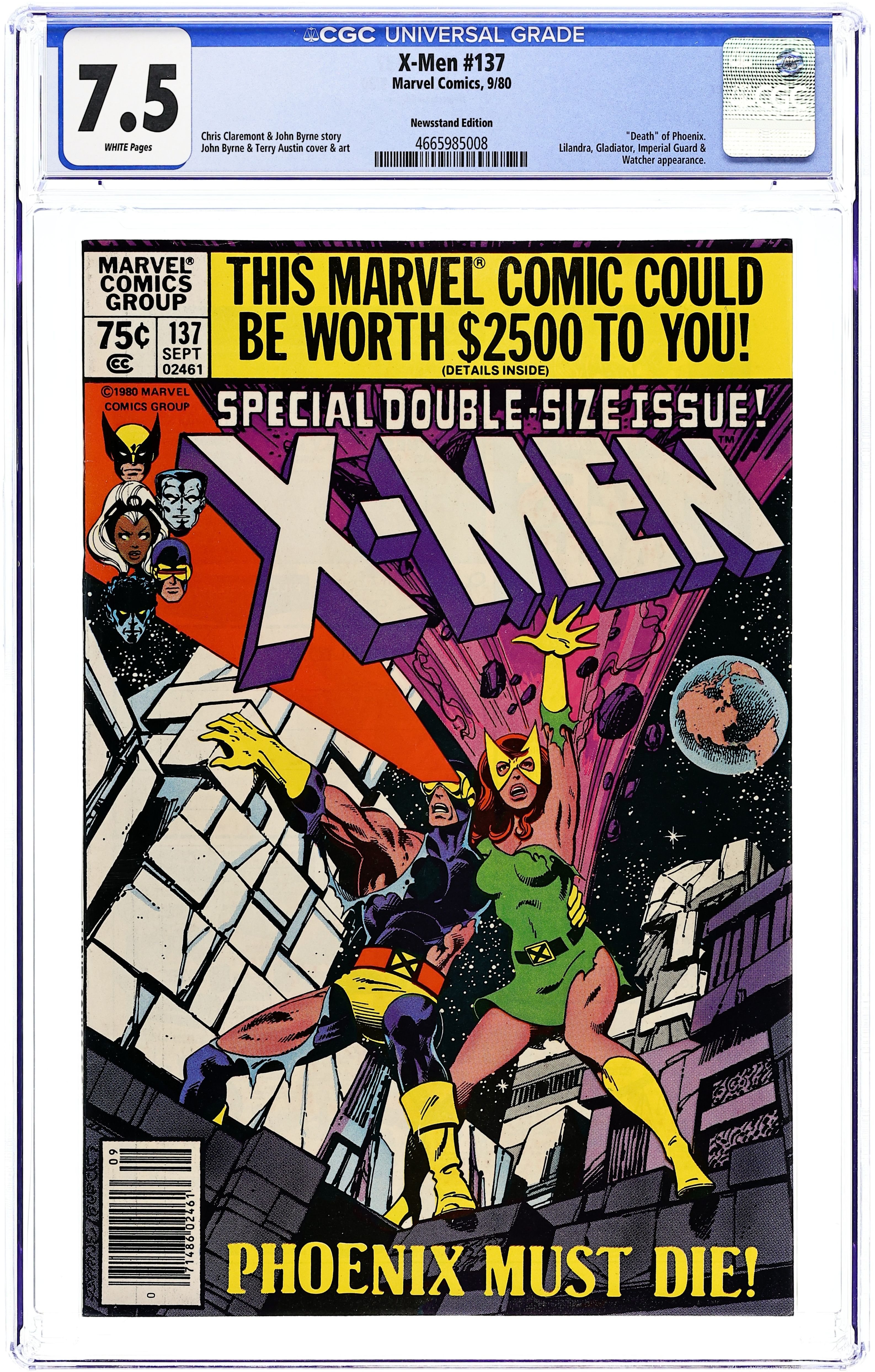 Newsstand Edition. The Dark Phoenix Saga: Part 9 of 9 - "The Fate of Phoenix!" Guest-starring the Watcher. Story by Chris Claremont and John Byrne. Art by John Byrne and Terry Austin. The persona of the Dark Phoenix has subsided, but for how long? The Shi'ar Empire doesn't plan to wait and find out. While as Dark Phoenix, Jean murdered untold billions, and the alien empire plans to see her pay for her crimes. Now, the X-Men must battle the Shi'ar Imperial Guard in a dual to decide the fate of Jean Grey. Don't miss the stunning conclusion to the greatest X-Men saga of all time!