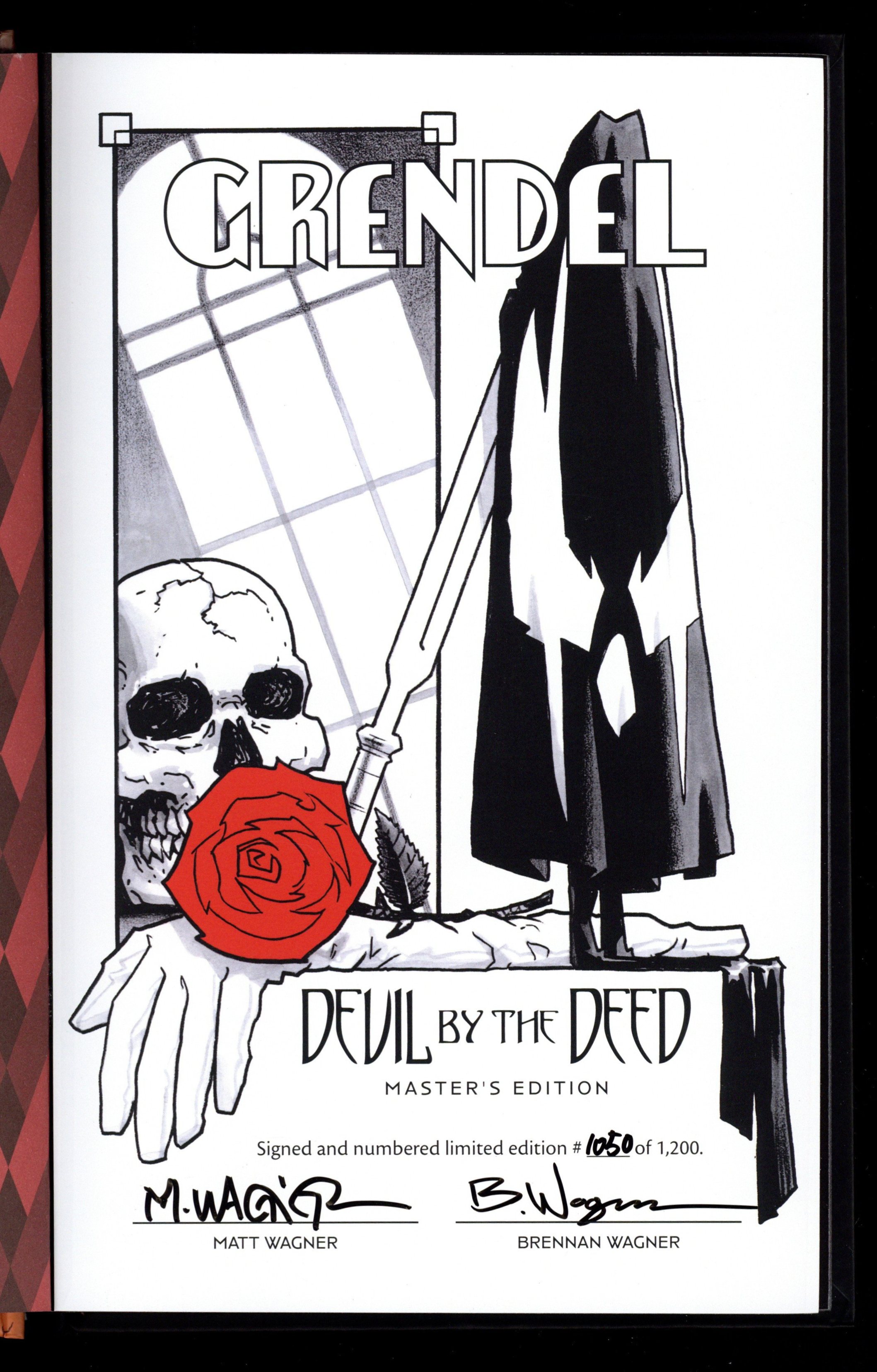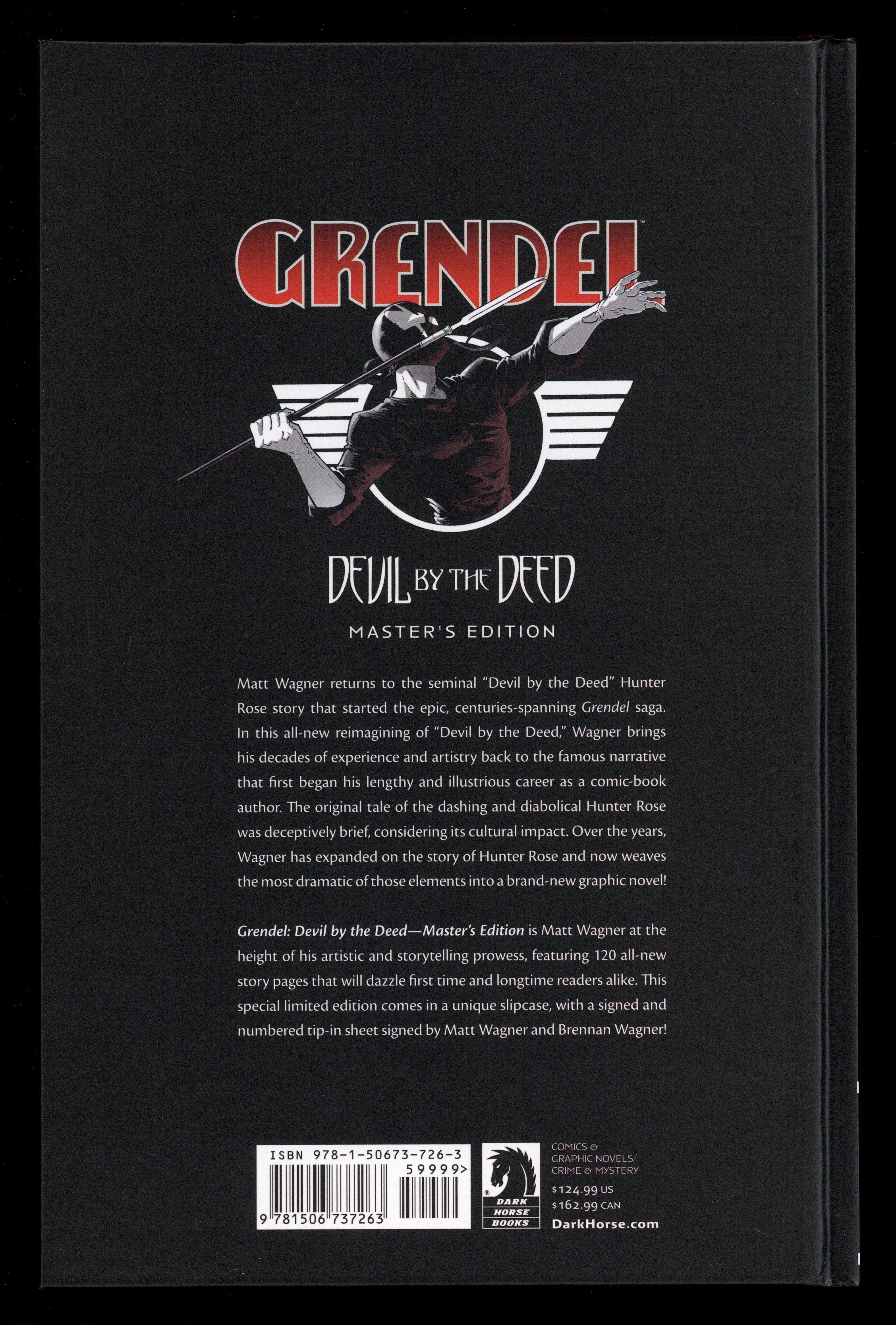 1st printing. Collects Grendel backup stories from Mage: The Hero Discovered (1985) #6-14. Story and art by Matt Wagner. Matt Wagner returns to the seminal "Devil by the Deed" Hunter Rose story that started the epic, centuries-spanning Grendel saga. In this all-new reimagining of "Devil by the Deed," Wagner brings his decades of experience and artistry back to the famous narrative that first began his lengthy and illustrious career as a comic-book author. The original tale of the dashing and diabolical Hunter Rose was deceptively brief, considering its cultural impact. Over the years, Wagner has expanded on the story of Hunter Rose and now he weaves the most dramatic of those elements into a brand-new graphic novel. GRENDEL DEVIL BY DEED - Master's Edition is Matt Wagner at the height of his artistic and story-telling prowess, featuring 120 all-new story pages that will dazzle first time and longtime readers alike. Hardcover, 136 pages, B&W (and Red). Cover price $124.99.
