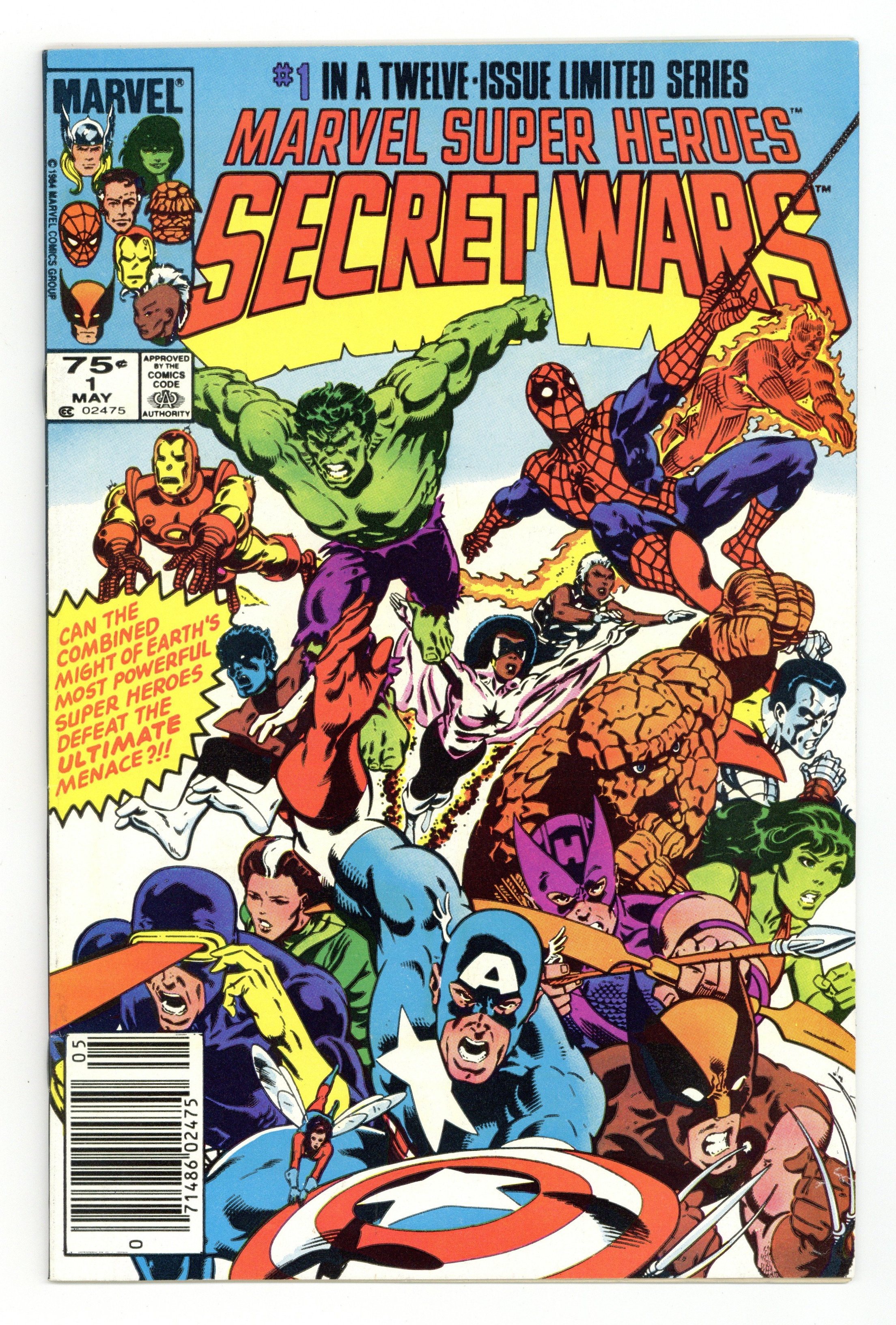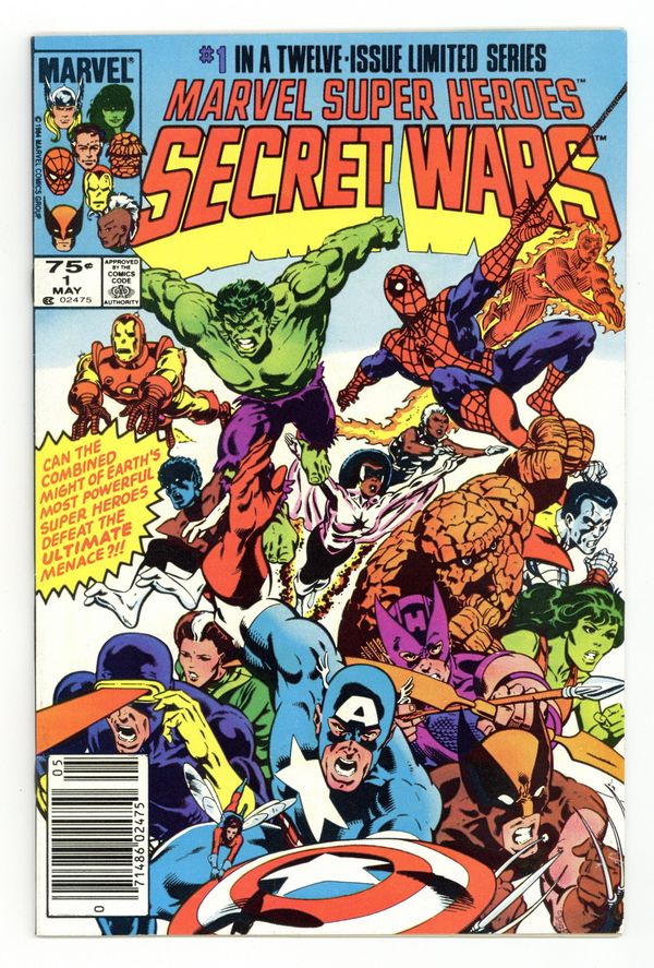 Newsstand Edition. "The War Begins!" Part 1 of 12. Story by Jim Shooter. Art by Mike Zeck and John Beatty. This is it, the granddaddy of all epic events. Before Identity Crisis, Infinite Crisis, House of M, Civil War, and Infinity Gauntlet there was Secret Wars. A nigh omnipotent being from beyond has, for lack of a better word, kidnapped the greatest heroes and deadliest villains in the Marvel Universe and whisked them to the far side of the universe to battle for the ultimate prize. One thing is for certain, the lives of these heroes and villains will never be the same again. - This is the first printing. Any 2nd printing will have the words "Second Printing" at the bottom of the first page. NOTE: Nearly all first printings contain a "Blue Galactus" from a printing error (a lack of magenta printing plates) that was corrected in later printings. While small number of First printings may have the correct colors, the majority of copies will have "Blue Galactus". Due to the frequency, "Blue Galactus" variants should be treated the same as other First Printings. 36 pages, full color. Cover price $0.75.