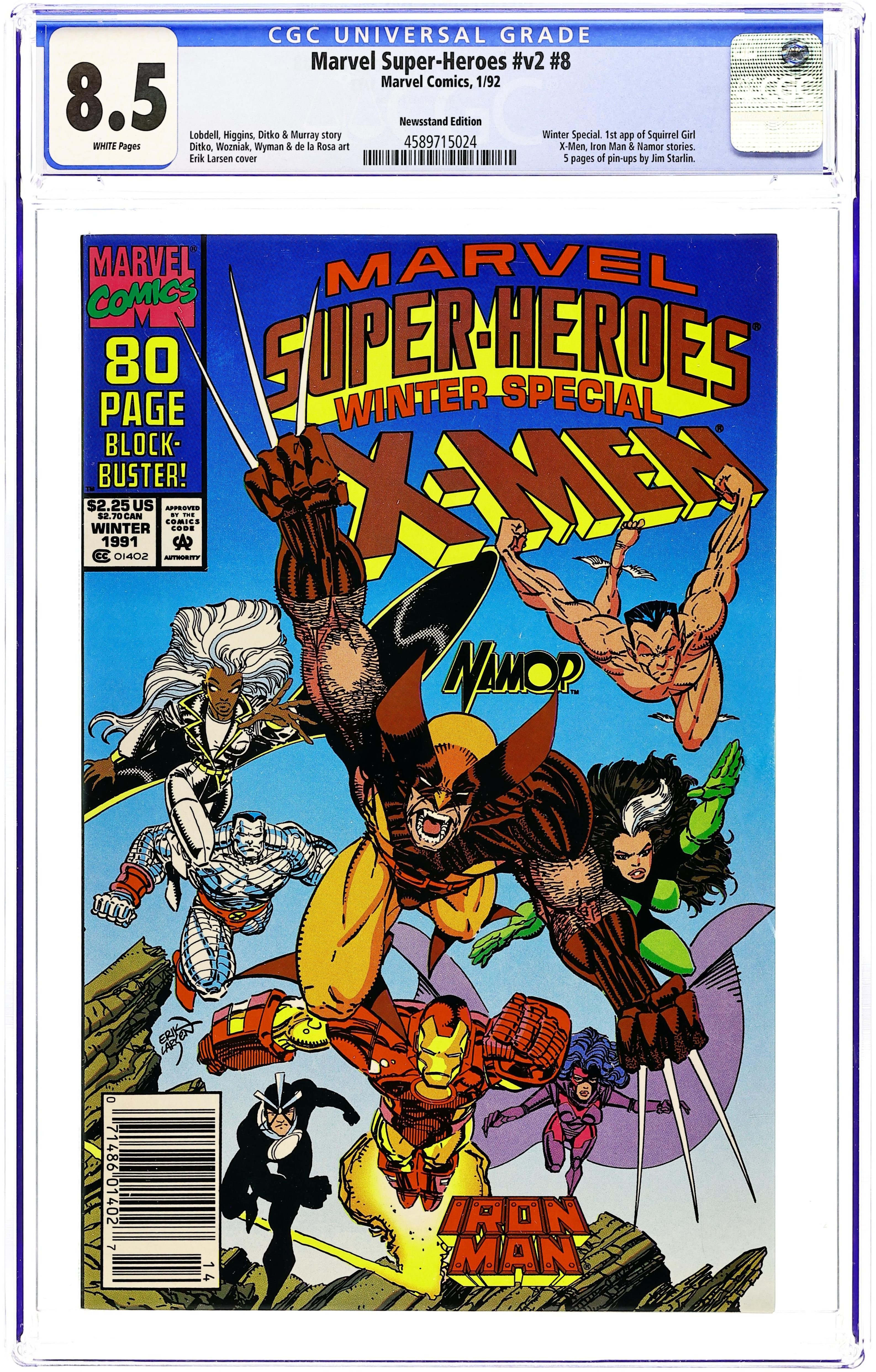 Newsstand Edition. 1st appearance of Squirrel Girl - "Three Strikes, Yer Out!" Part 3 of 3. Guest-starring the X-Men. Script by Michael Higgins. Pencils by M.C. Wyman. Inks by Sam de la Rosa. Cover by Erik Larsen. The Uncanny X-Men aren't quite finished with the Sentinels...as Cynthia Chalmers transfers her consciousness into an old Mark II version and attacks one more time! In the land down under, can the children of the atom finally end the twisted legacy of the Chalmers family? Cameo appearances by Gateway and the Abomination. X-Men Lineup: Colossus, Havok, Psylocke, Rogue, Storm, and Wolverine. Second story: "Leftovers!" Guest-starring the Sub-Mariner. Script by Scott Lobdell. Pencils by Chris Wozniak and Michael Lopez. Inks by Jeff Albrecht. Prince Namor visits the submerged former kingdom of the Bird People after discovering one of Oracle Inc's research platforms in disarray! Once inside the undersea citadel, the Avenging Son makes another discovery: Diablo! Wow, what does the Master of Alchemy want with the submerged Sky Isle? He's trying to steal the Bird People's technology that once controlled the Earth's ozone layer! However the Prince of Atlantis won't stand for that! With help from an unlikely ally, the Sub-Mariner duels with Diablo in the ocean depths! First appearance of Dania, the daughter of Red Raven. Flashback cameo by Red Raven to recap the events of Sub-Mariner (1st series) 26. Third story: "The Coming of...Squirrel Girl!" Guest-starring Iron Man. Plot by Steve Ditko. Script by Will Murray. Art by Steve Ditko. It's the debut of a new superhero: Squirrel Girl! And her first super-villain to battle is none other than Victor Von Doom! Fortunately though, she has the golden avenger and a horde of squirrels by her side! A fun tale! First appearance of Squirrel Girl. (Note: Squirrel Girl returns many years later in the Great Lakes Avengers (2005) Limited Series.) Fourth feature: Various Pin-ups by Jim Starlin featuring Adam Warlock, Sasquatch, the Thing, Hulk, Beast, Doctor Strange, Spider-Man, and Wolverine. 80 pages. Cover price $2.25.