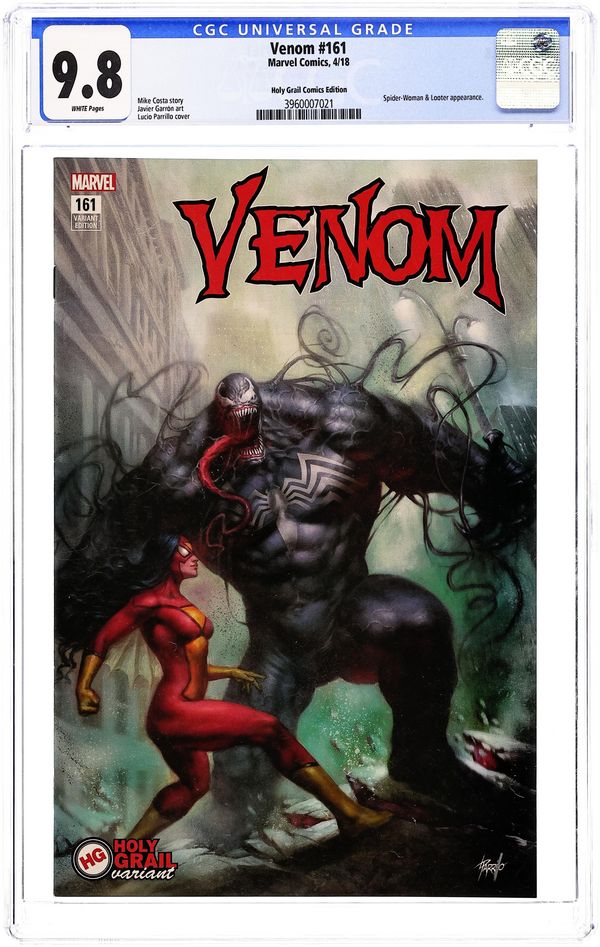 Holy Grail Comics exclusive variant Cover by Lucio Parrillo. TANGLED WEBS Part 1 - Written by Mike Costa. Art by Javi Garron. Cured of the metabolic disorder affecting the symbiote's mental state, Venom is back to acting like his old Lethally Protecting self. But battling your way through New York City doesn't go unpunished, and Eddie and the symbiote are about to discover that the hard way… ...when the wall-crawling super-sleuth SPIDER-WOMAN kicks in their door! 28 pages, full color. Rated T+