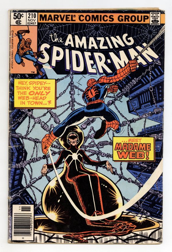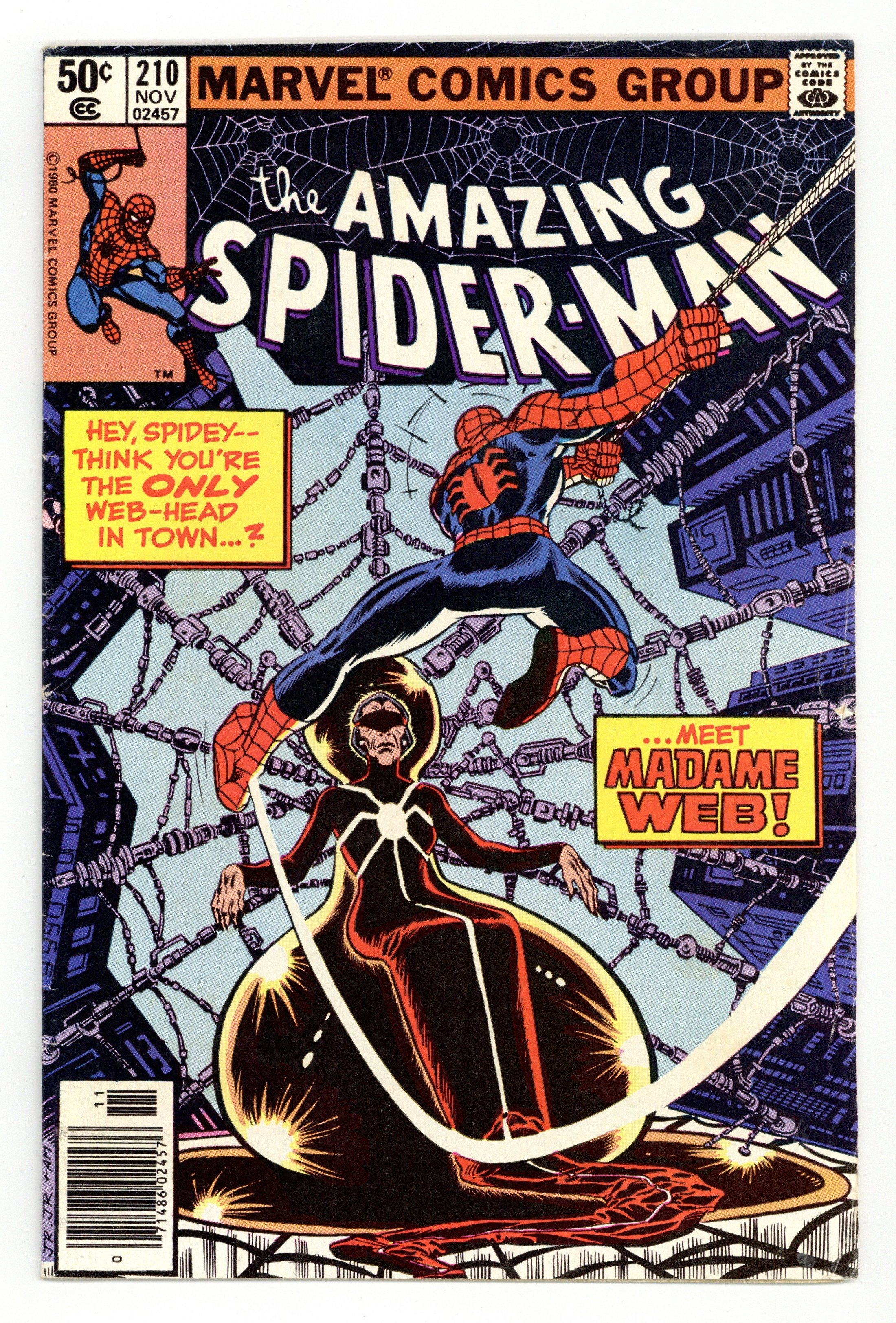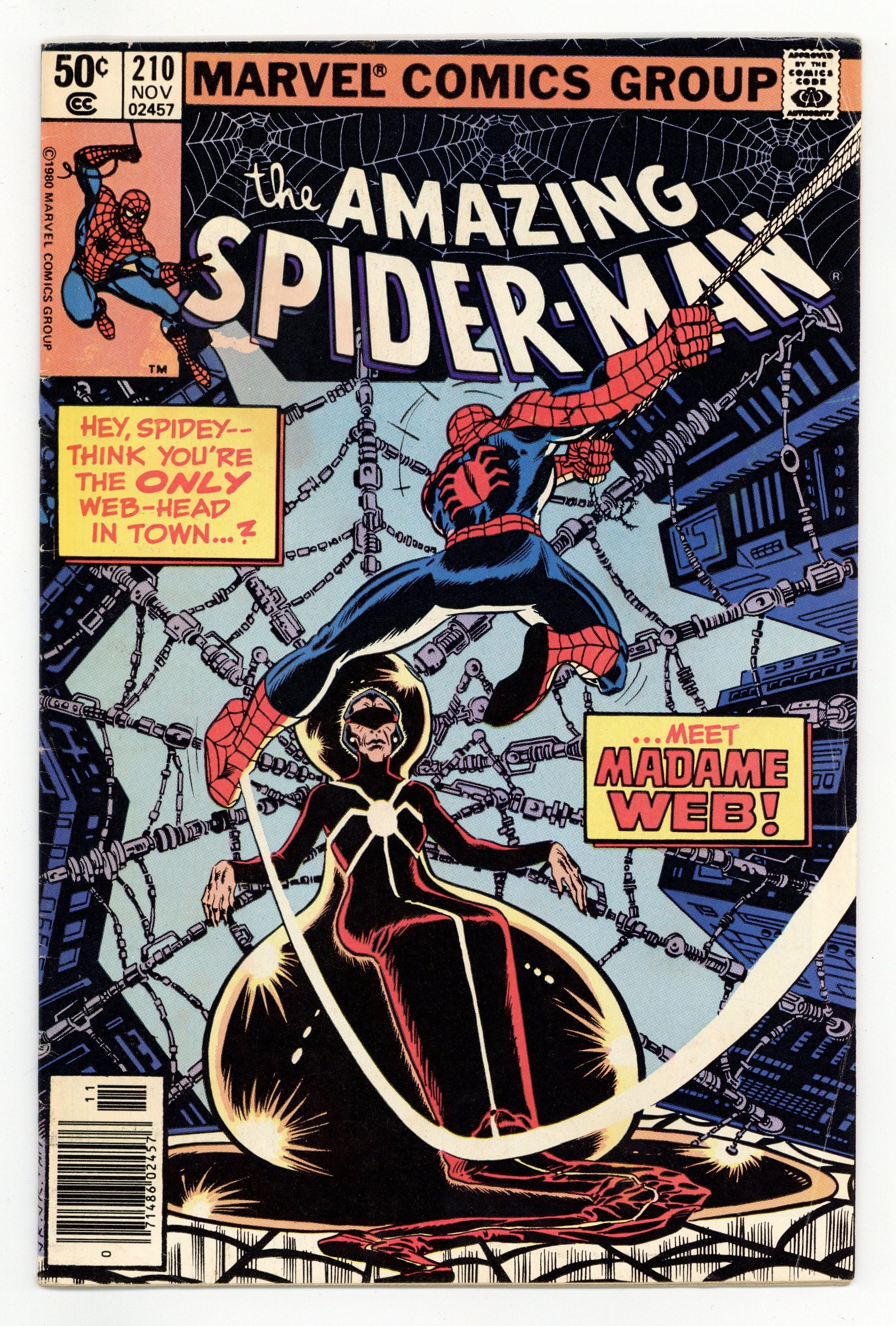 Newsstand Edition. "The Prophecy of Madame Web!" First appearance of Madame Web. Script by Denny O'Neil. Art by John Romita Jr. (breakdowns) and Joe Sinnott (finishes). Cover by John Romita Jr. and Al Milgrom. Masked gunmen barge into the board room of the Daily Globe and kidnap its publisher K.J. Clayton! Fortunately though, the web-slinger is nearby and gives chase! The wall-crawler doesn't catch the criminals, but he does catch a clue! A mysterious clairvoyant called Madame Web is somehow connected to the victim! After befriending the aging soothsayer and heeding her advice, Spider-Man rushes off to the rescue! Can the web-slinger find the missing publisher and get the Daily Globe back in circulation? Cameo appearance by J. Jonah Jameson. (Notes: Peter Parker ends his employment with the Daily Globe. Madame Web appears next in Amazing Spider-Man 216. John Romita Jr. begins his three-and-a-half year run as the penciler of the Amazing Spider-Man title.) 36 pages, full color. Cover price $0.50.