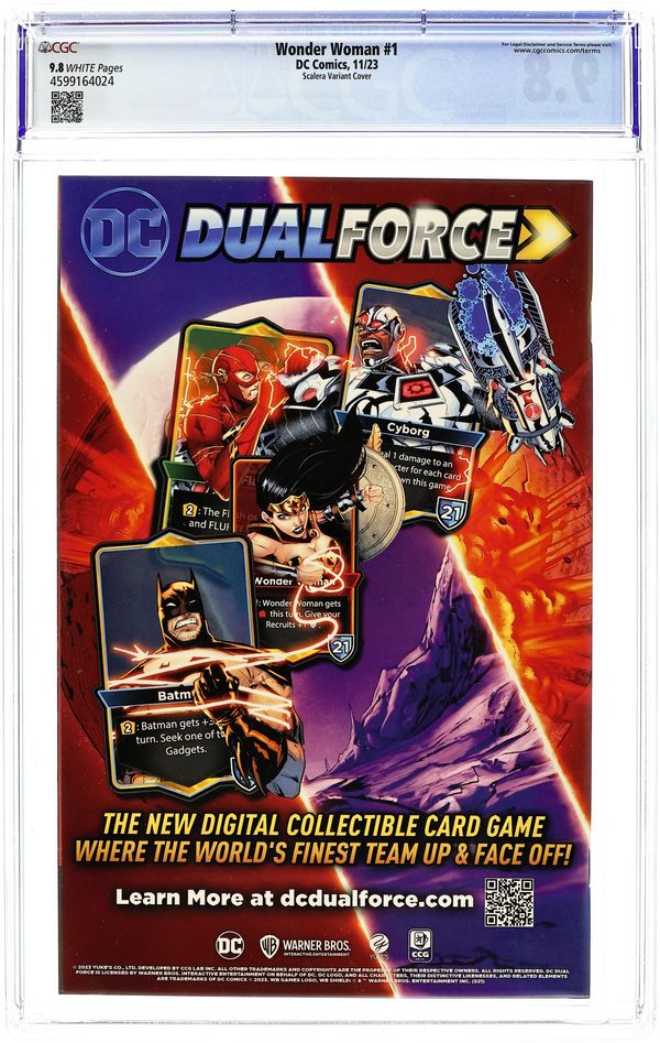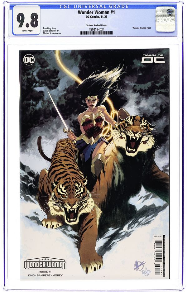 Limited 1 for 25 Retailer Incentive Variant Cover. Written by Tom King. Art by Daniel Sampere. Cover by Matteo Scalera. THE AMAZON WARRIOR IS NOW A WANTED OUTLAW! A NEW ERA FOR THE AMAZON WARRIOR BEGINS, FROM THE SUPERSTAR TEAM OF TOM KING AND DANIEL SAMPERE! After a mysterious Amazonian is accused of mass murder, Congress passes the Amazon Safety Act, barring all Amazons from U.S. soil. To carry out their plans, the government starts a task force, the Amazon Extradition Entity (A.X.E.), to remove those who don't comply, by any means necessary. Now, in her search for the truth behind the killing, Wonder Woman finds herself an outlaw in the world she once swore to protect! Writer Tom King (Batman, Mister Miracle, Supergirl: Woman of Tomorrow) and superstar artist in the making Daniel Sampere (Dark Crisis, Action Comics) join forces for this action-packed relaunch and the beginning of what will undoubtedly become a groundbreaking run on the character. 40 pages, full color. Rated T+ Cover price $5.99.